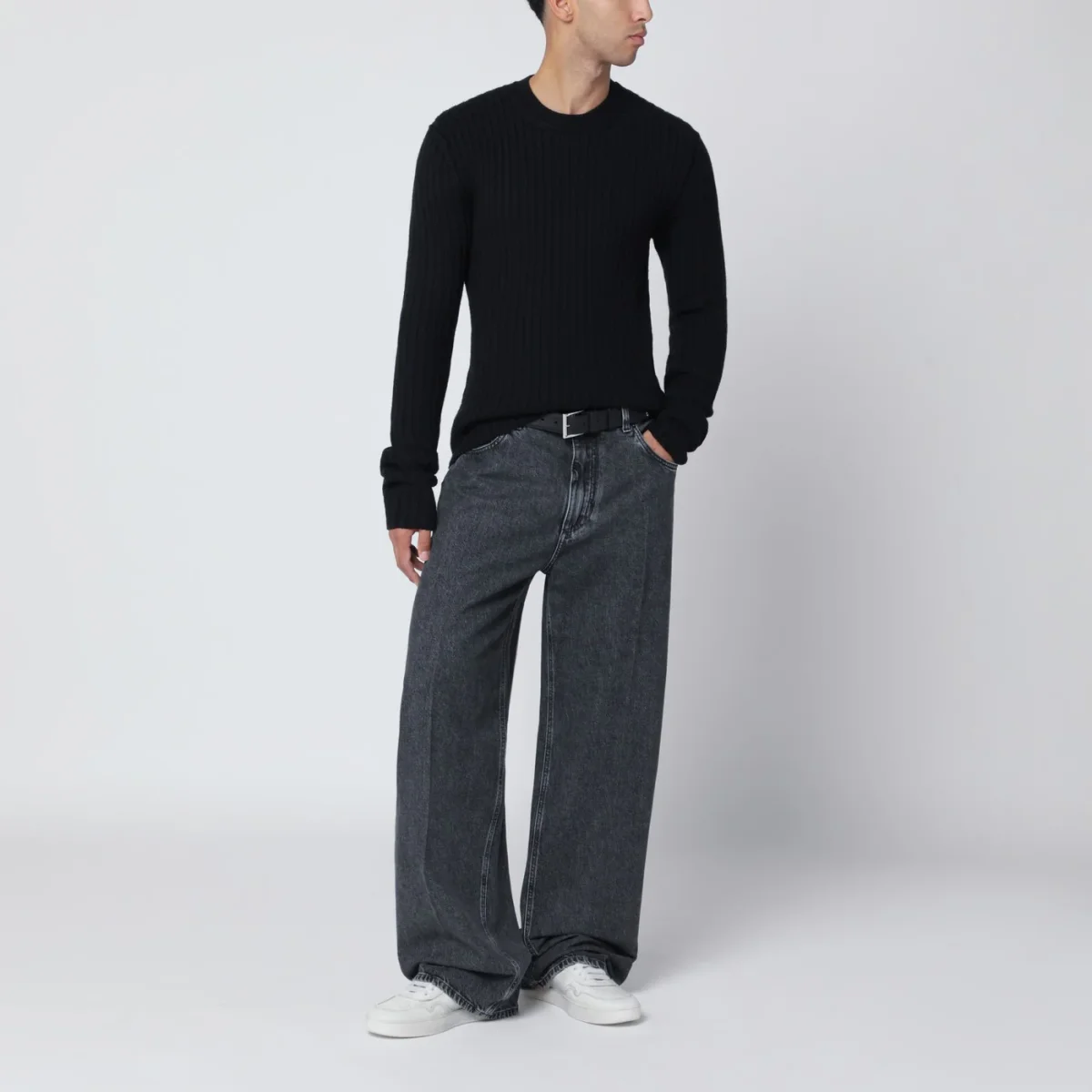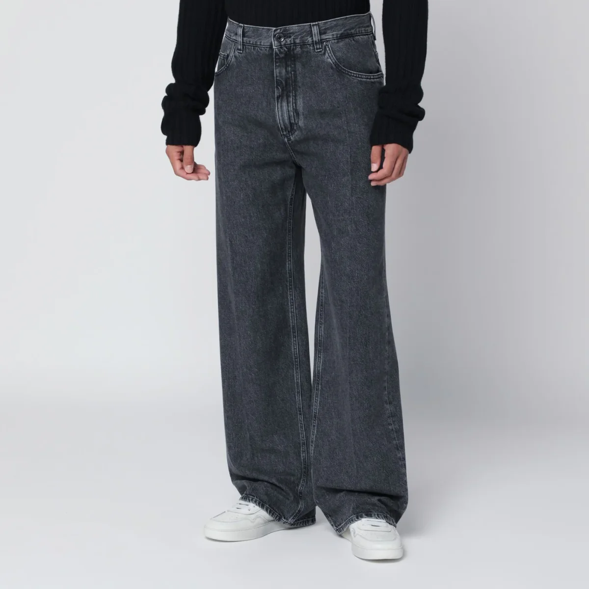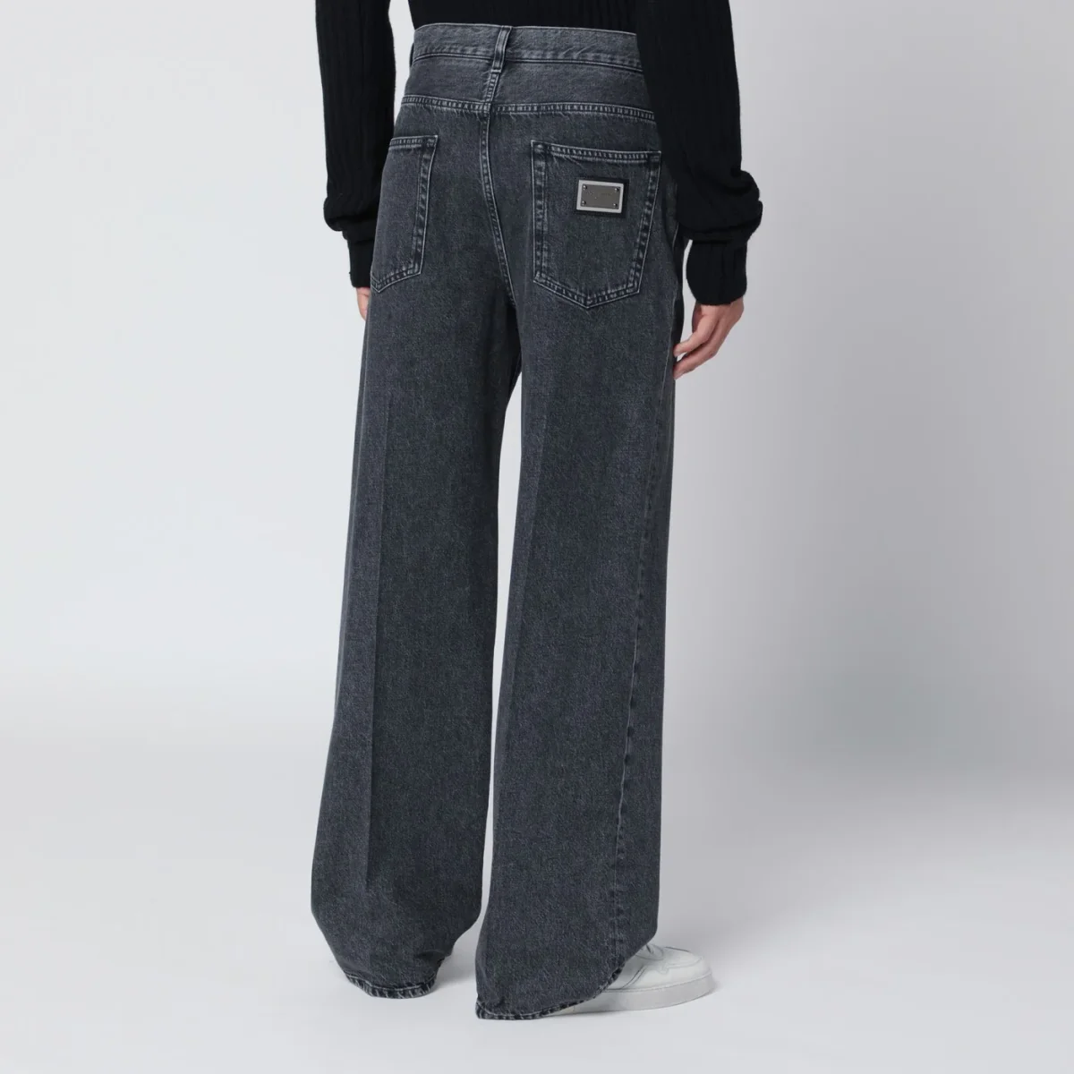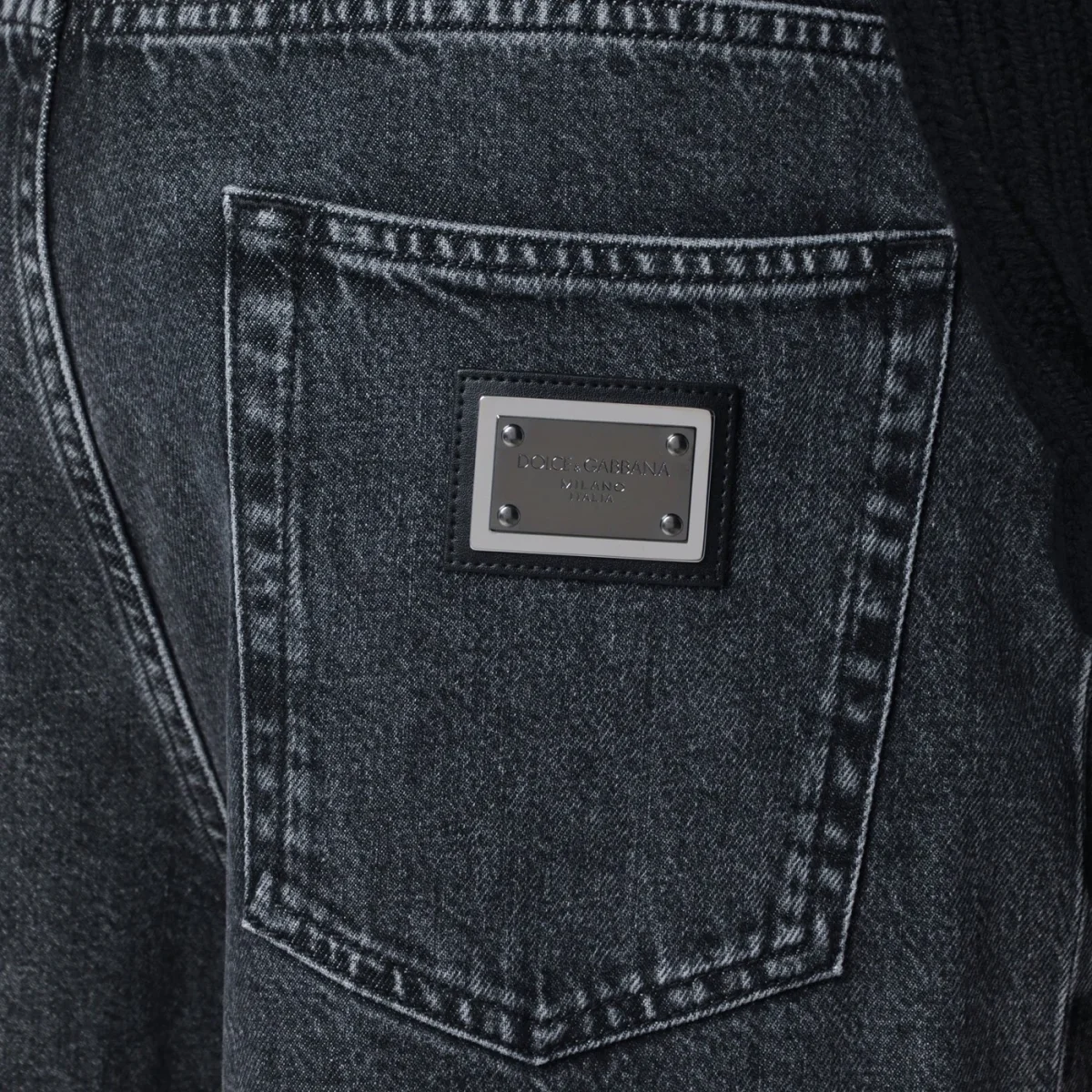 Jeans di Dolce & Gabbana in denim di cotone nero effetto slavato, caratterizzato da chiusura frontale con zip e bottone, passanti in vita, piccolo patch con logo lettering sul davanti, cinque tasche classiche, targhetta metallica logata sul retro, piega stirata sul davanti e vestibilità over.