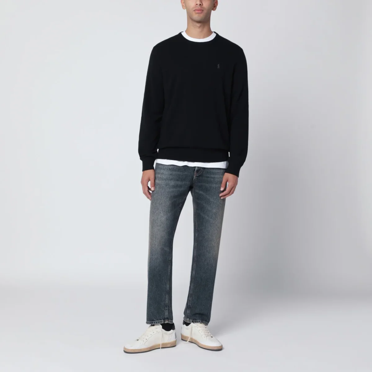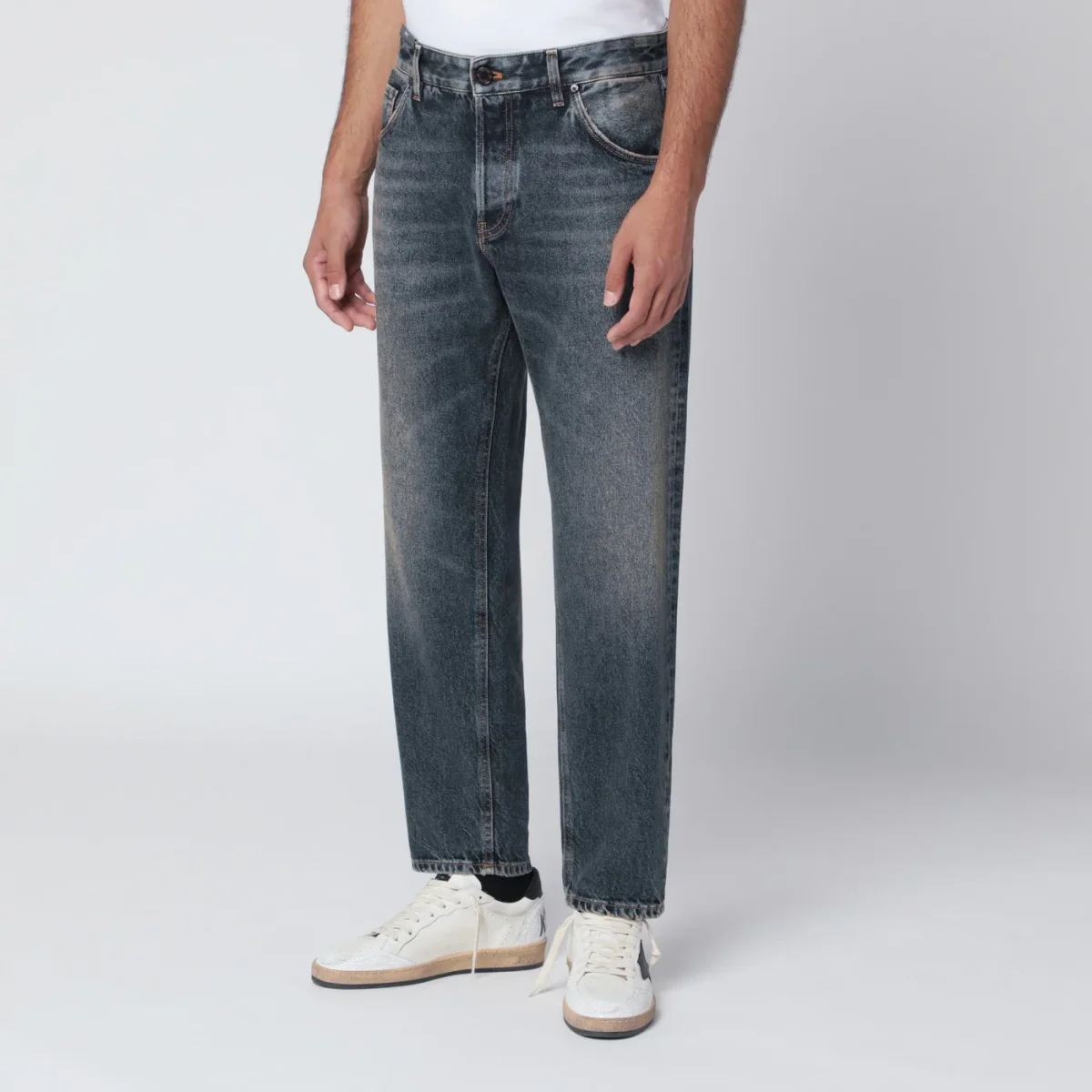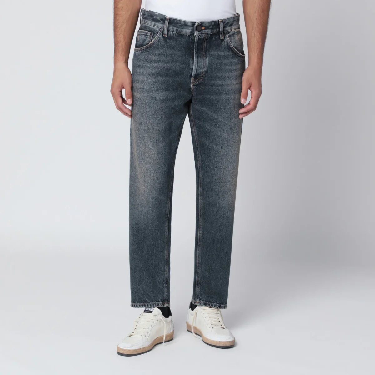 Jeans di PT Torino in denim di cotone effetto slavato, caratterizzato da chiusura frontale con zip e bottone, passanti in vita, cinque tasche classiche e patch logo posteriore.