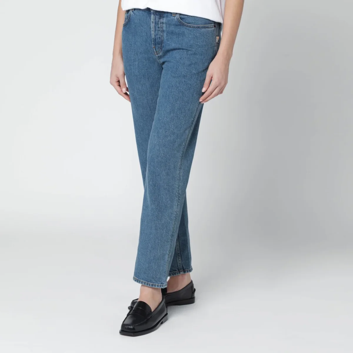 Jeans di Burberry in denim di cotone blu medio, caratterizzato da chiusura frontale con zip e bottone, passanti in vita, cinque tasche classiche e patch logo posteriore.