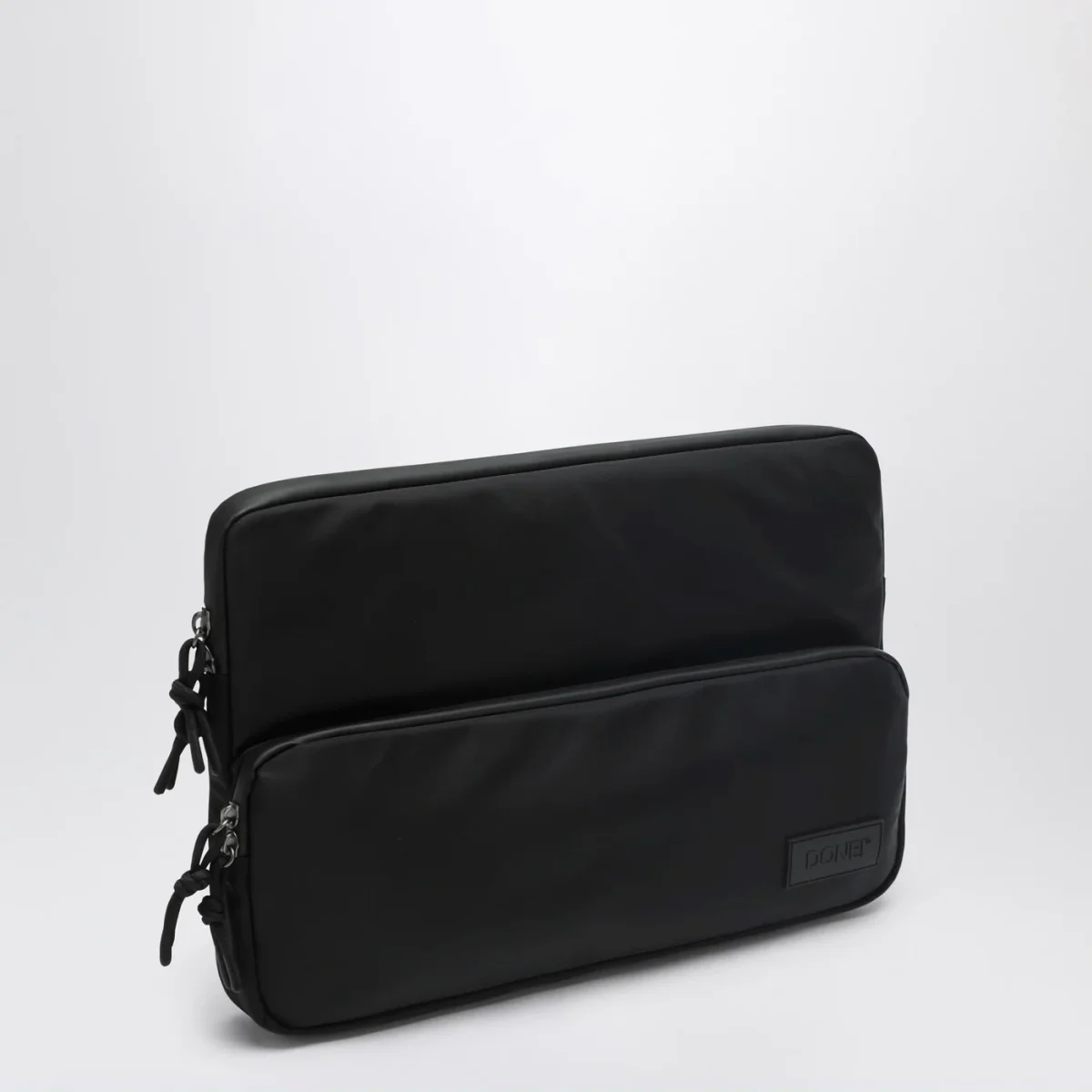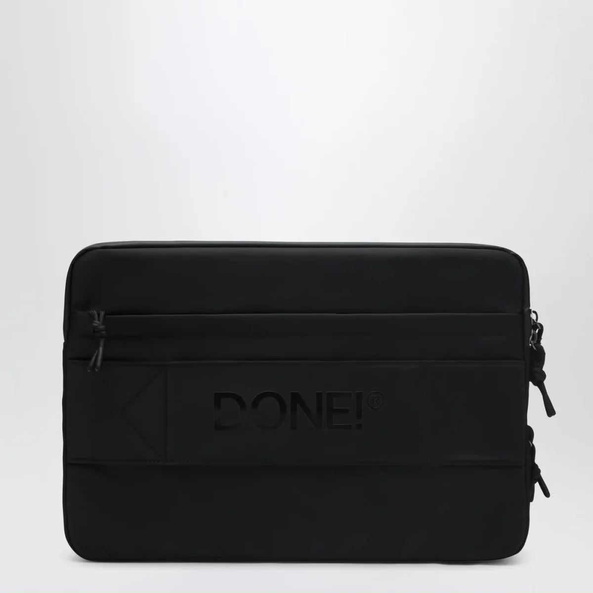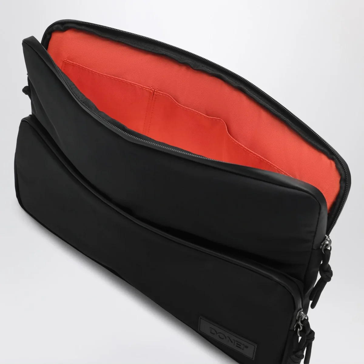 Laptop case di DONE! in nylon nera, caratterizzata da chiusura superiore con cerniera rivestita impermeabile, scomparto principale con tasche porta oggetti, tasca frontale con cerniera rivestita impermeabile e tasche interne porta oggetti, tasca posteriore con cerniera rivestita impermeabile, tasca principale compatibile con PC fino a 17″, fascia per trasporto a mano, fodera interna in nylon arancione per garantire maggior visibilità e fascia compatibile con trolley.