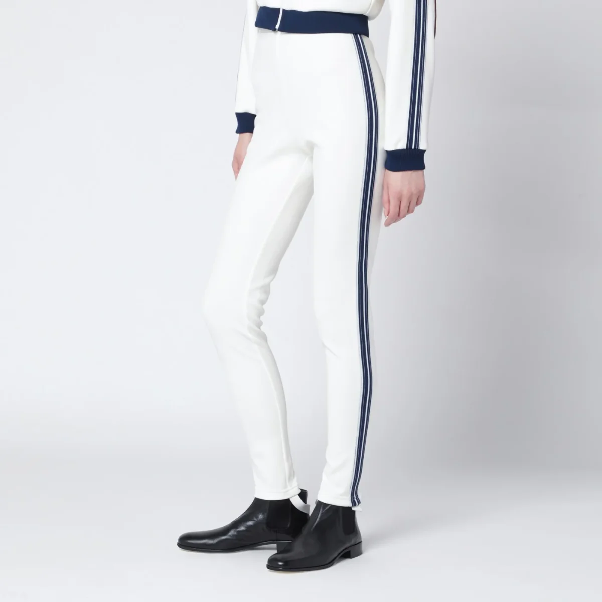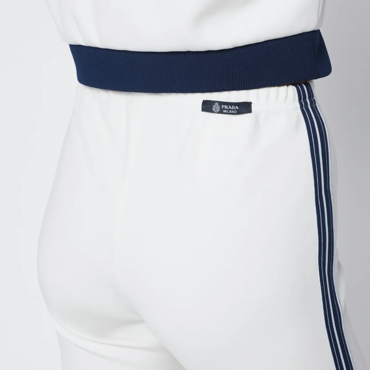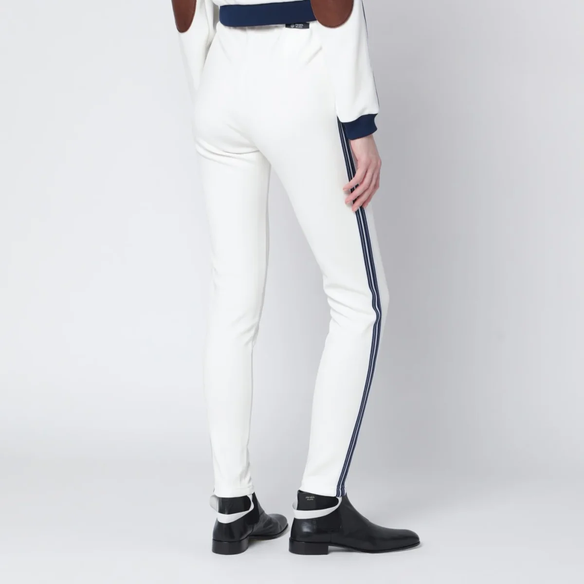 Leggings di Prada in tessuto tecnico avorio• vestibilità aderente• vita elasticizzata• etichetta sartoriale con logo lettering sul retro• staffa elastica sul fondo• banda in maglia a righe sui fianchi