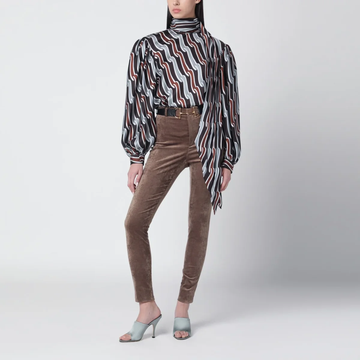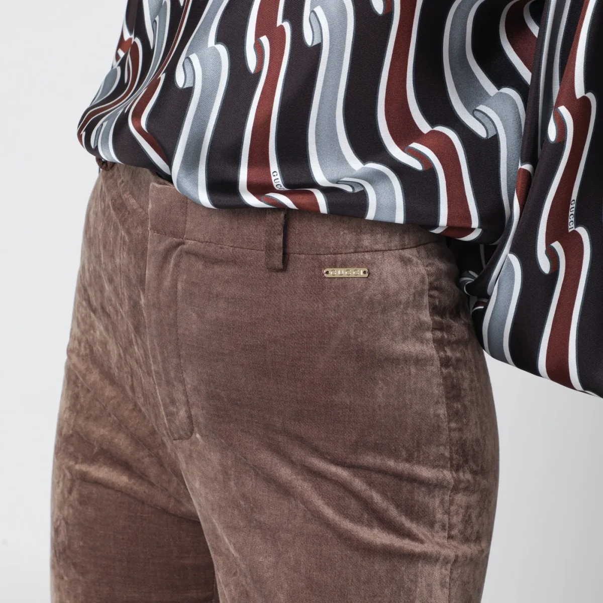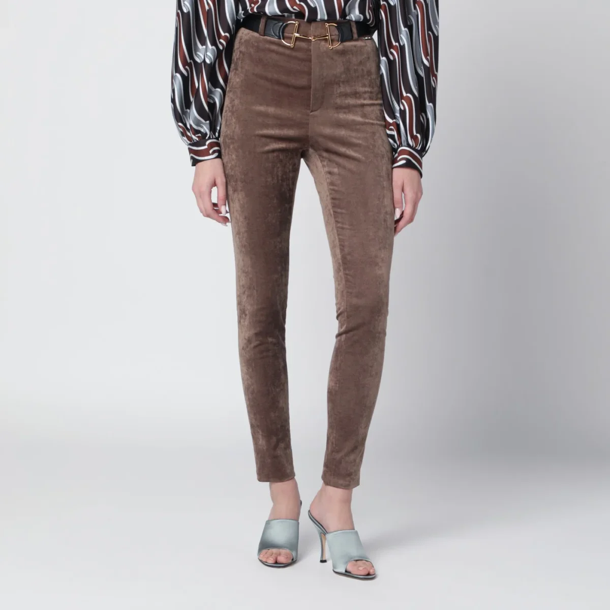 Leggings di Gucci in velluto stretch marrone• passanti per cintura• chiusura con zip frontale