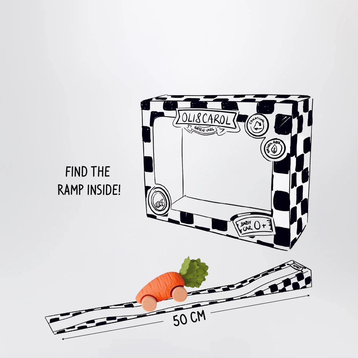 Macchinina giocattolo a forma di carota di Oli&Carol in gomma naturale e legno certificato FSC• Colore: Arancione/Verde• Una rampa a scomparsa inclusa• Ricco di texture per il gioco sensoriale e morbido al tatto