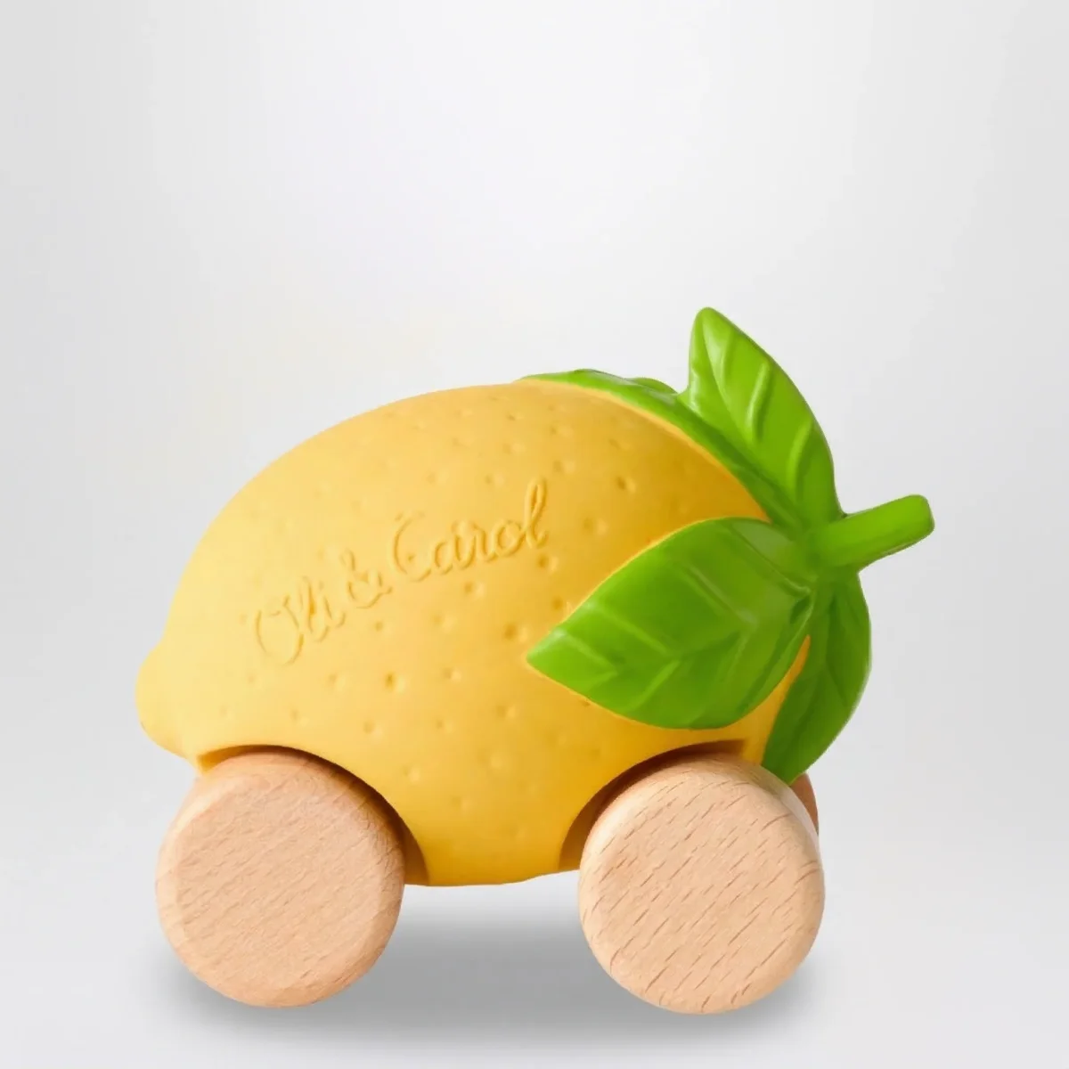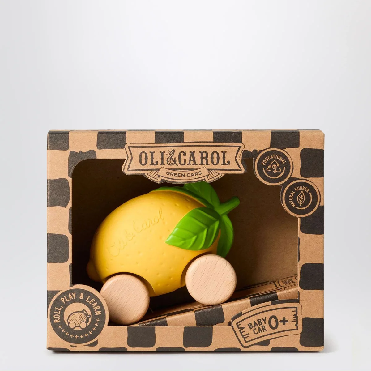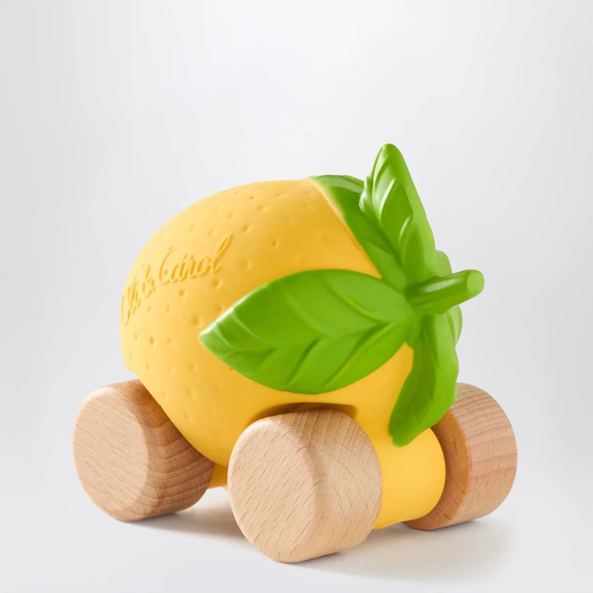 Macchinina giocattolo a forma di limone di Oli&Carol in gomma naturale e legno certificato FSC
