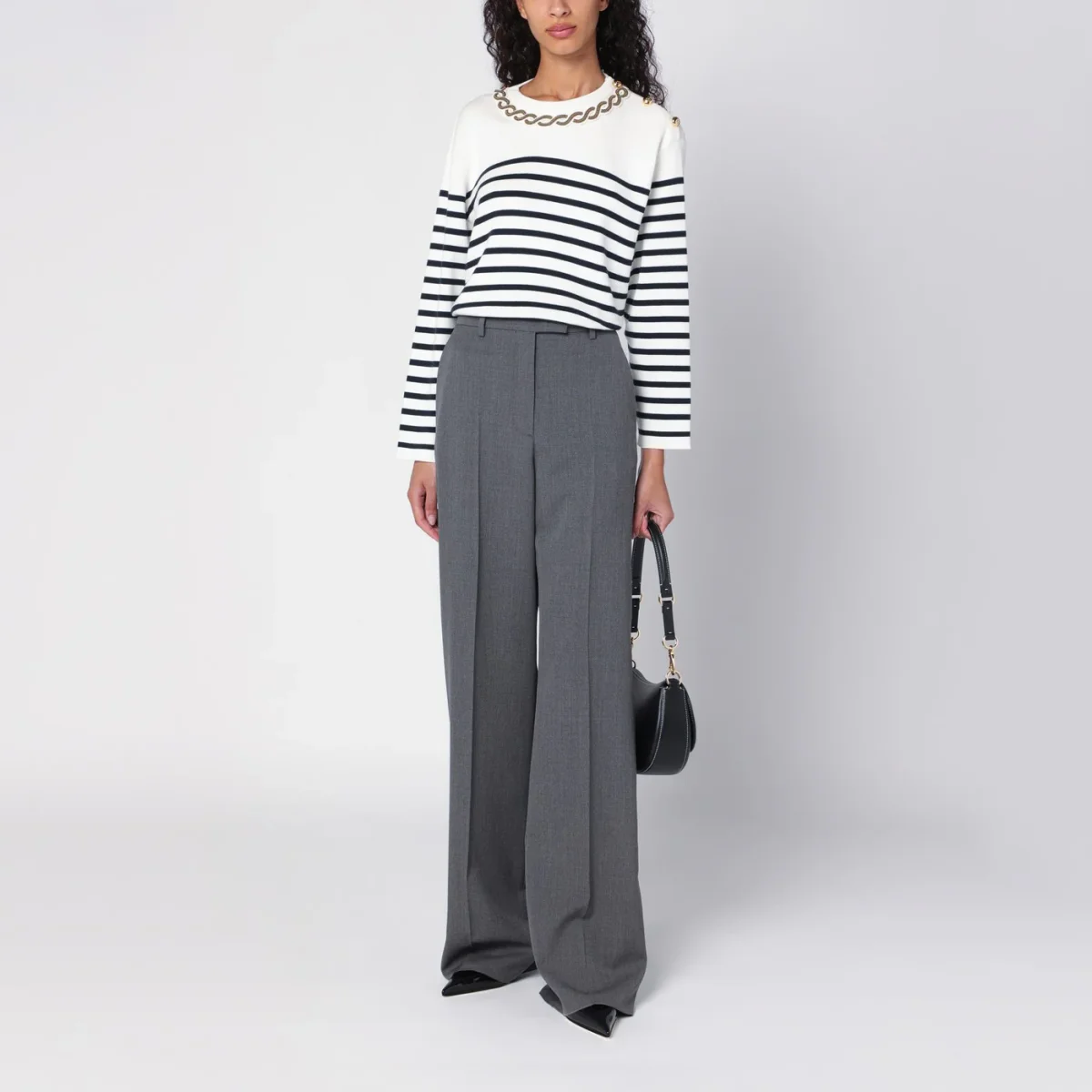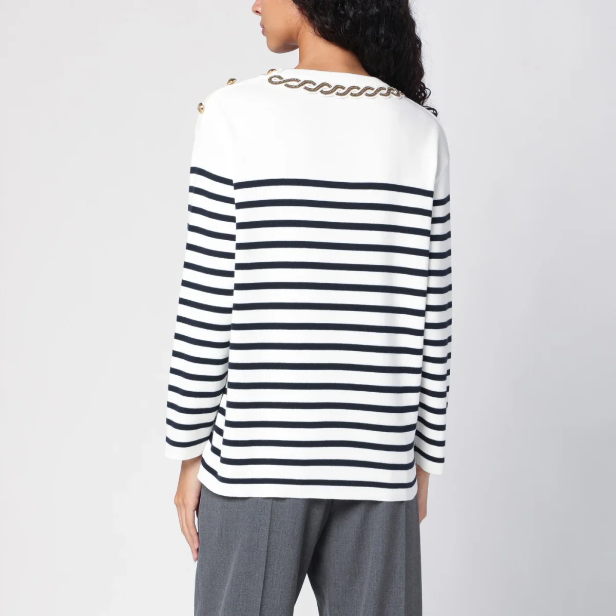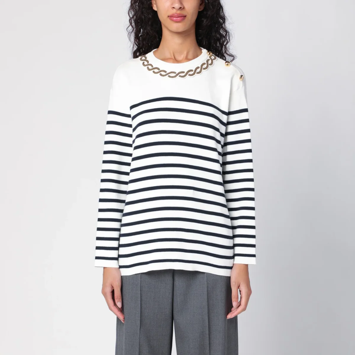 Maglia di Valentino in cotone avorio a righe blu navy, caratterizzata da girocollo con ricamo a treccia, bottoni dorati sulla spalla, manica lunga e orlo dritto.