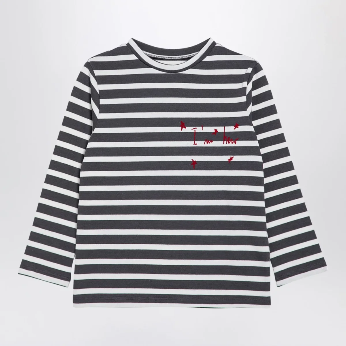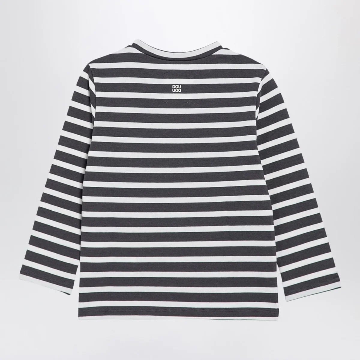 Maglia girocollo di Douuod in cotone a righe grigia e bianca, caratterizzata da manica lunga, ricamo sul petto e orlo dritto.