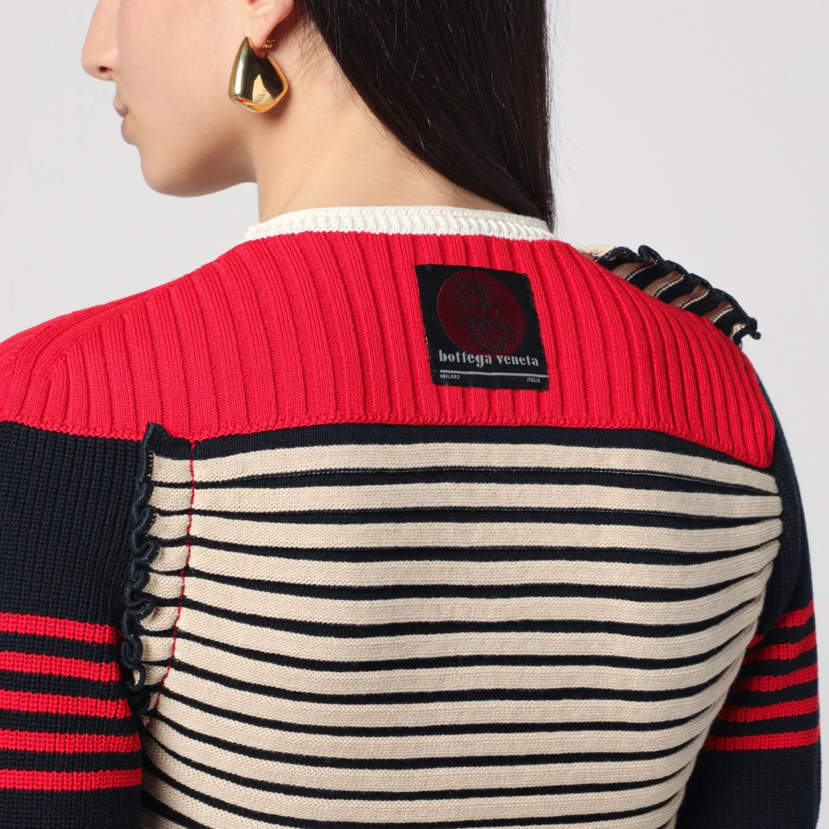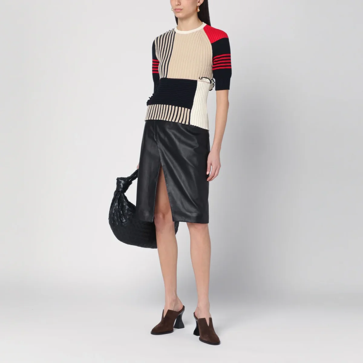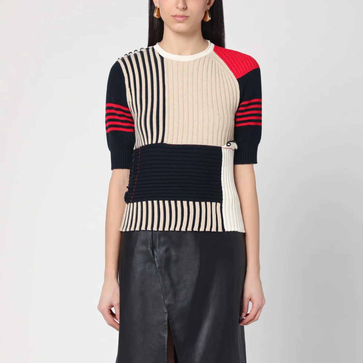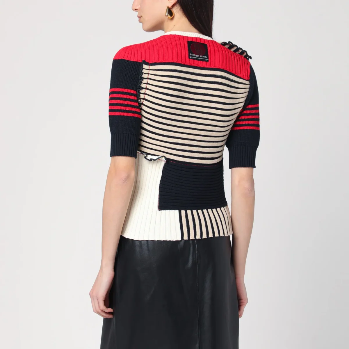 Maglia girocollo di Bottega Veneta in cotone a righe multicolore, caratterizzata da manica corta, lavorazione patchwork, design a costine e patch logo posteriore.