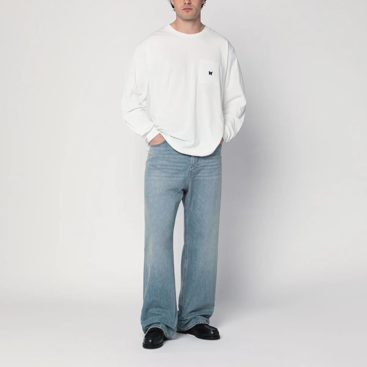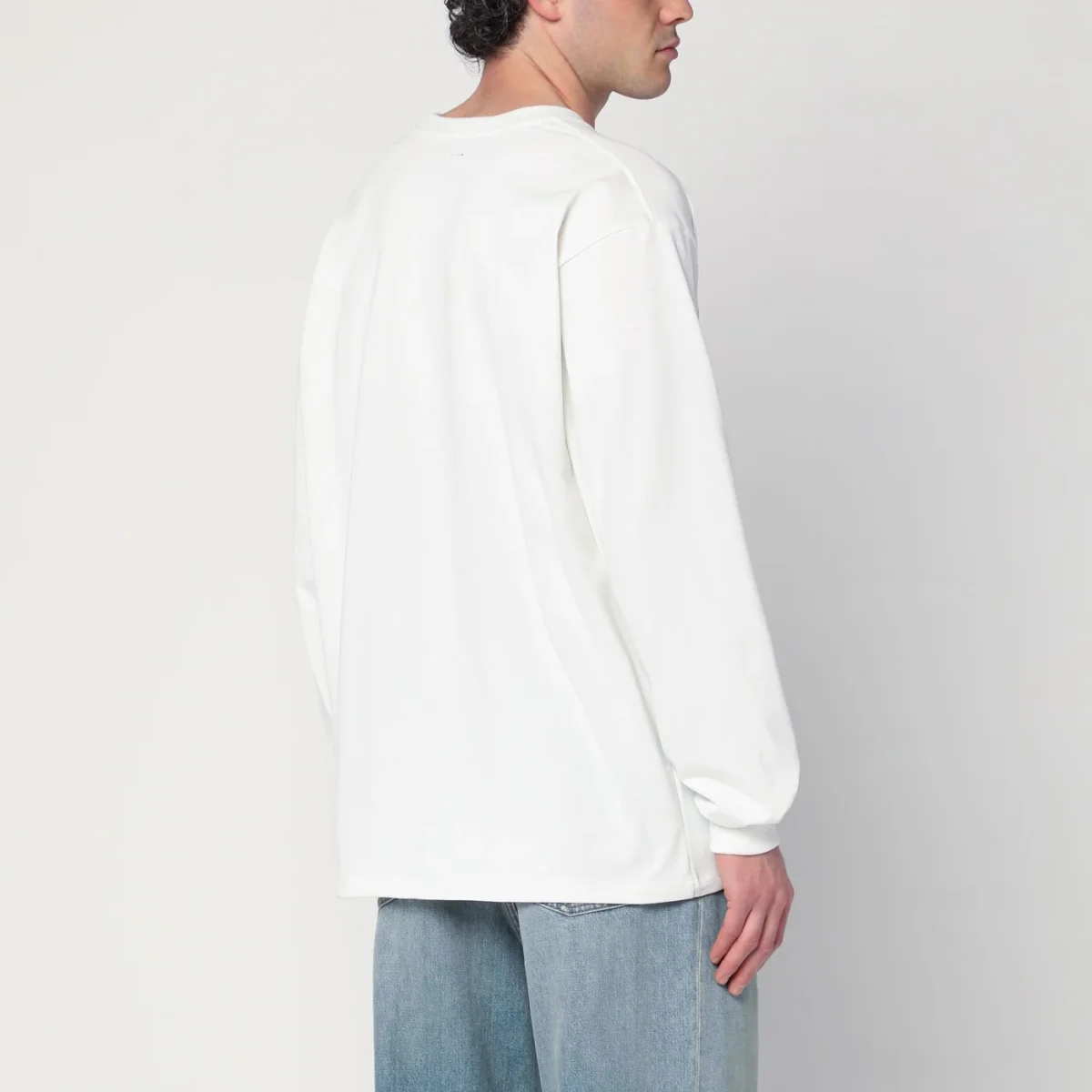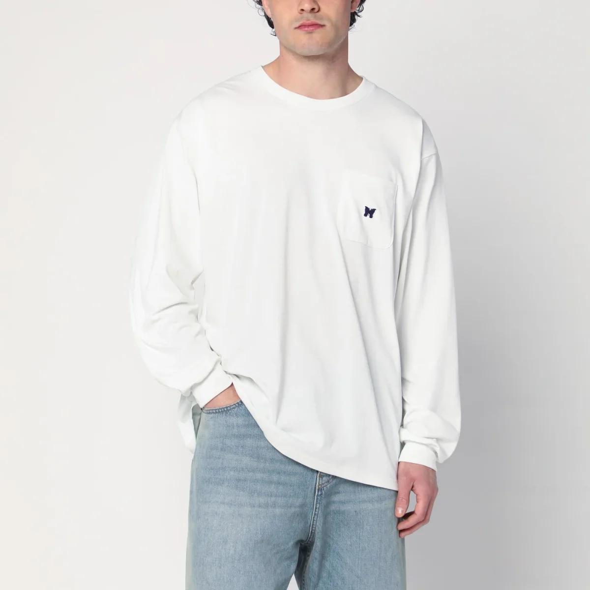 Maglia girocollo di Needles bianca, caratterizzata da manica lunga e una tasca applicata sul petto con patch logo.
