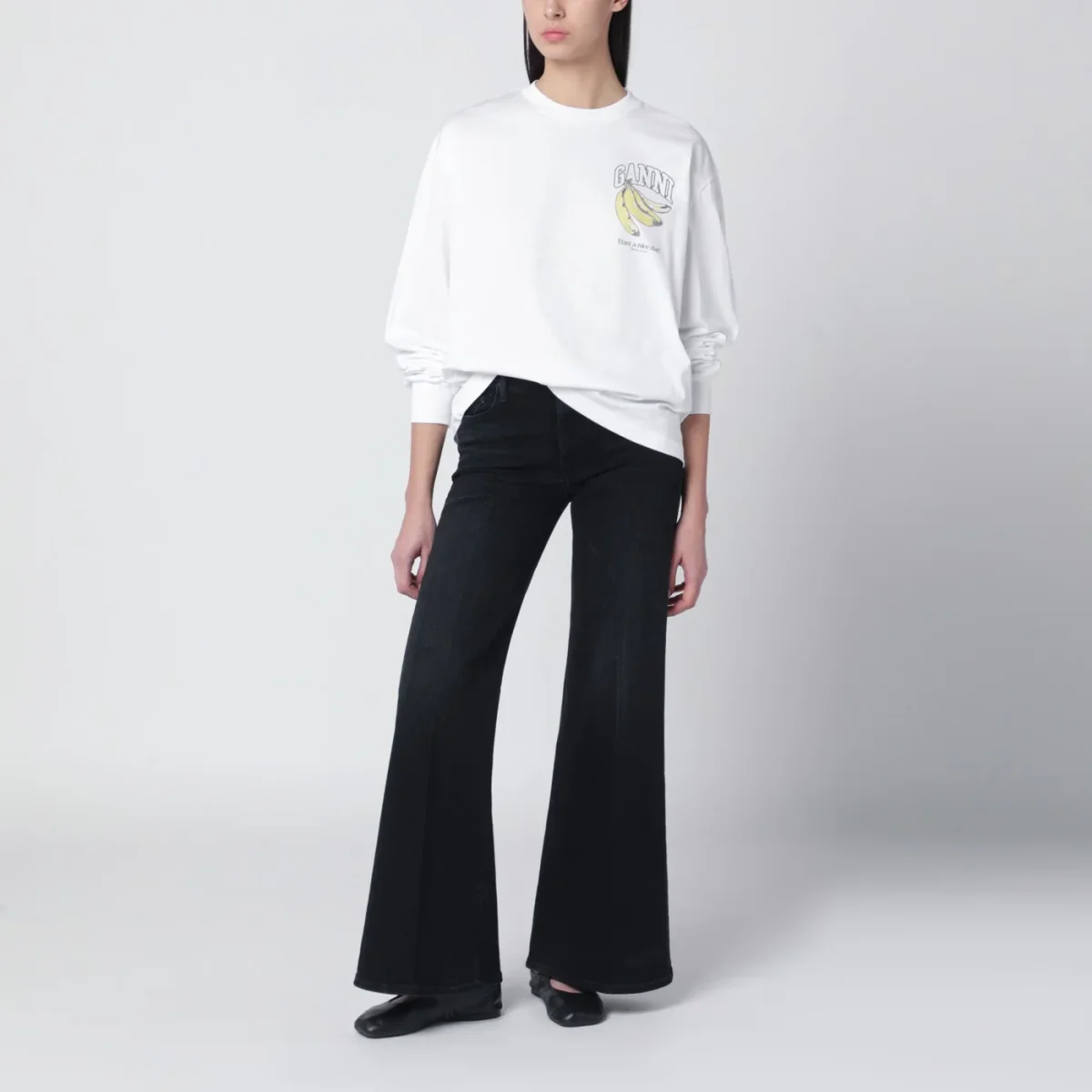 Maglia di Ganni in cotone organico bianca• maniche lunghe• girocollo• polsini a costine• spalle scese• stampa con ciliegie• logo lettering sul petto a contrasto