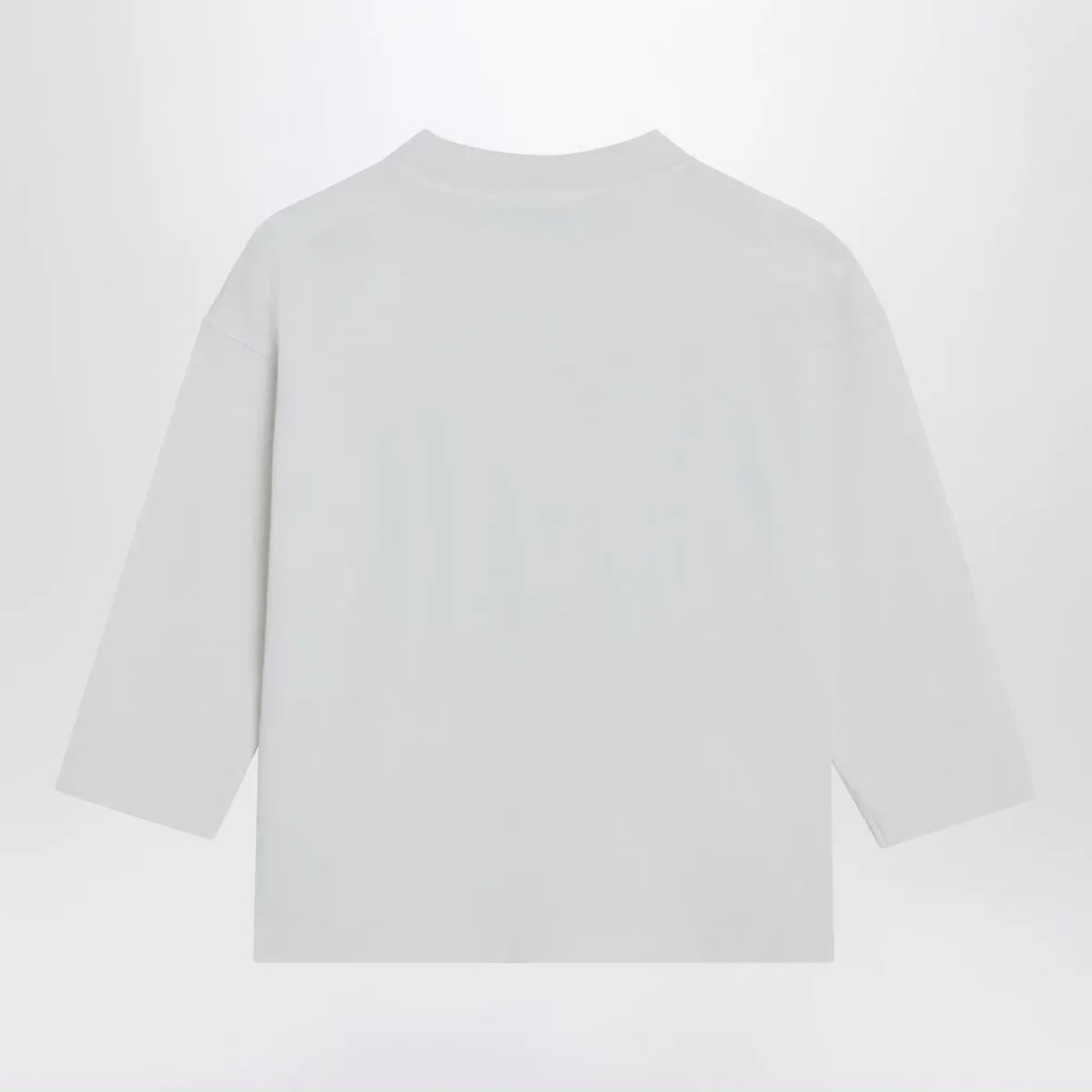 Maglia di Bobo Choses in cotone organico bianca, caratterizzata da maniche lunghe, girocollo a costine e stampa logo lettering con cane a contrasto sul davanti.
