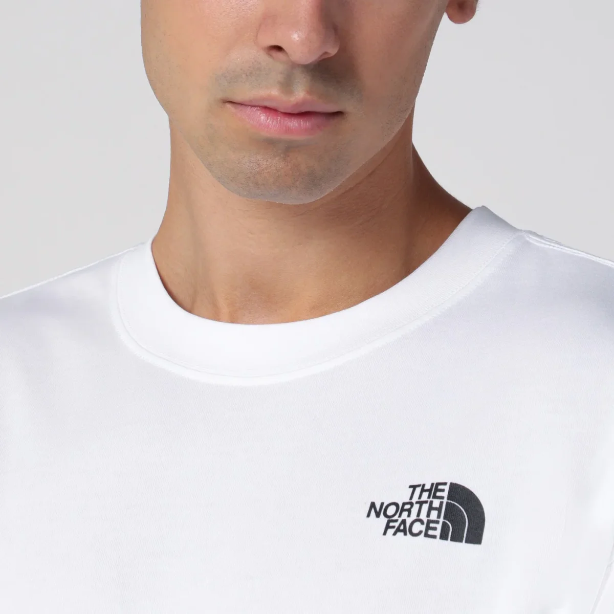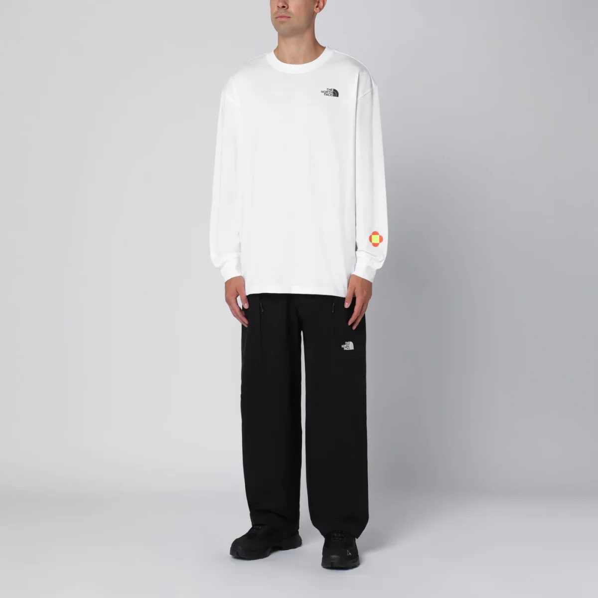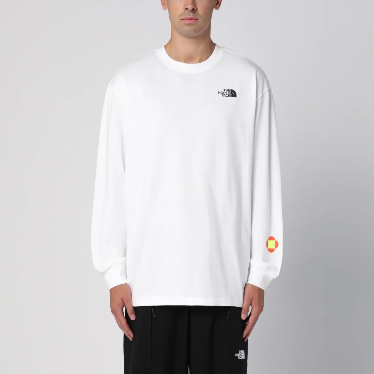 Maglia girocollo di The North Face in cotone bianca, caratterizzata da manica lunga, stampe logo sul petto e sul retro e vestibilità over.