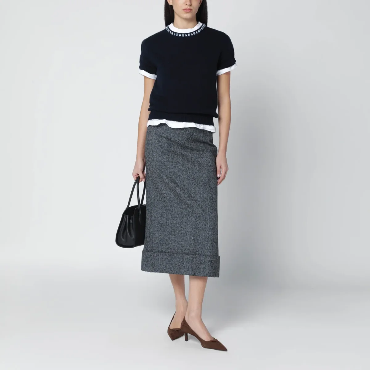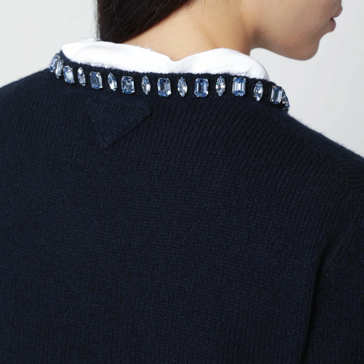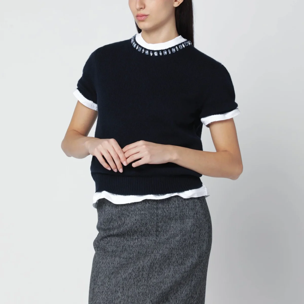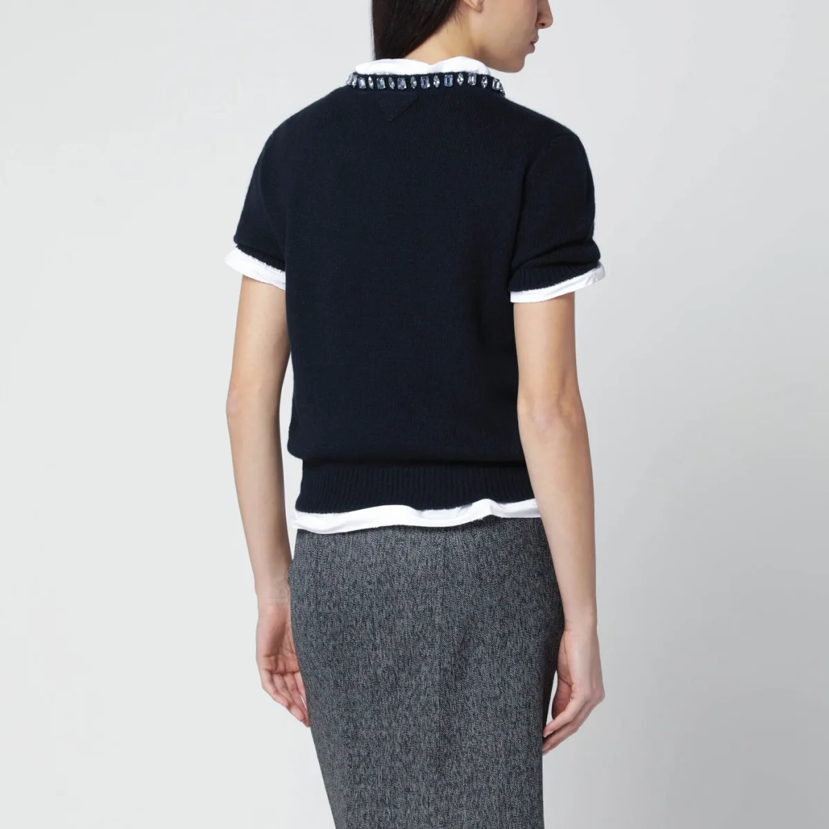 Maglia di Prada in lana vergine• cashmere blu • maniche corte• bordi a costine• girocollo con cristalli verdi• triangolo logo in tessuto sul retro