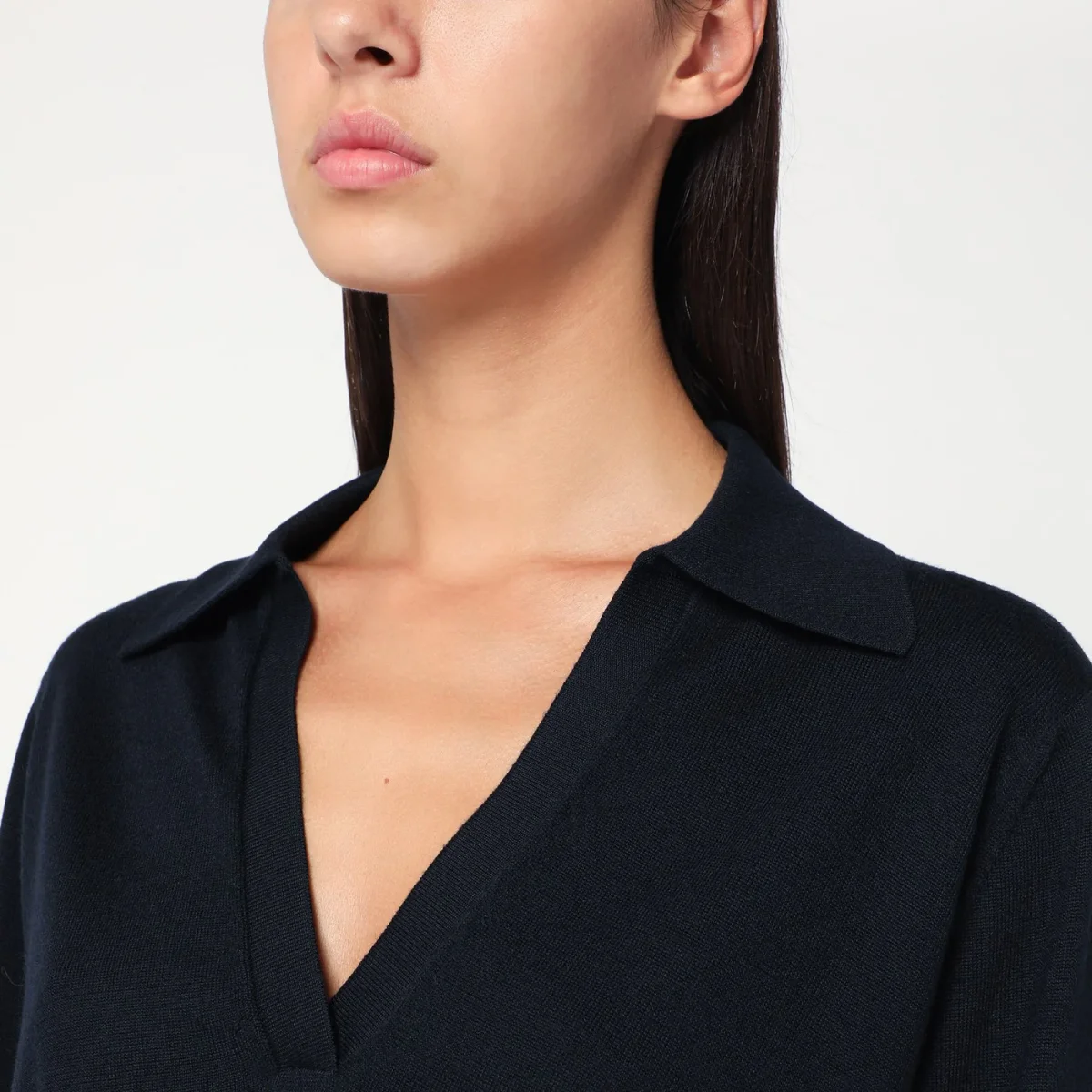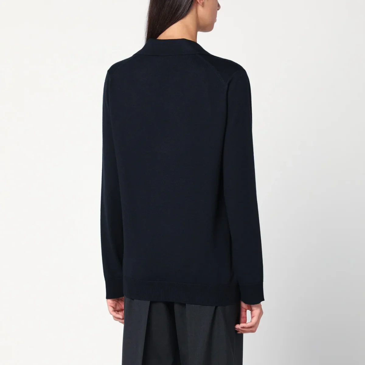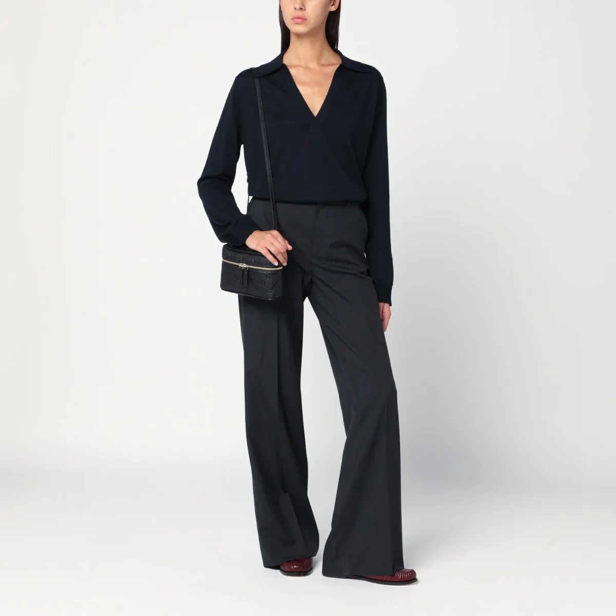 Maglia di Gucci in lana blu navy, caratterizzata da colletto stile polo, scollo a V, maniche lunghe, ricamo logo GG e bordi a costine.