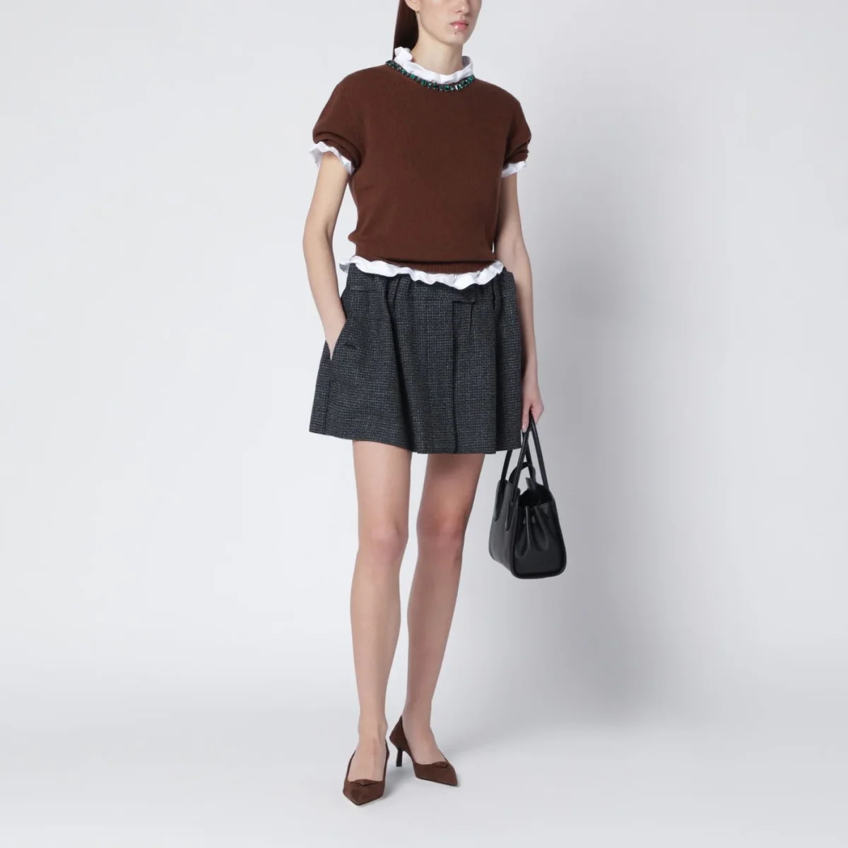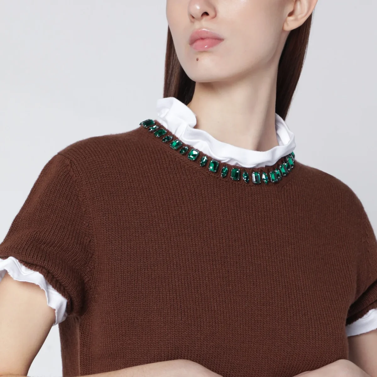 Maglia di Prada in lana vergine e cashmere color tabacco• maniche corte• bordi a costine• girocollo con cristalli verdi• triangolo logo in tessuto sul retro
