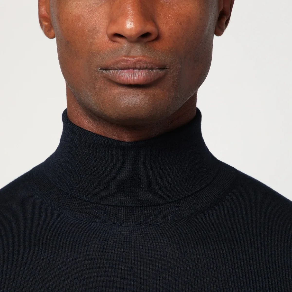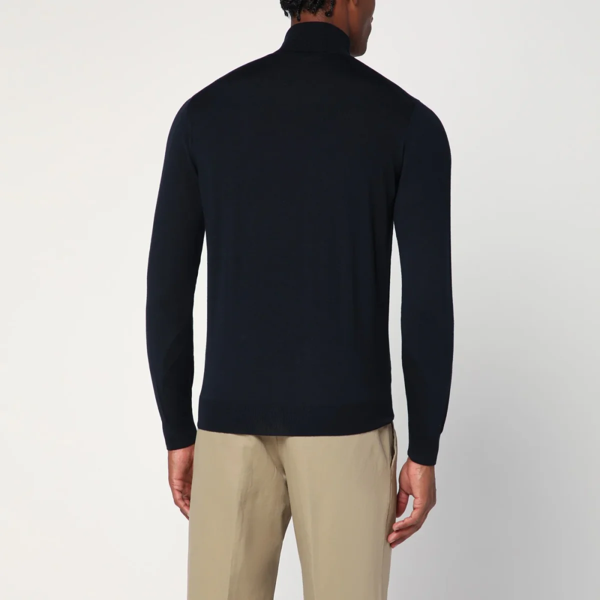 Maglia di Drumohr in lana blu navy, caratterizzata da maniche lunghe, collo alto e bordi a costine.