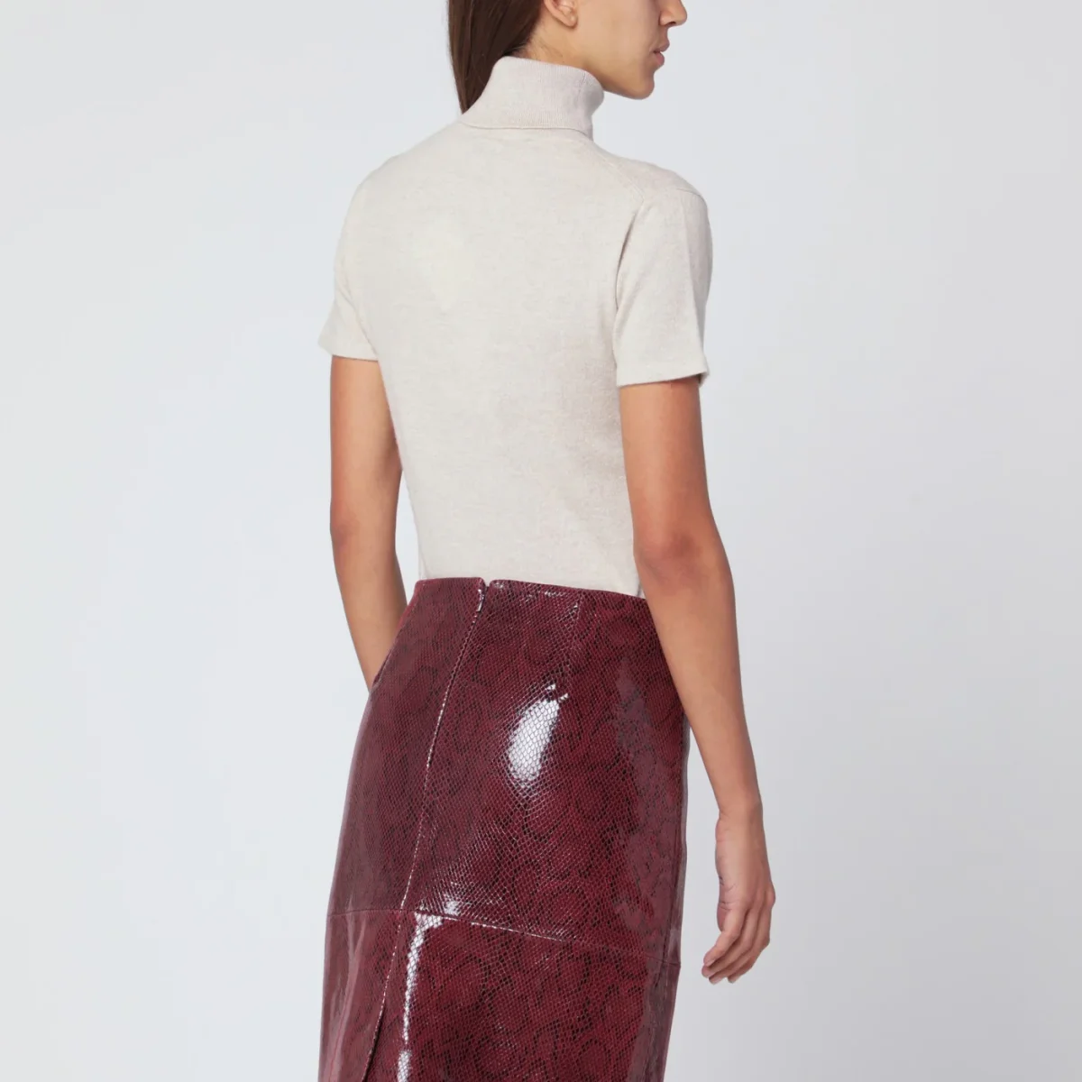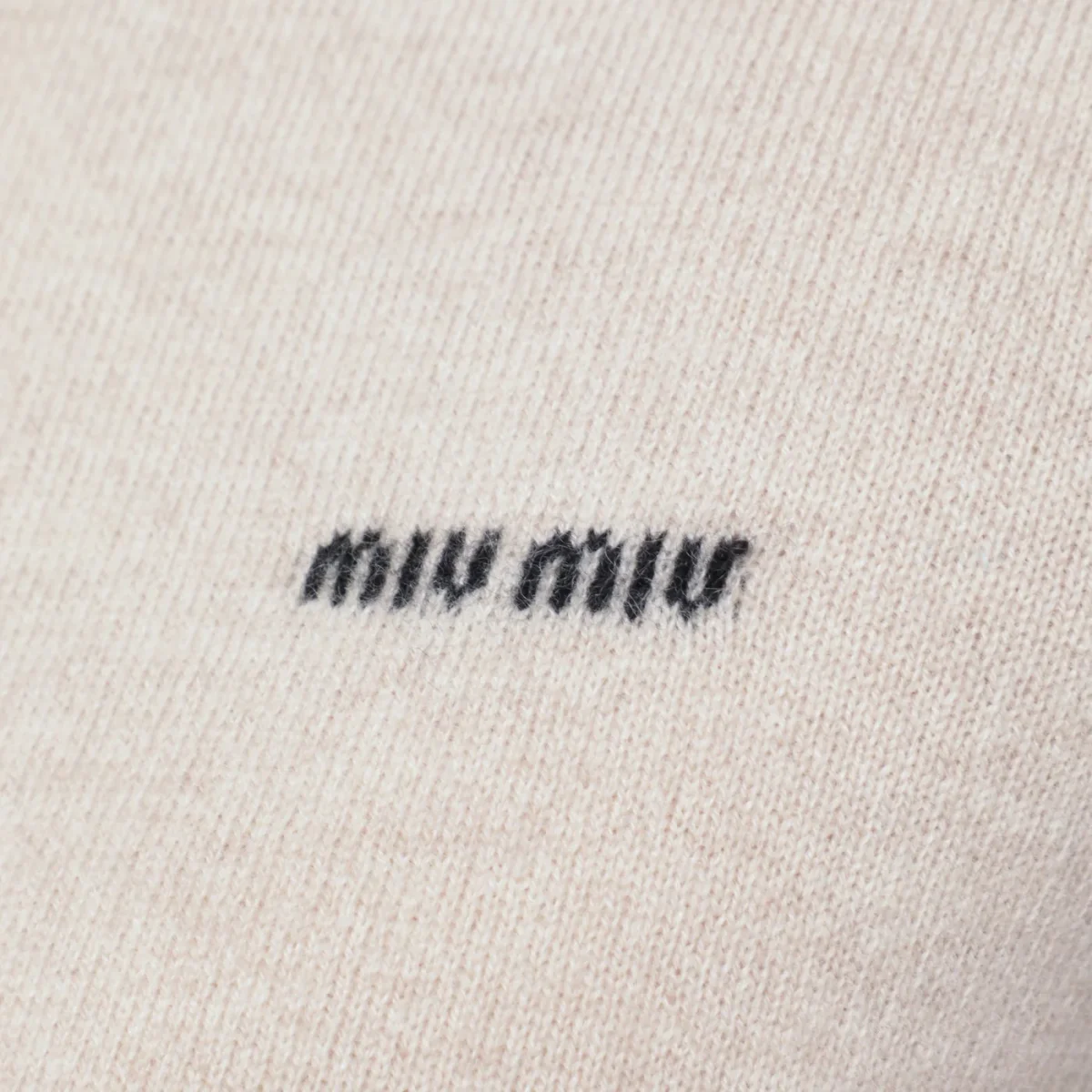 Maglia di Miu Miu in cashmere color sabbia, caratterizzata da collo alto, maniche corte, ricamo logo sul petto e vestibilità aderente.