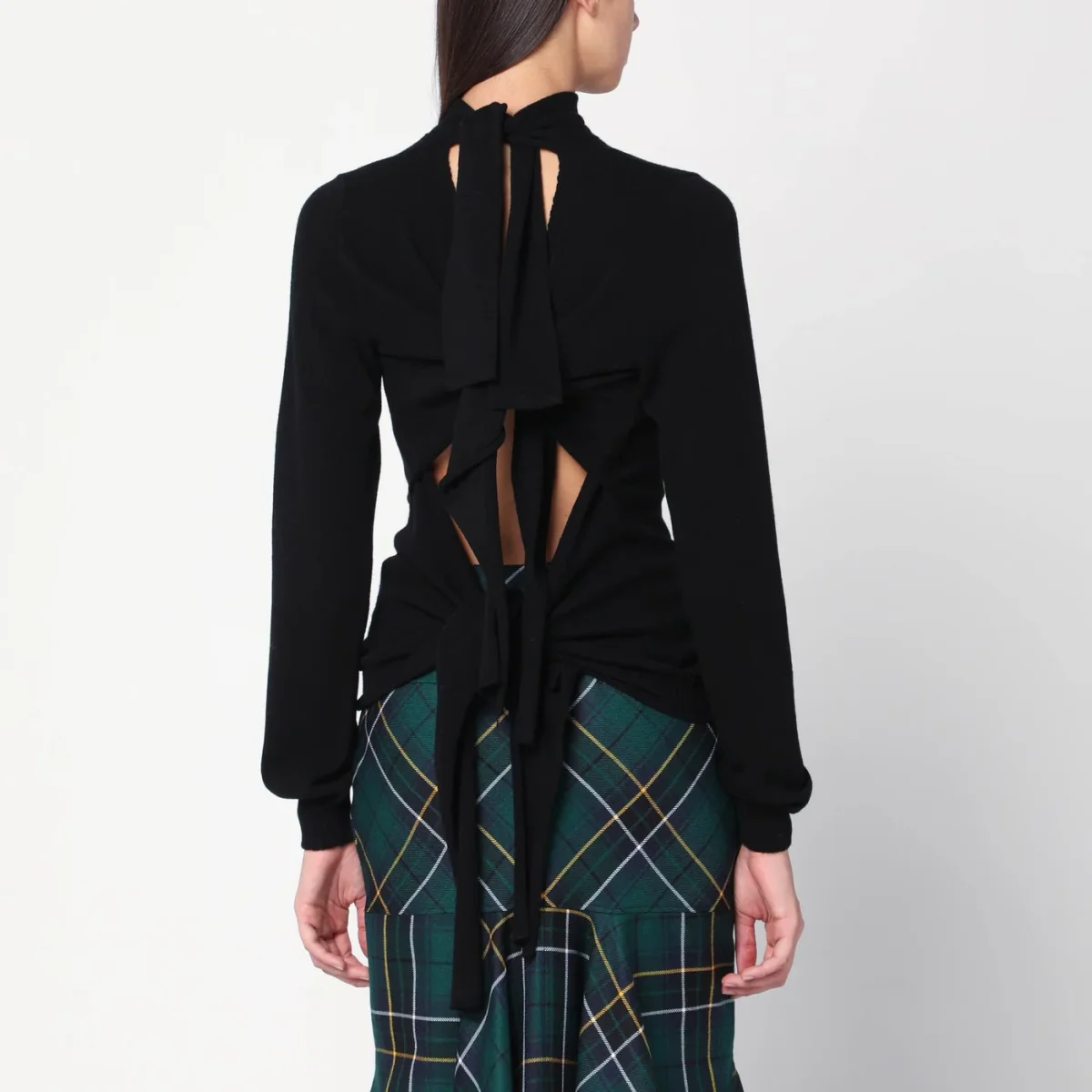 Maglia di Moschino in lana nera, caratterizzata da maniche lunghe, collo alto, dettagli incrociati sul retro e bordi a costine.