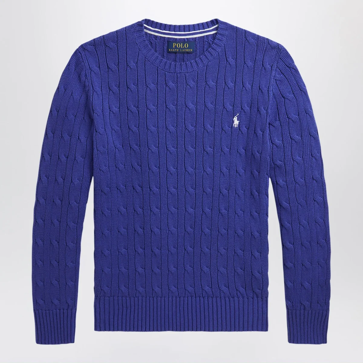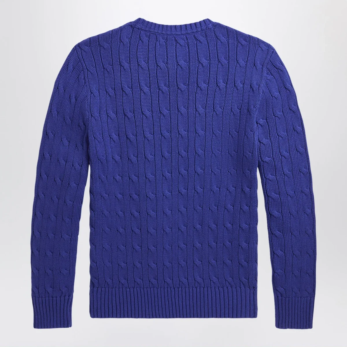Maglia girocollo di Polo Ralph Lauren in cotone blu acceso, caratterizzata da manica lunga, con lavorazione a trecce e logo ricamato sul petto.