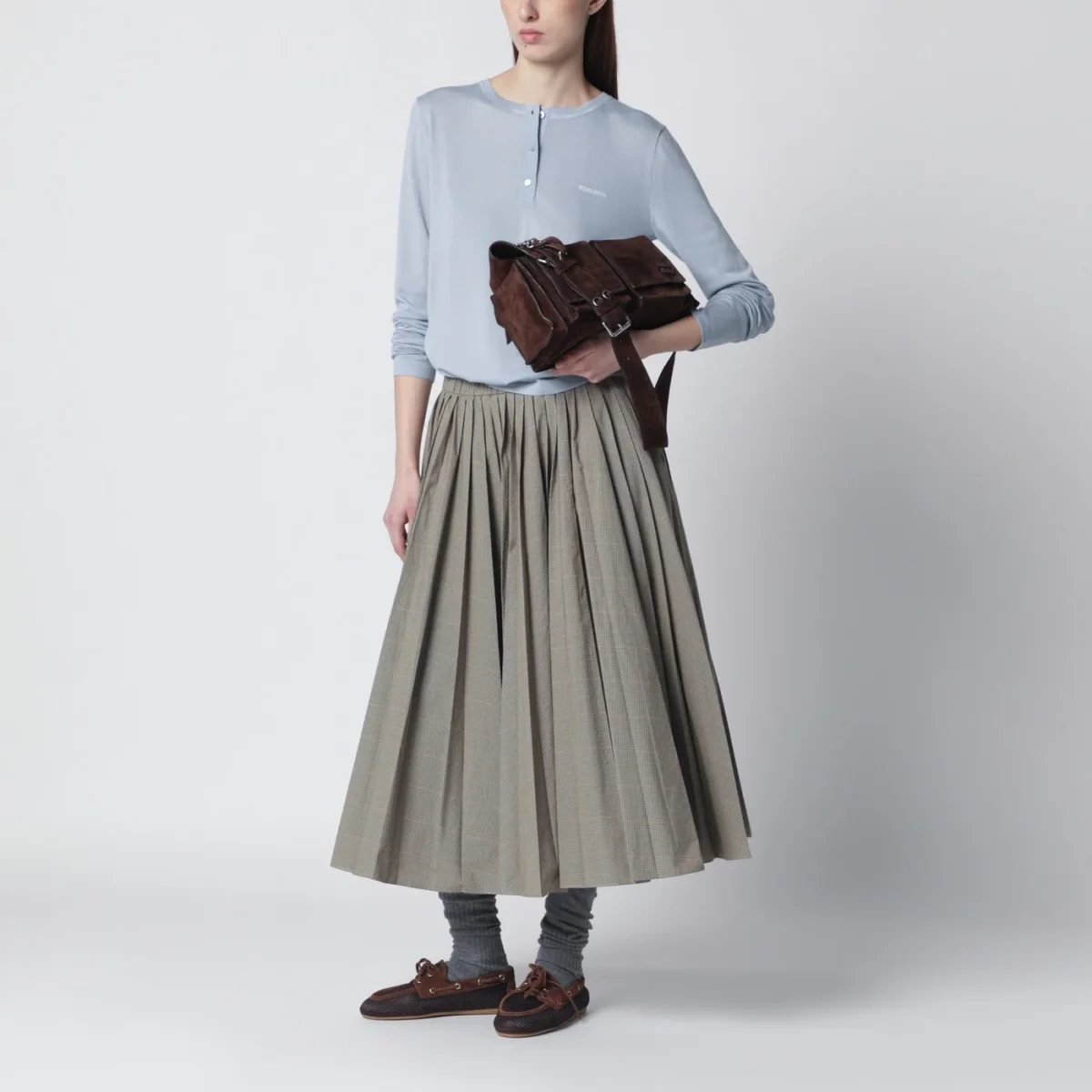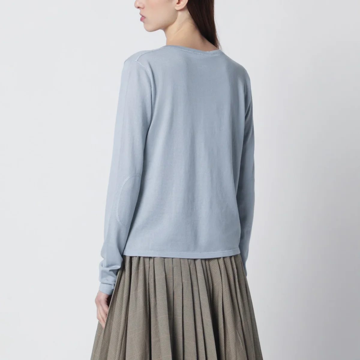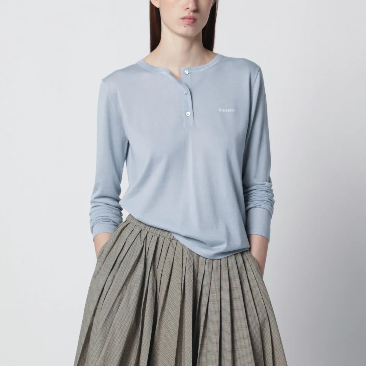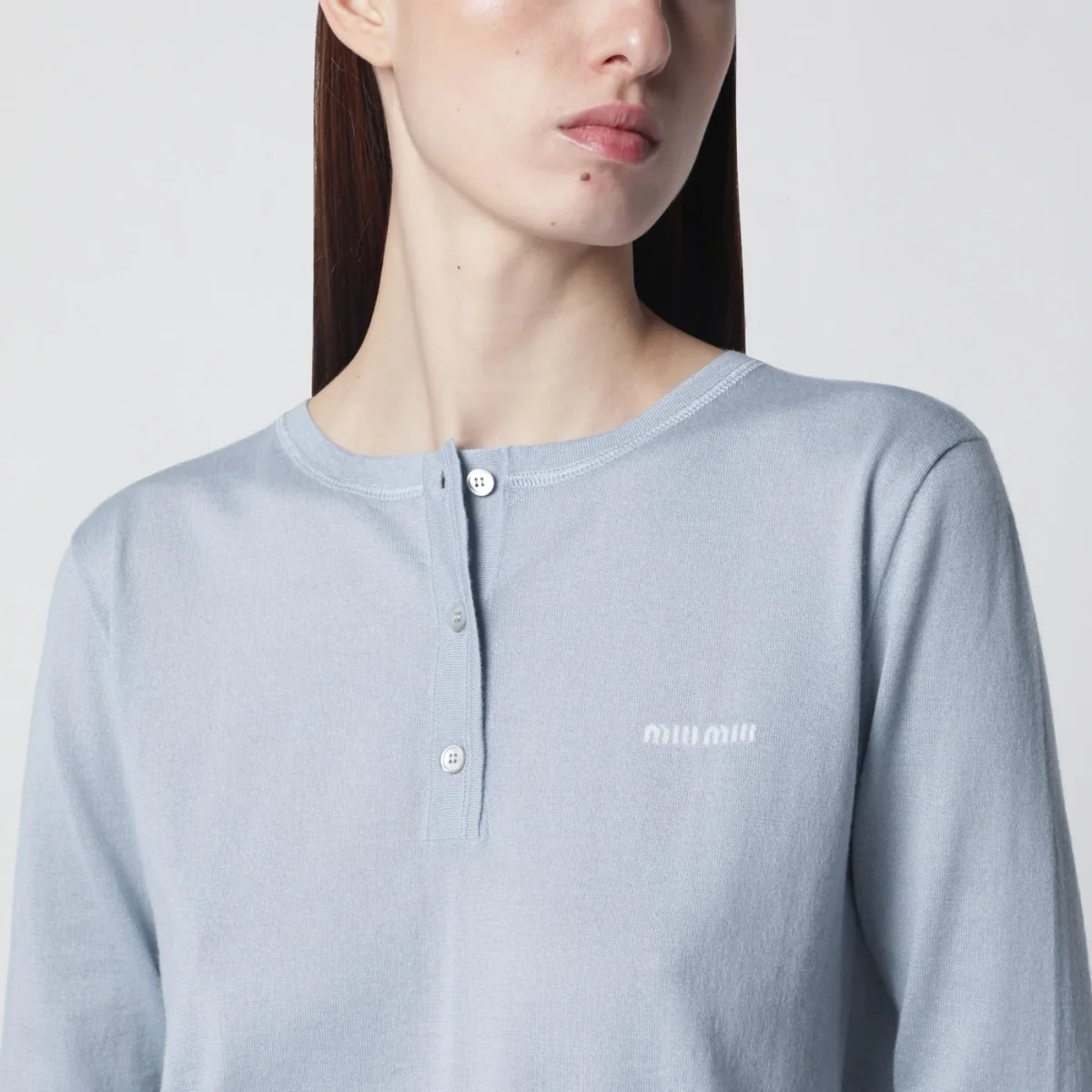 Maglia girocollo di Miu Miu in cashmere colore cielo• bottoncini sul davanti• maniche lunghe• logo lettering intarsiato sul petto• vestibilità regolare