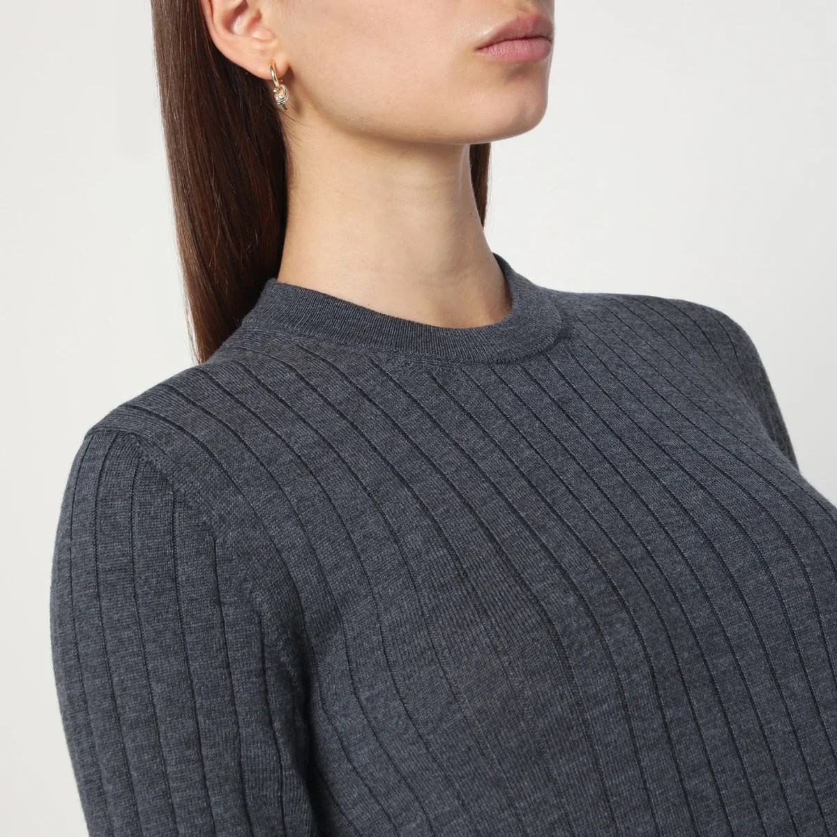 Maglia girocollo di Bottega Veneta in lana grigia antracite, caratterizzata da maniche corte, lavorazione a coste e bordi a costine.