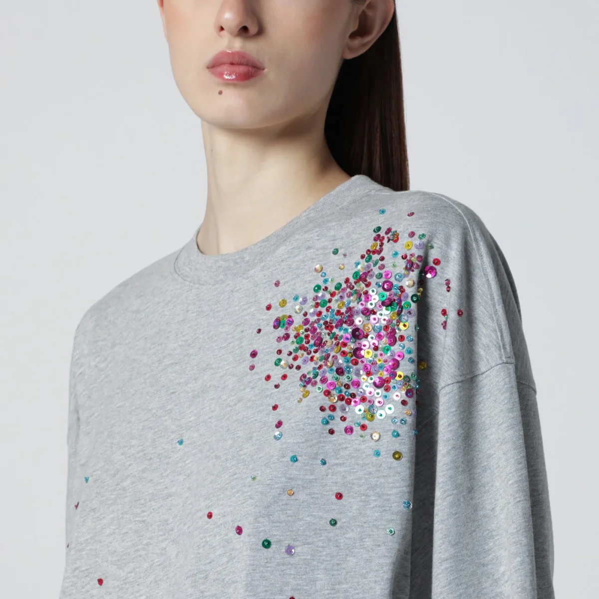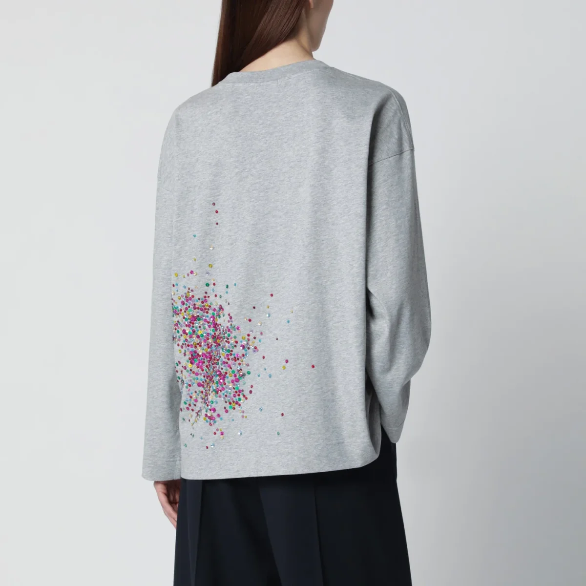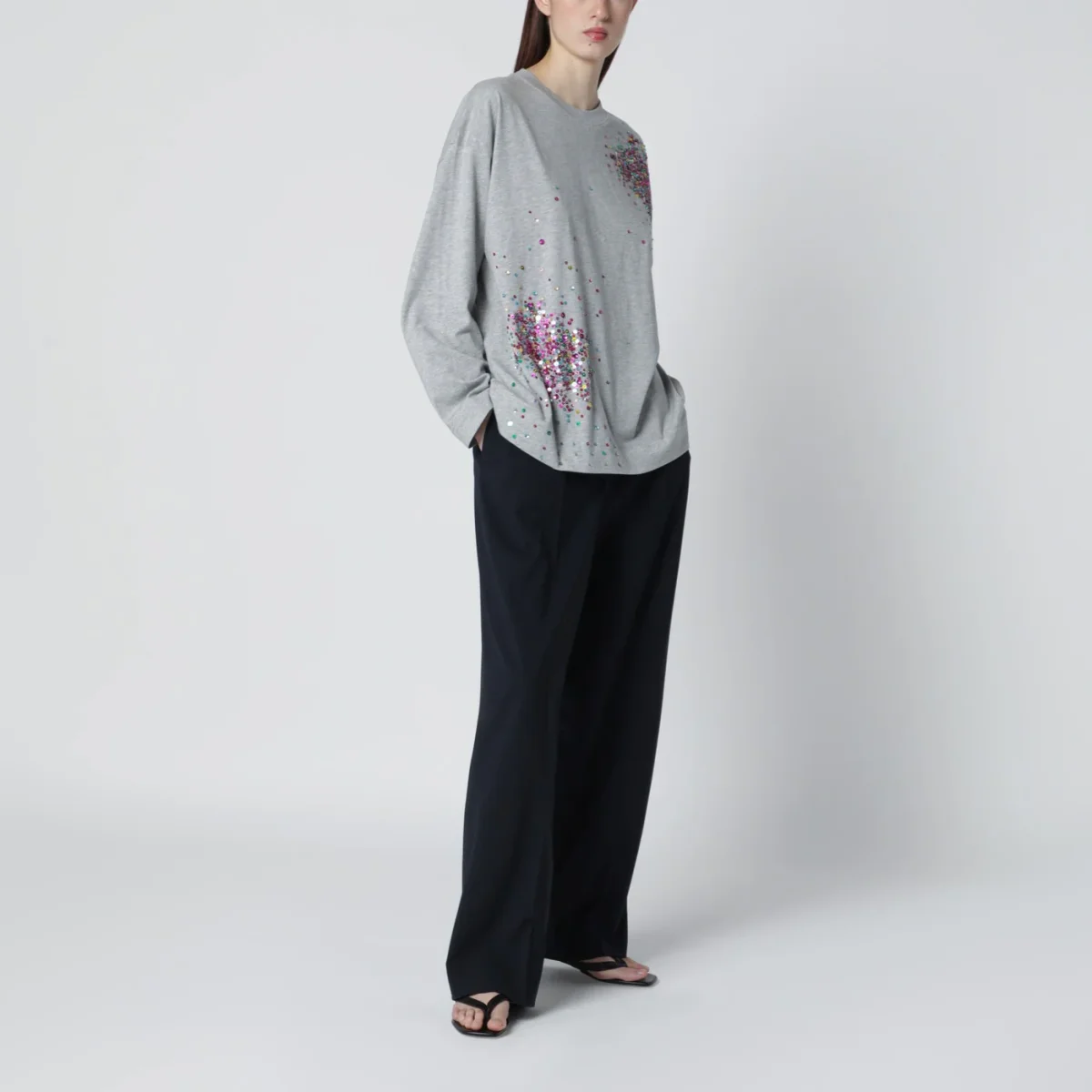 Maglia di Dries Van Noten in cotone grigia• Maniche lunghe con spalle scese• Girocollo a costine• Decorazioni multicolore con paillette stile fuochi d’artificio• Vestibilità oversize