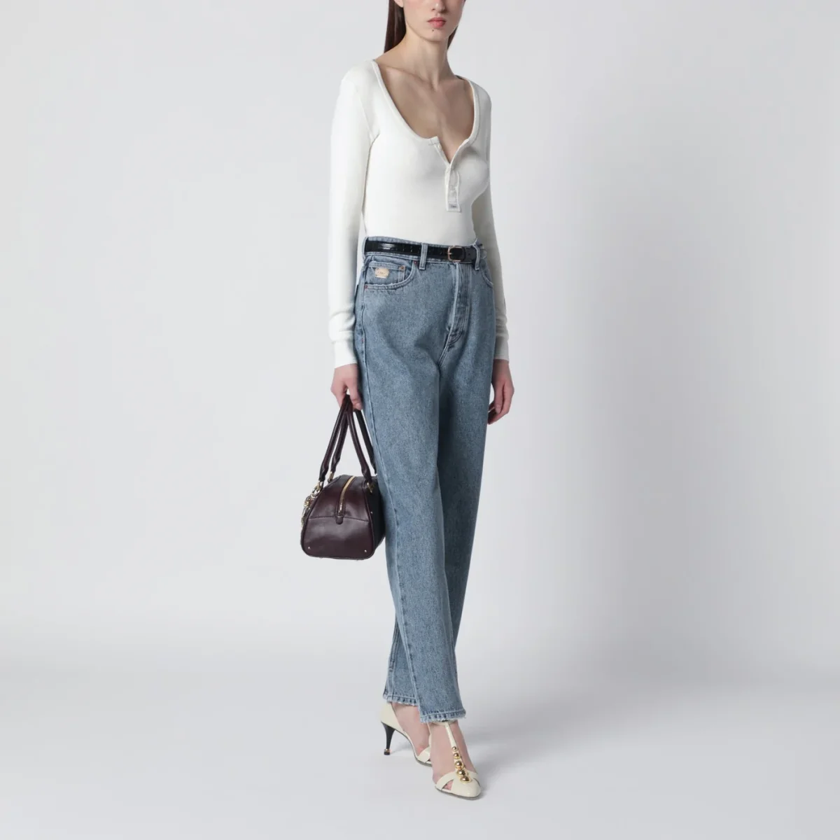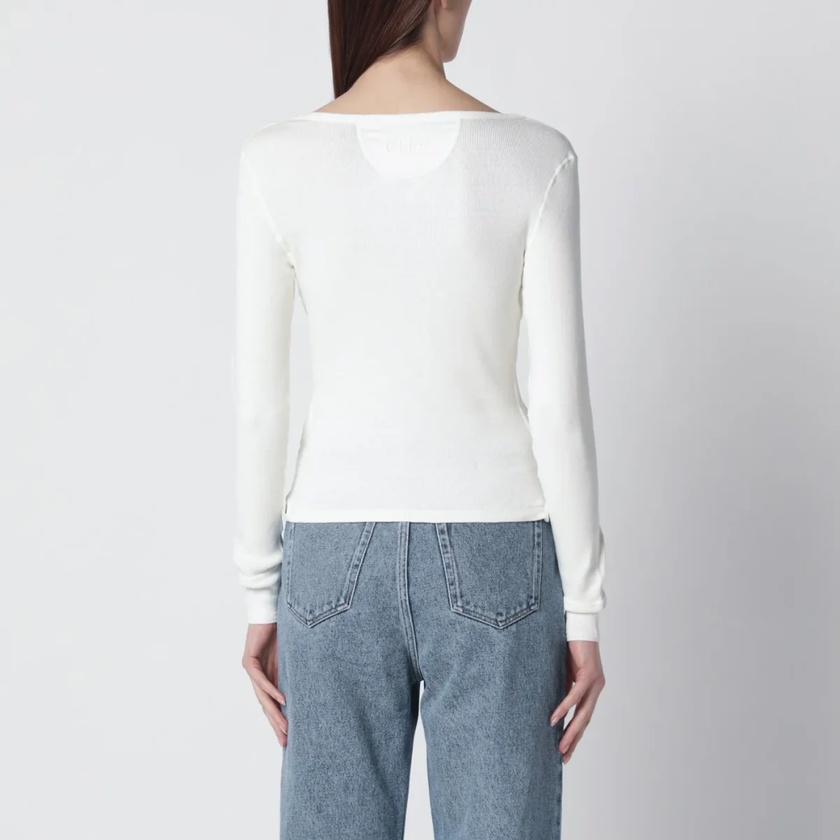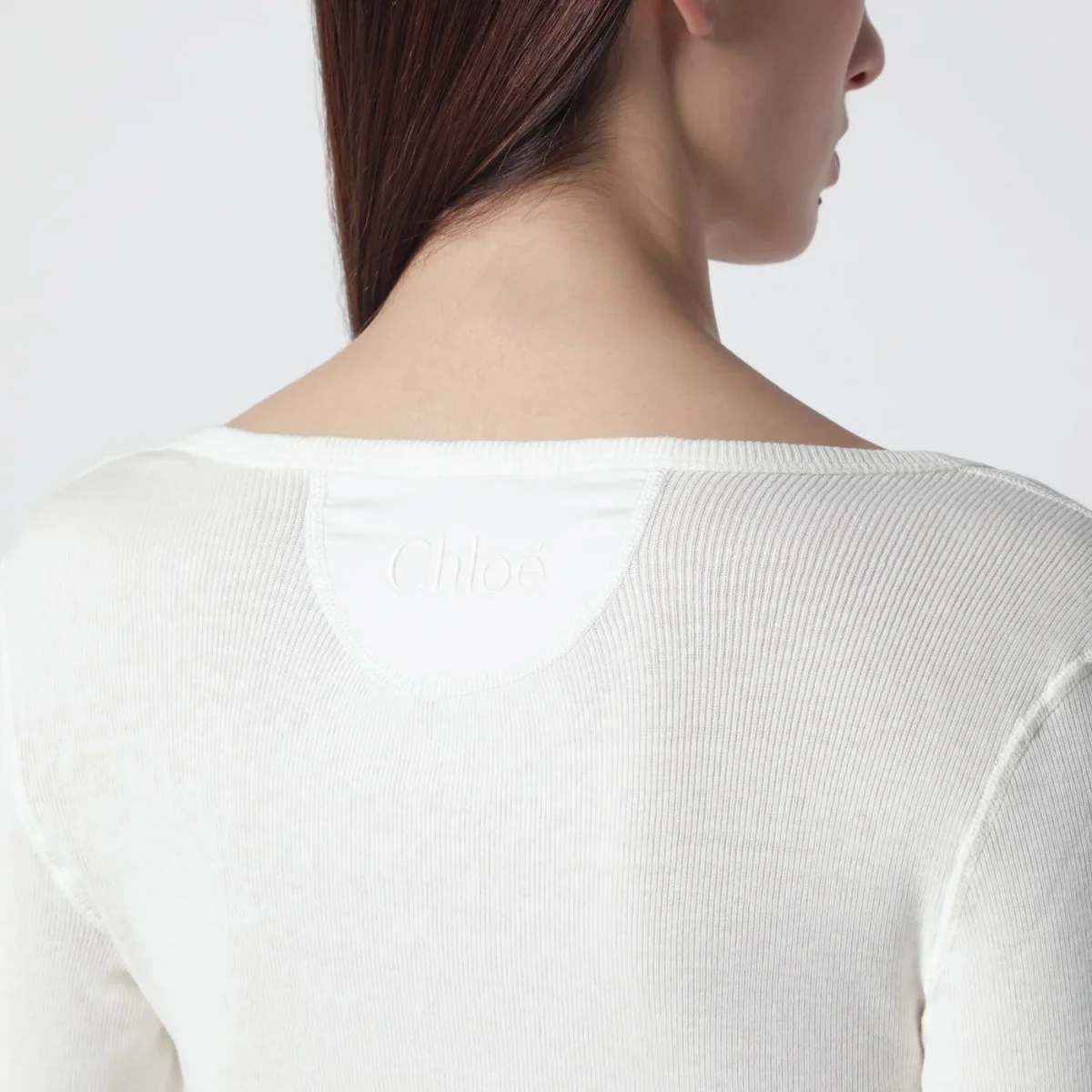 Maglia di Chloé in jersey di cotone color bianco latte• ampio girocollo• bottoncini sul davanti• patch con logo lettering• maniche lunghe• vestibilità aderente• design a costine• logo lettering ricamato tono su tono sul retro
