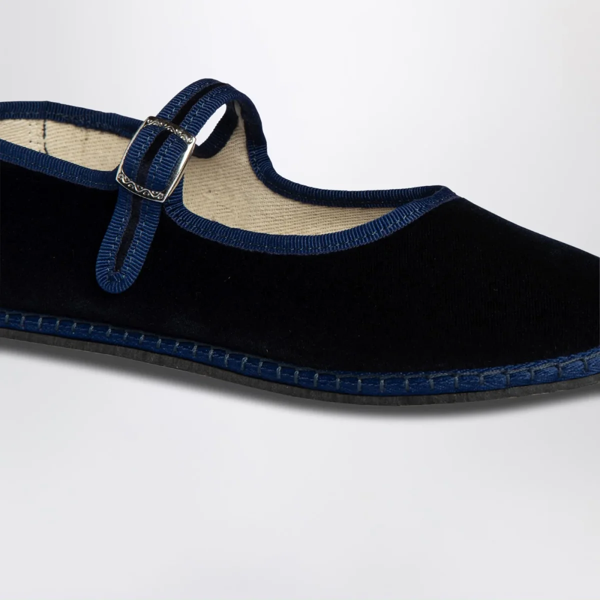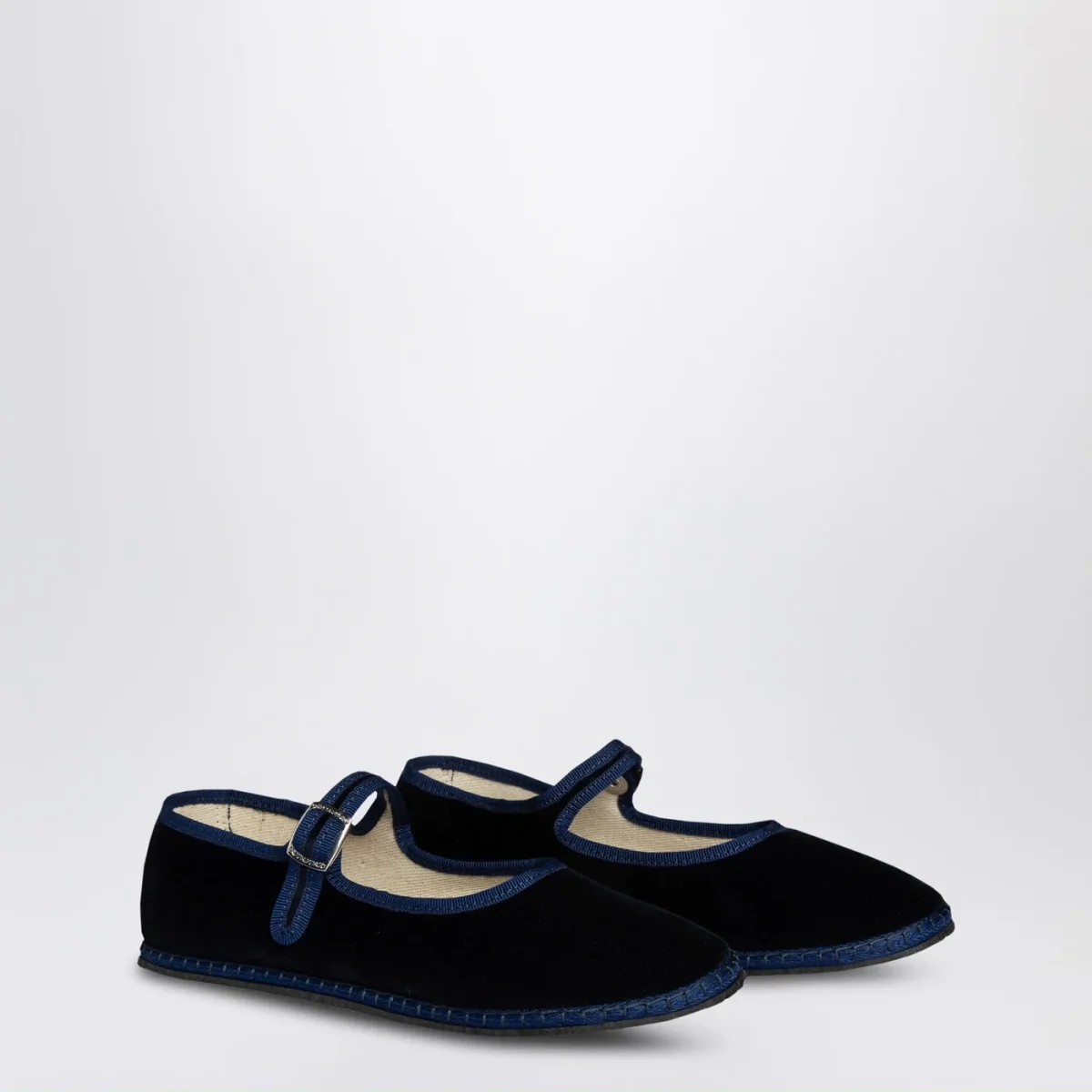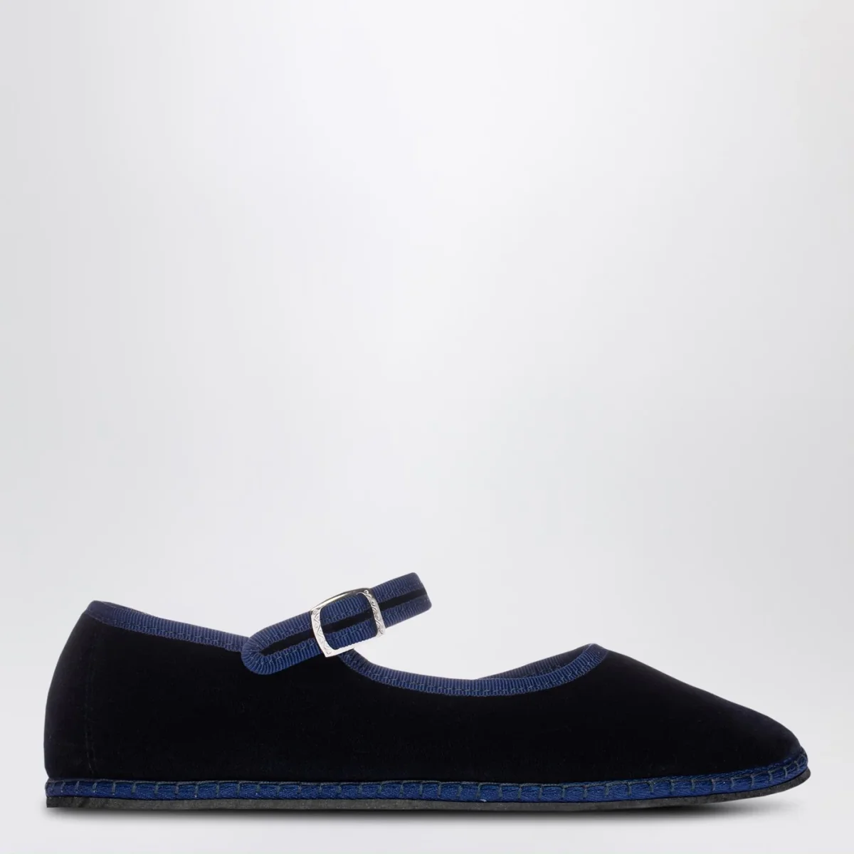 Mary Jane di Vibi Venezia in velluto blu con cinturino regolabile con fibbia e suola in gomma.