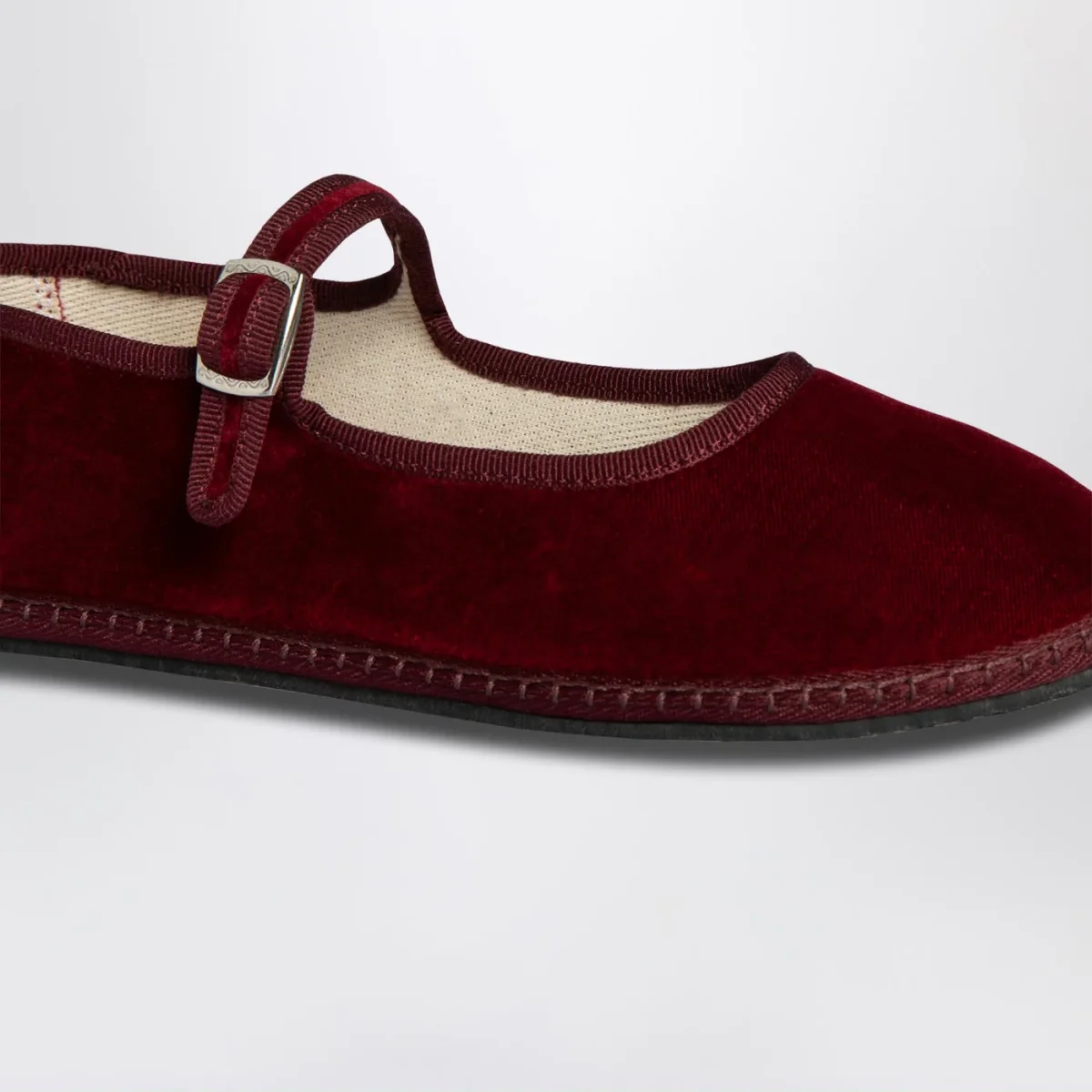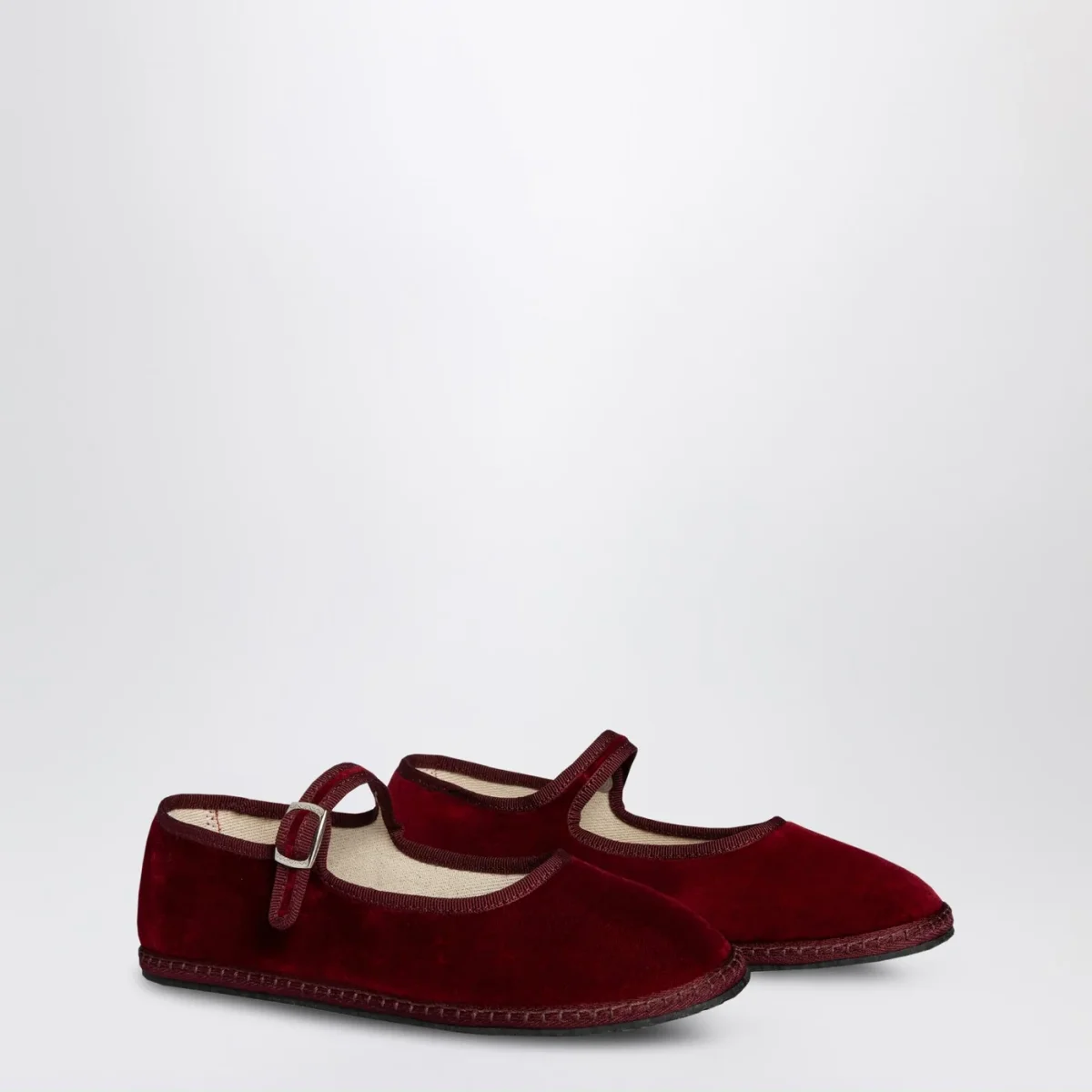 Mary Jane di Vibi Venezia in velluto bordeaux con cinturino regolabile con fibbia e suola in gomma.