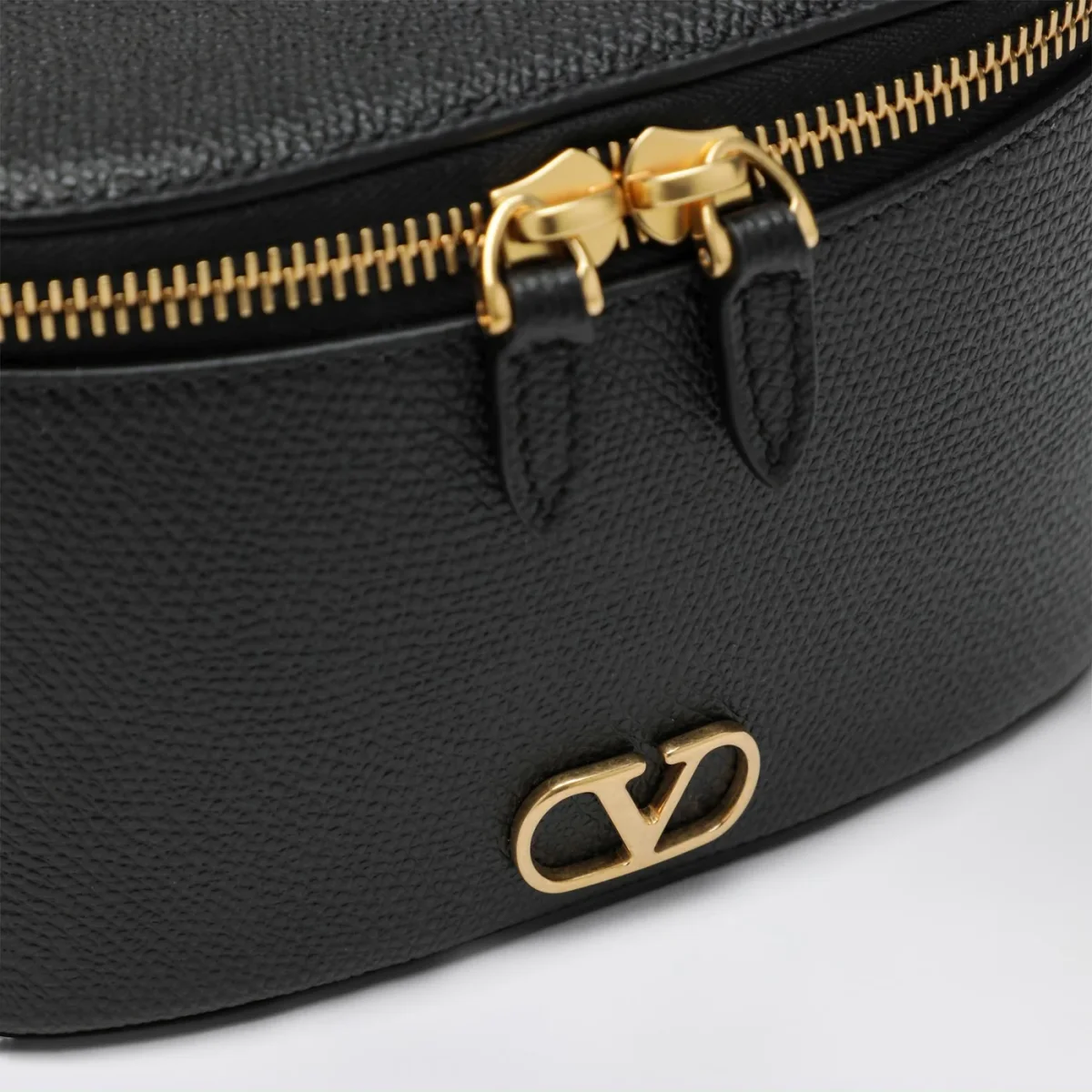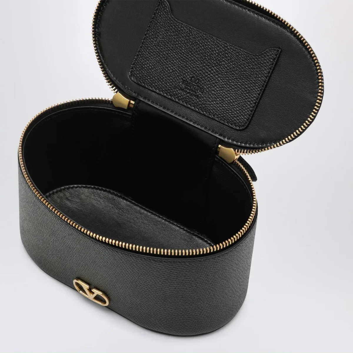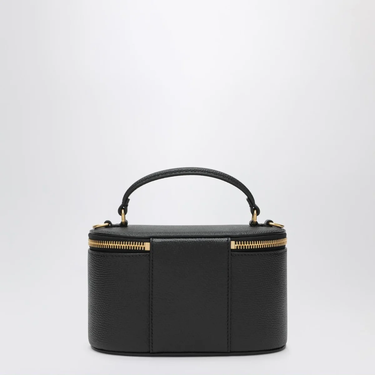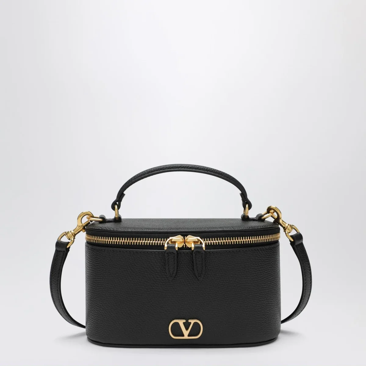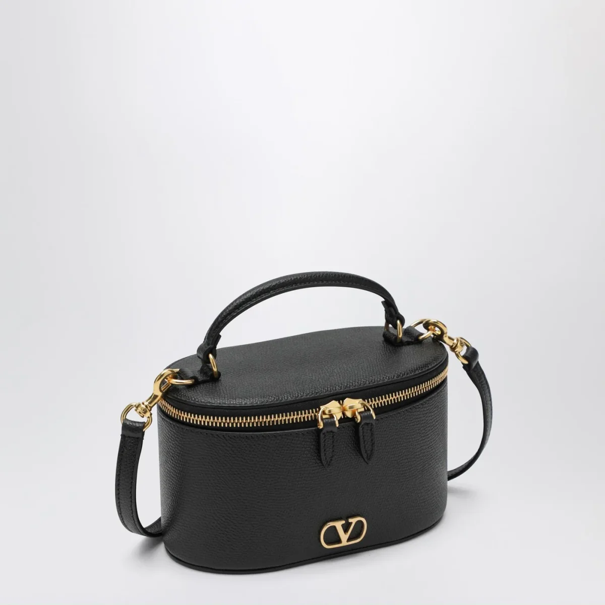 Mini Vanity Bag di Valentino Garavani in vitello granato nera, caratterizzata da un manico superiore, tracolla regolabile e rimovibile, Vlogo Signature sul davanti, hardware in metallo con finitura in ottone anticato, una tasca portacarte interna e chiusura con doppia zip.