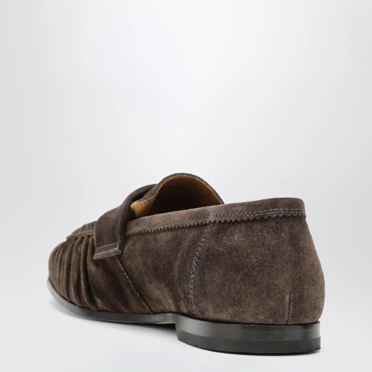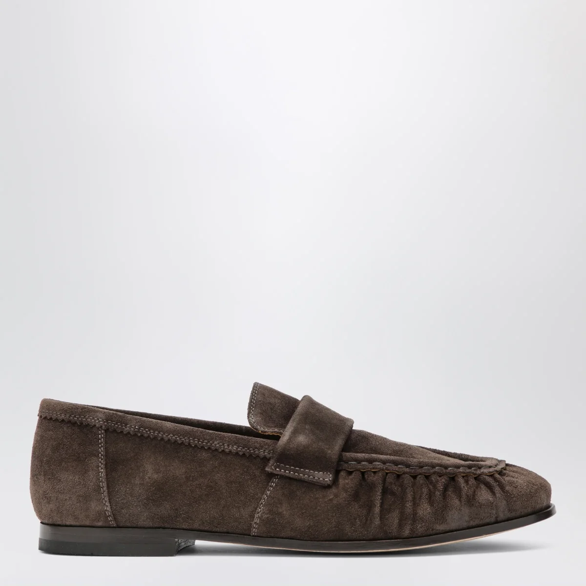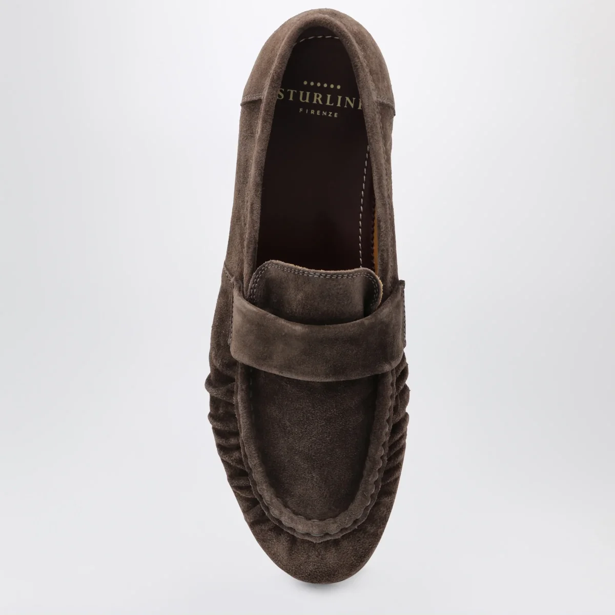 Mocassino di Sturlini in pelle scamosciata• Colore: Marrone ebano• Punta a mandorla• Design effetto arricciato• Suola in cuoio• Collezione Versilia