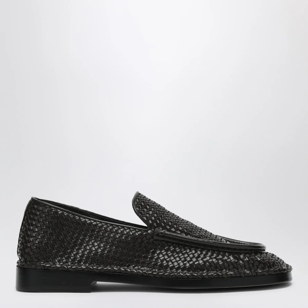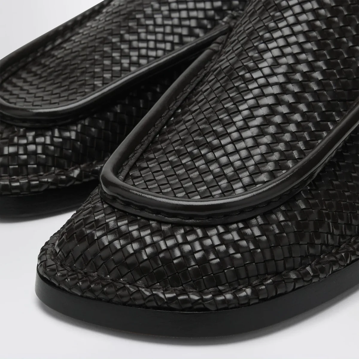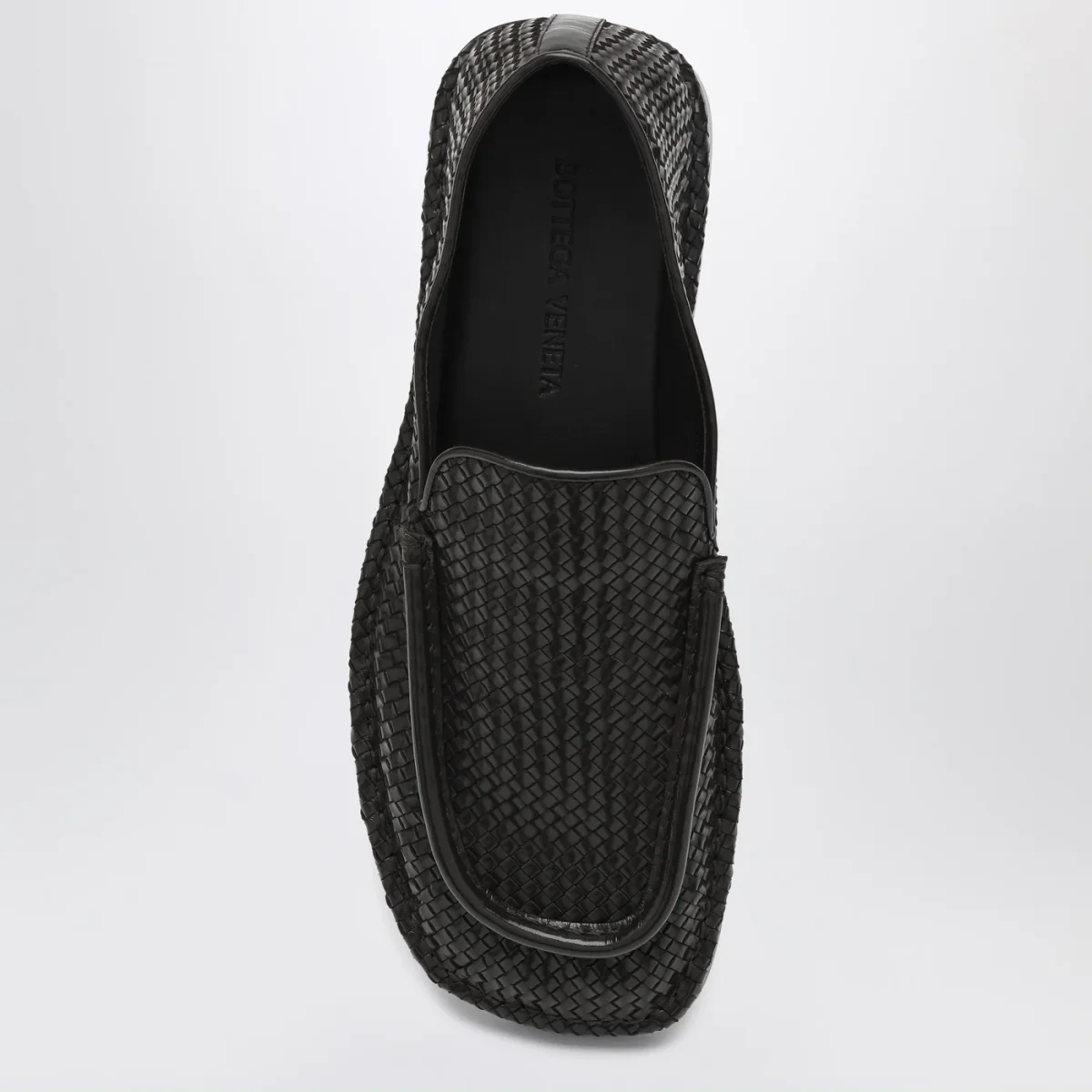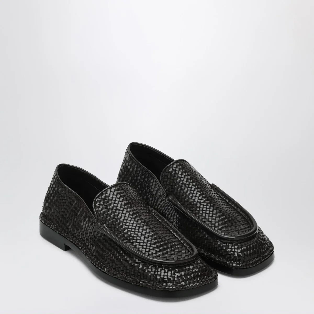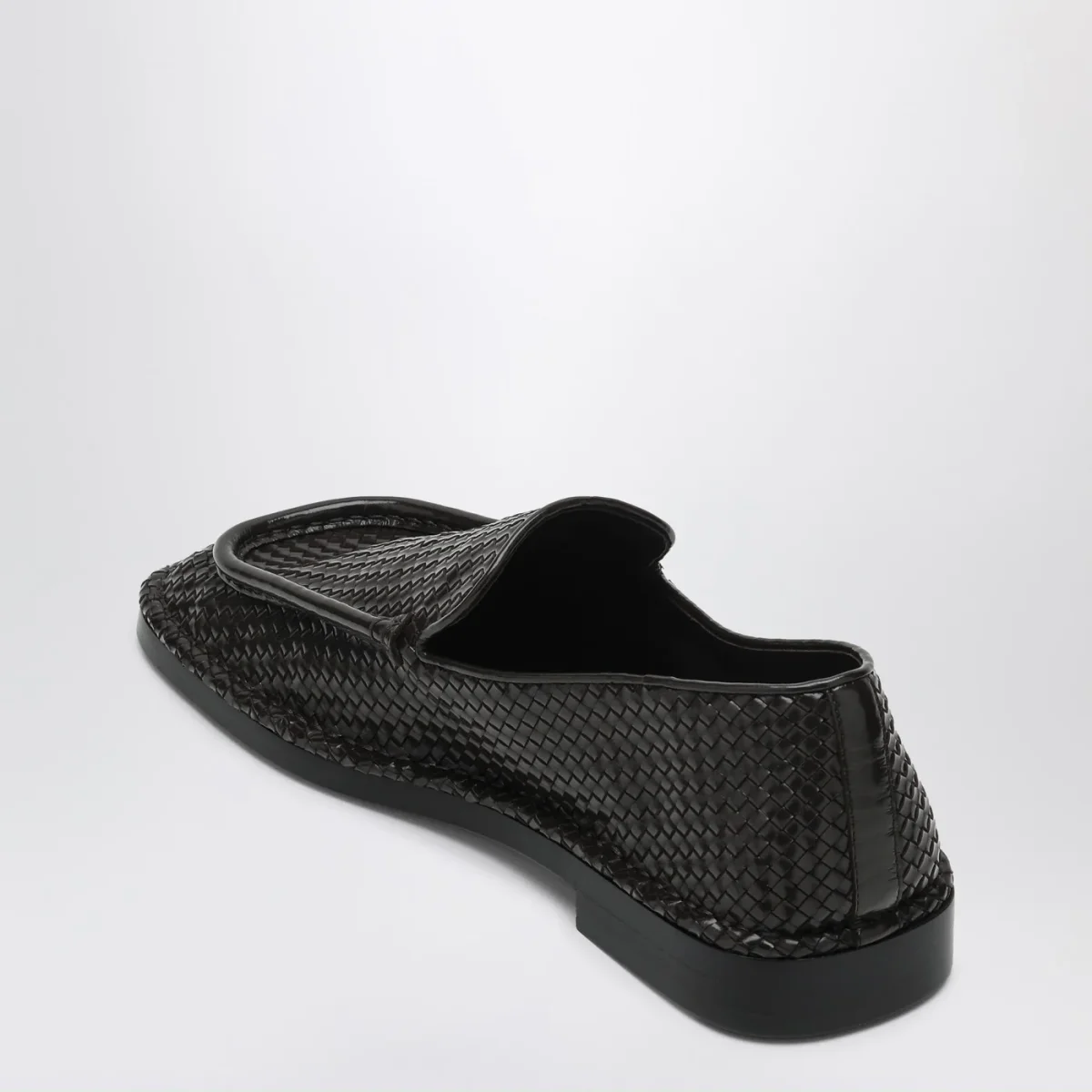 Mocassini di Bottega Veneta in pelle di vitello lucida color fondente, caratterizzati da lavorazione in intrecciato, punta squadrata, cuciture in rilievo, logo impresso sulla soletta e suola in cuoio.