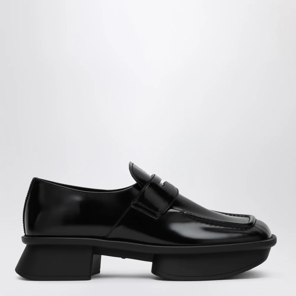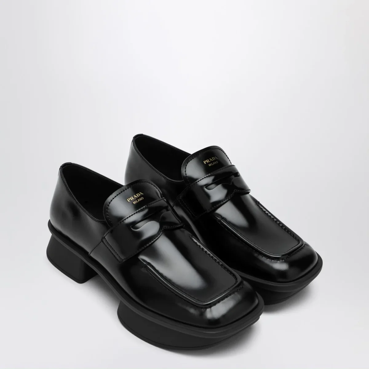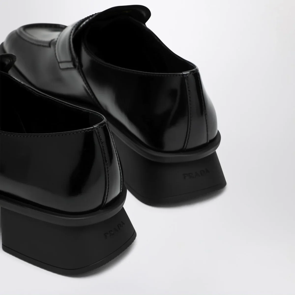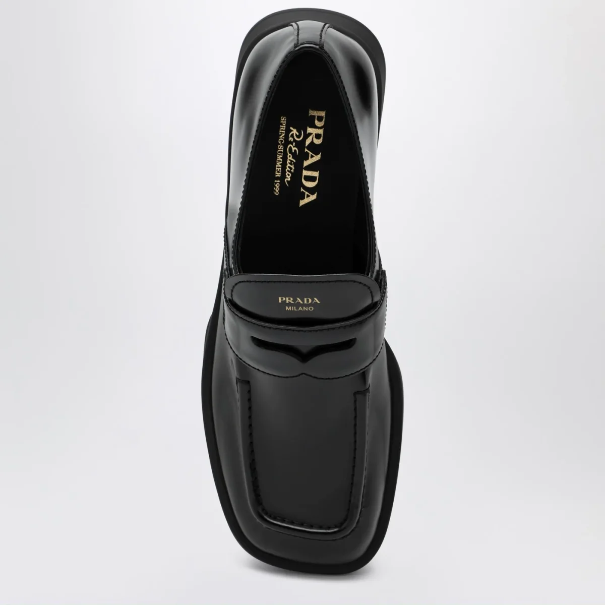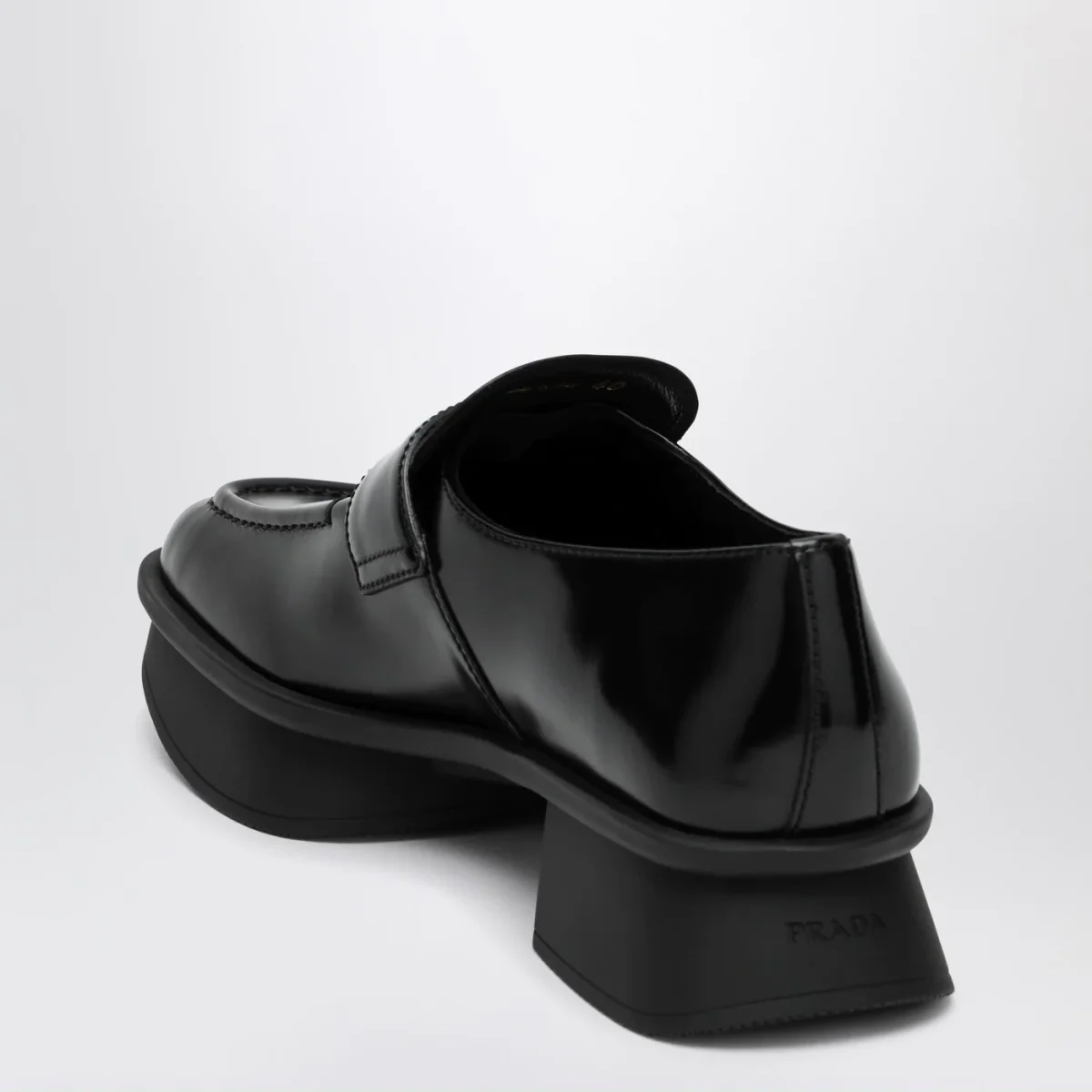 Mocassini di Prada in pelle spazzolata neri, caratterizzati da tomaia con morsetto in pelle, vaschetta con burlotto, soletta interna logata e suola in gomma alta 40 mm.