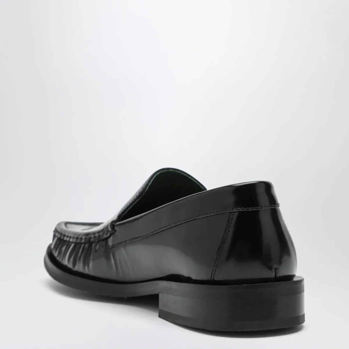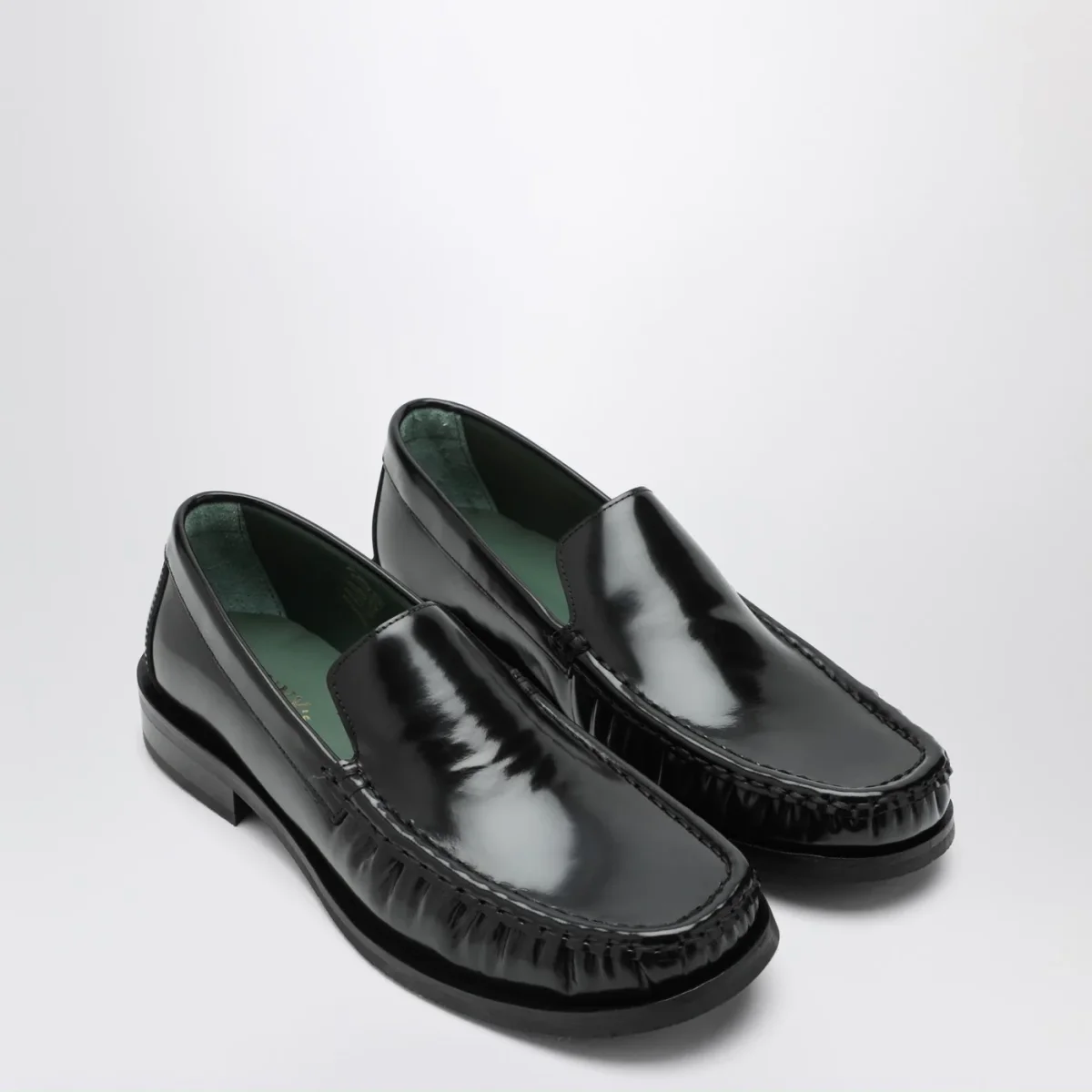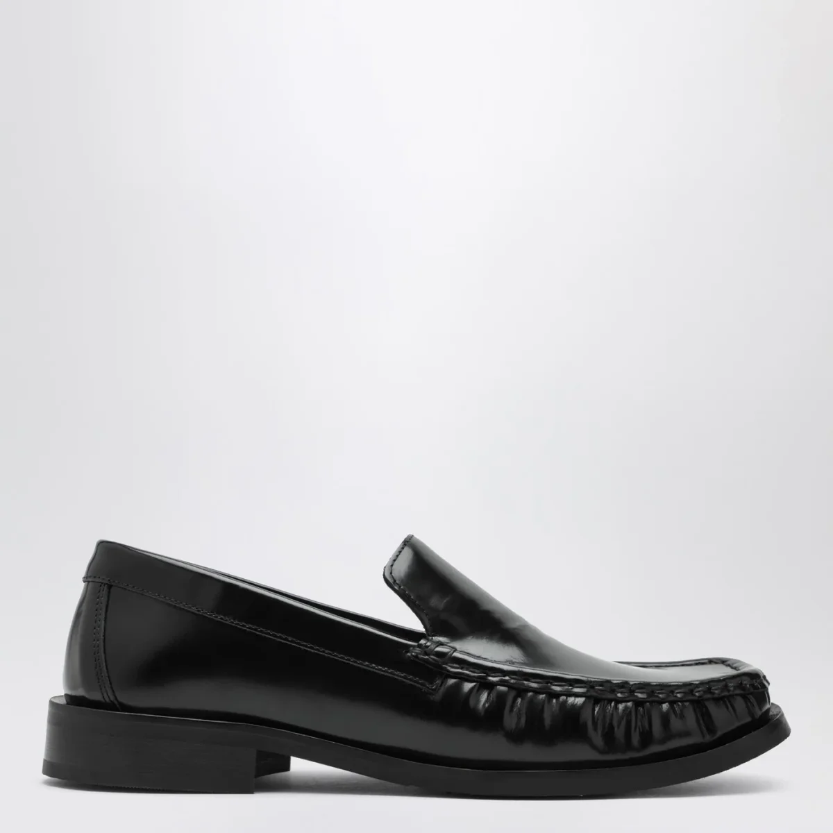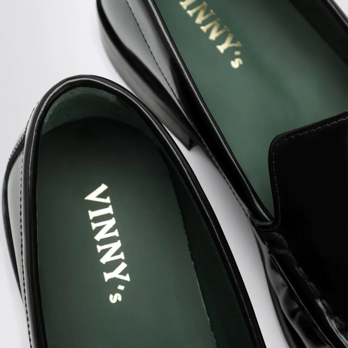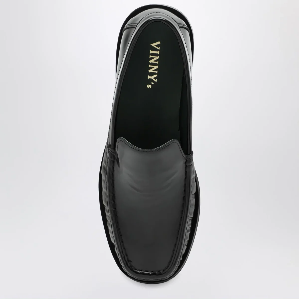 Mocassini di Vinny’s in pelle lucida nera, caratterizzati da punta squadrata con arricciature e suola in gomma.