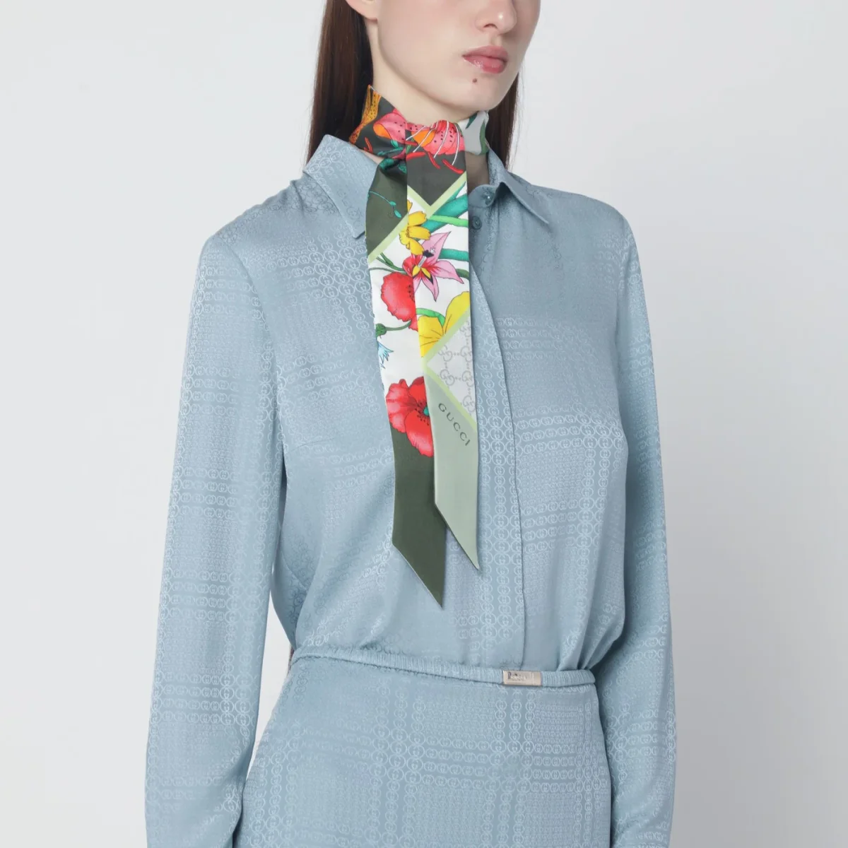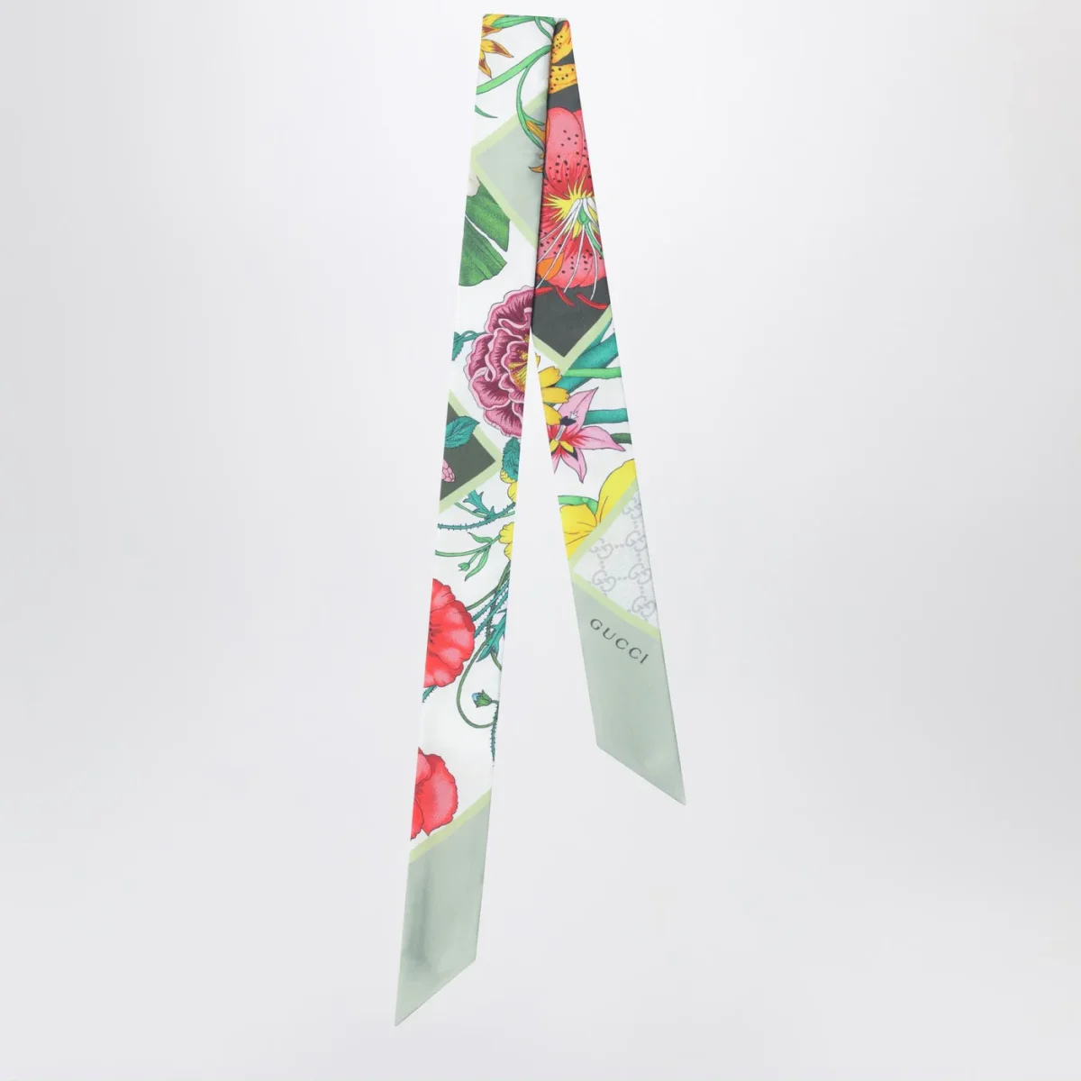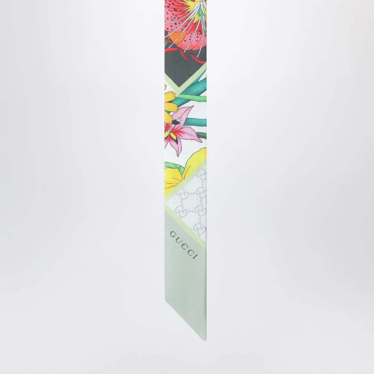 Nastro di Gucci in seta verde oliva• stampa Flora multicolore• dettaglio logo