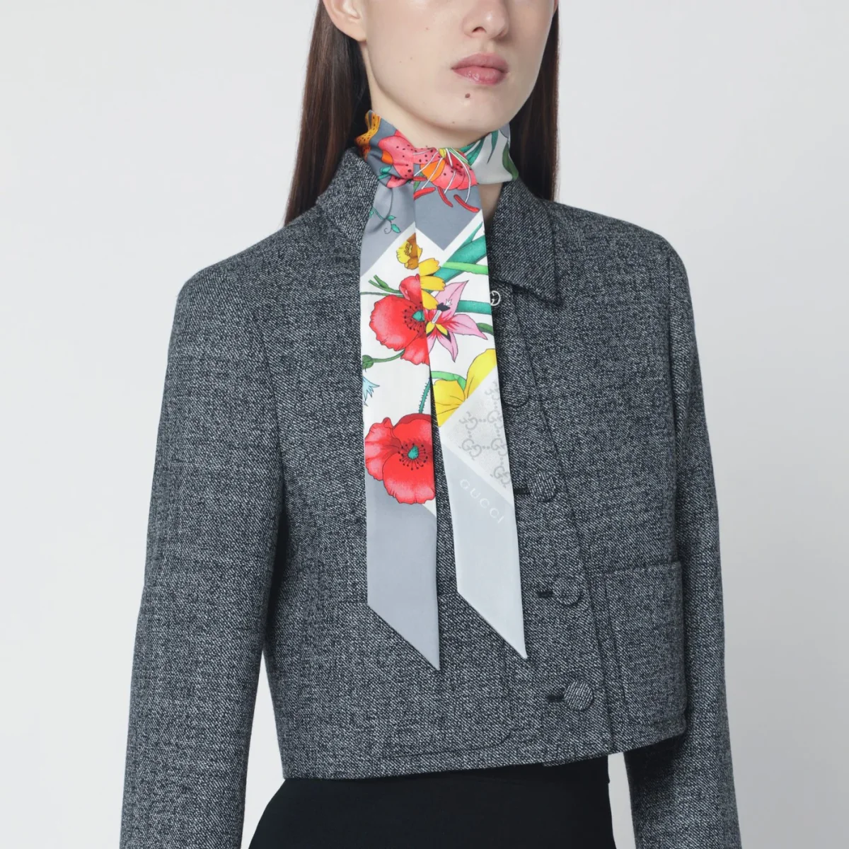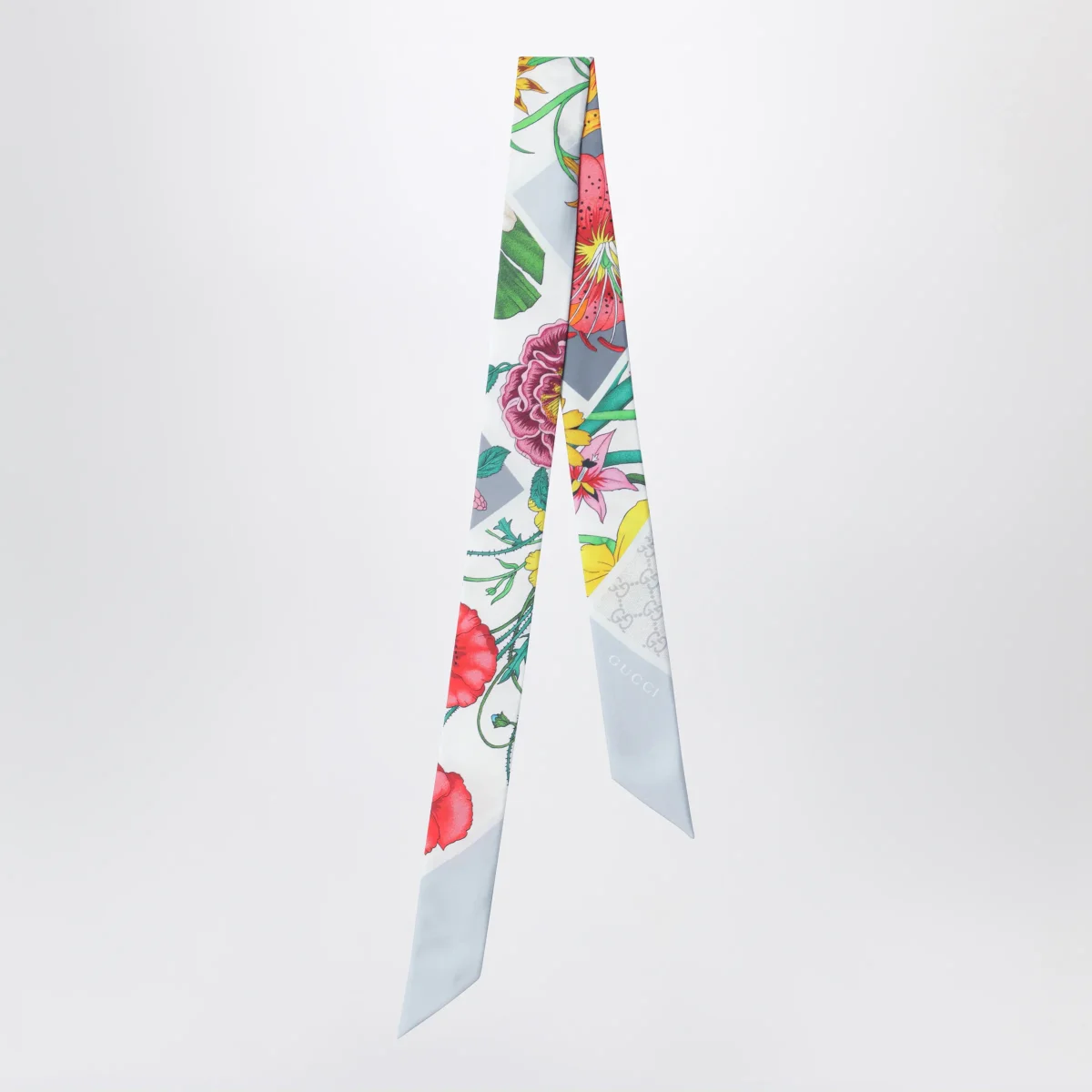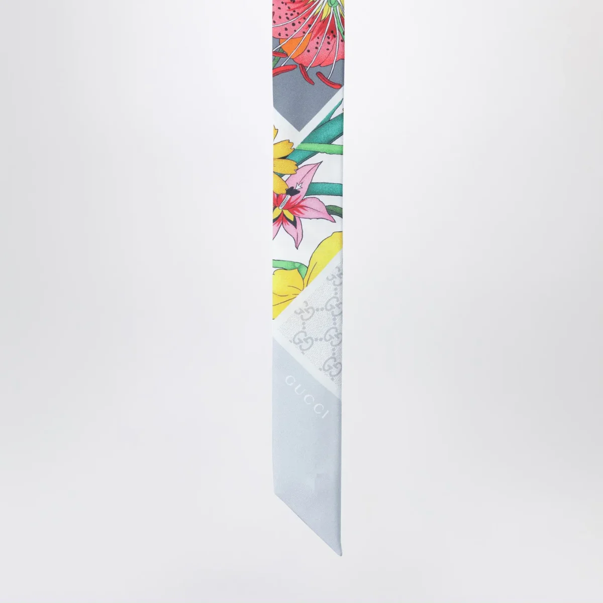 Nastro di Gucci in seta grigia• stampa Flora multicolore• dettaglio logo