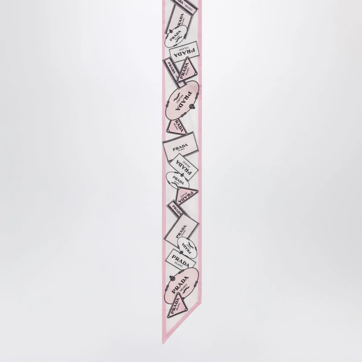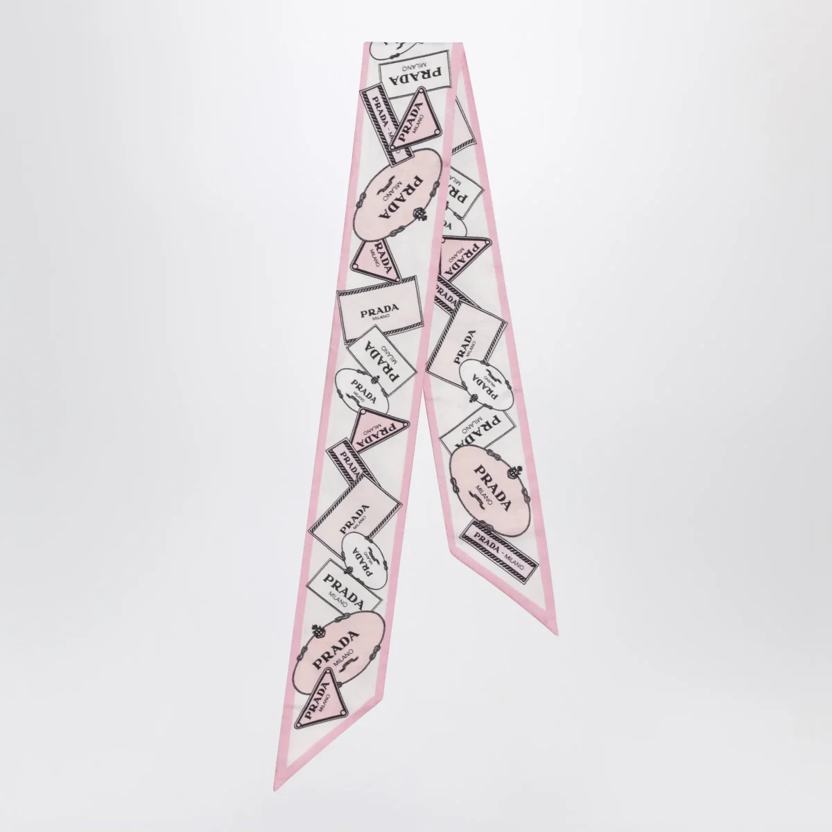Nastro di Prada in twill di seta rosa con stampa Heritage con loghi lettering all over a contrasto