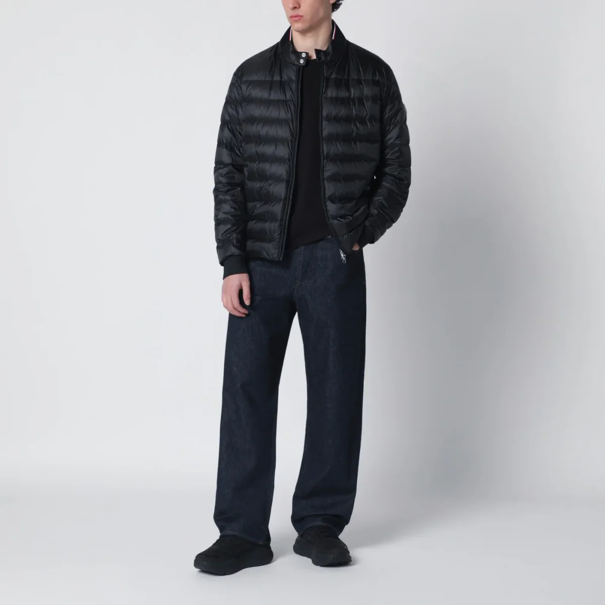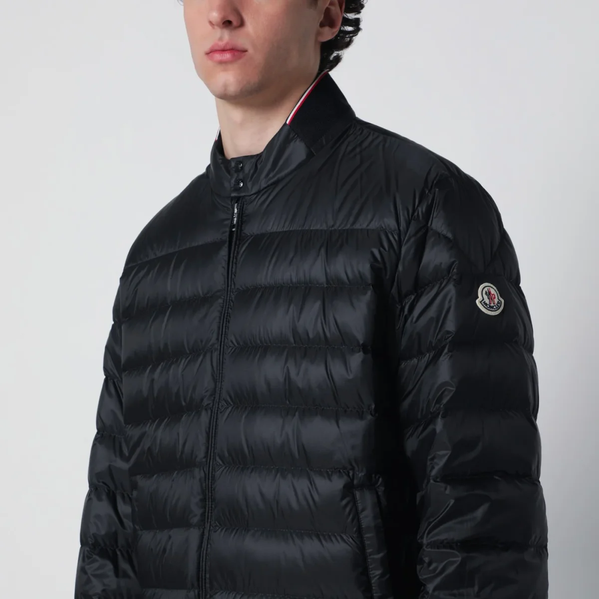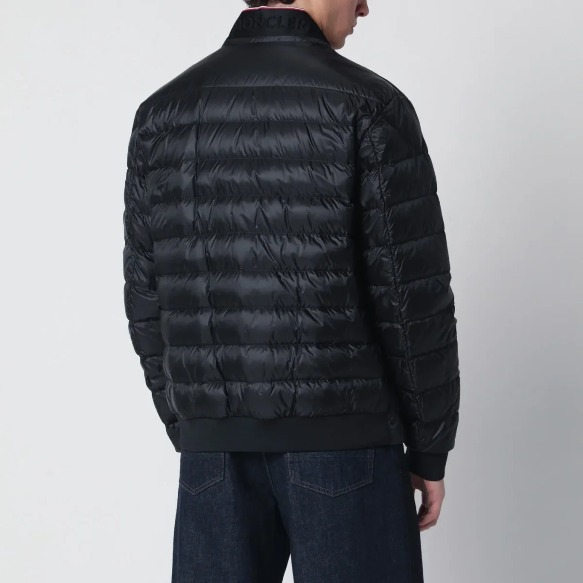 Piumino di Moncler realizzato in micro ripstop nero• collo con finiture tricolore• chiusura con zip• bottoni automatici sul collo• tasche laterali• tasca interna con zip• polsini con lavorazione a costine