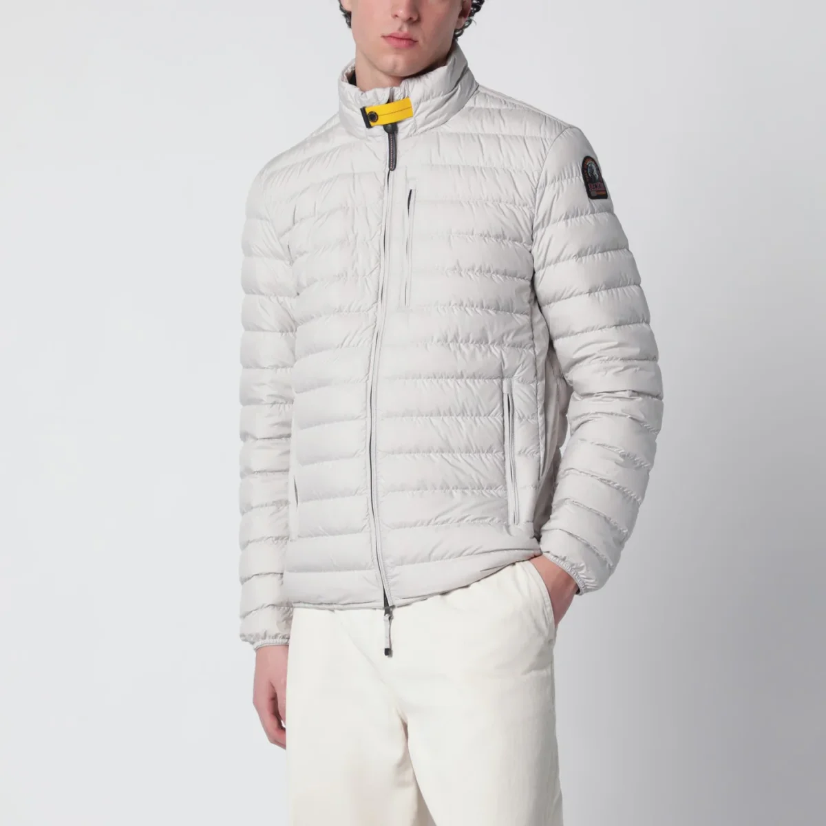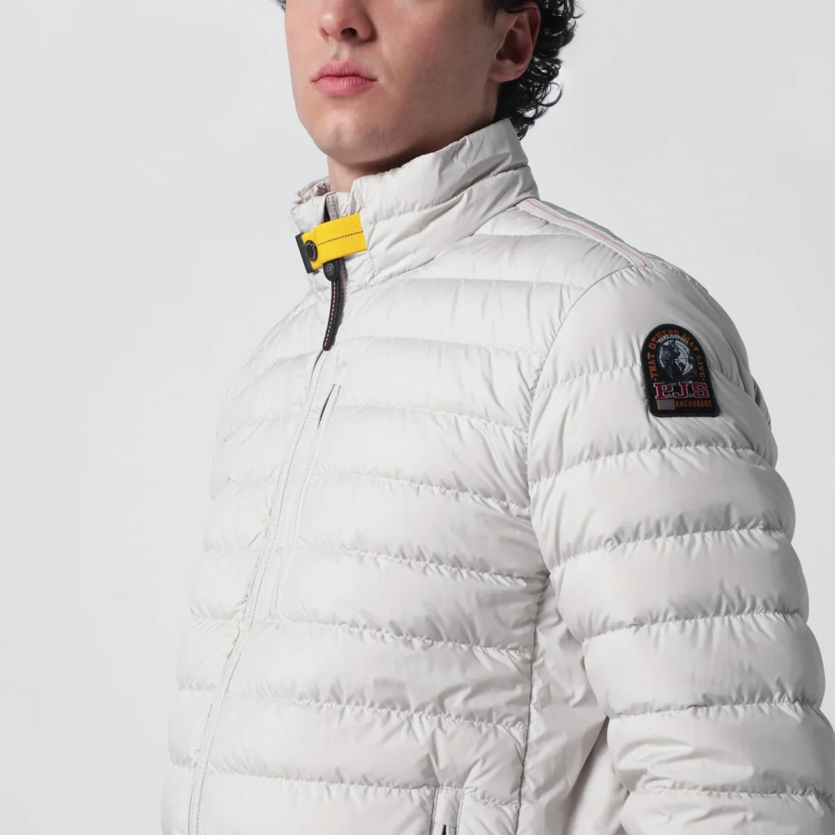 Piumino corto trapuntato di Parajumpers in taffetà di poliestere dalla finitura opaca con trattamento idrorepellente color Pelican• chiusura frontale con doppia zip• tre tasche con zip• una tasca interna con velcro• fondo e polsini elastici• maniche lunghe di cui una con patch logo• collo rialzato con fettuccia elastica gialla