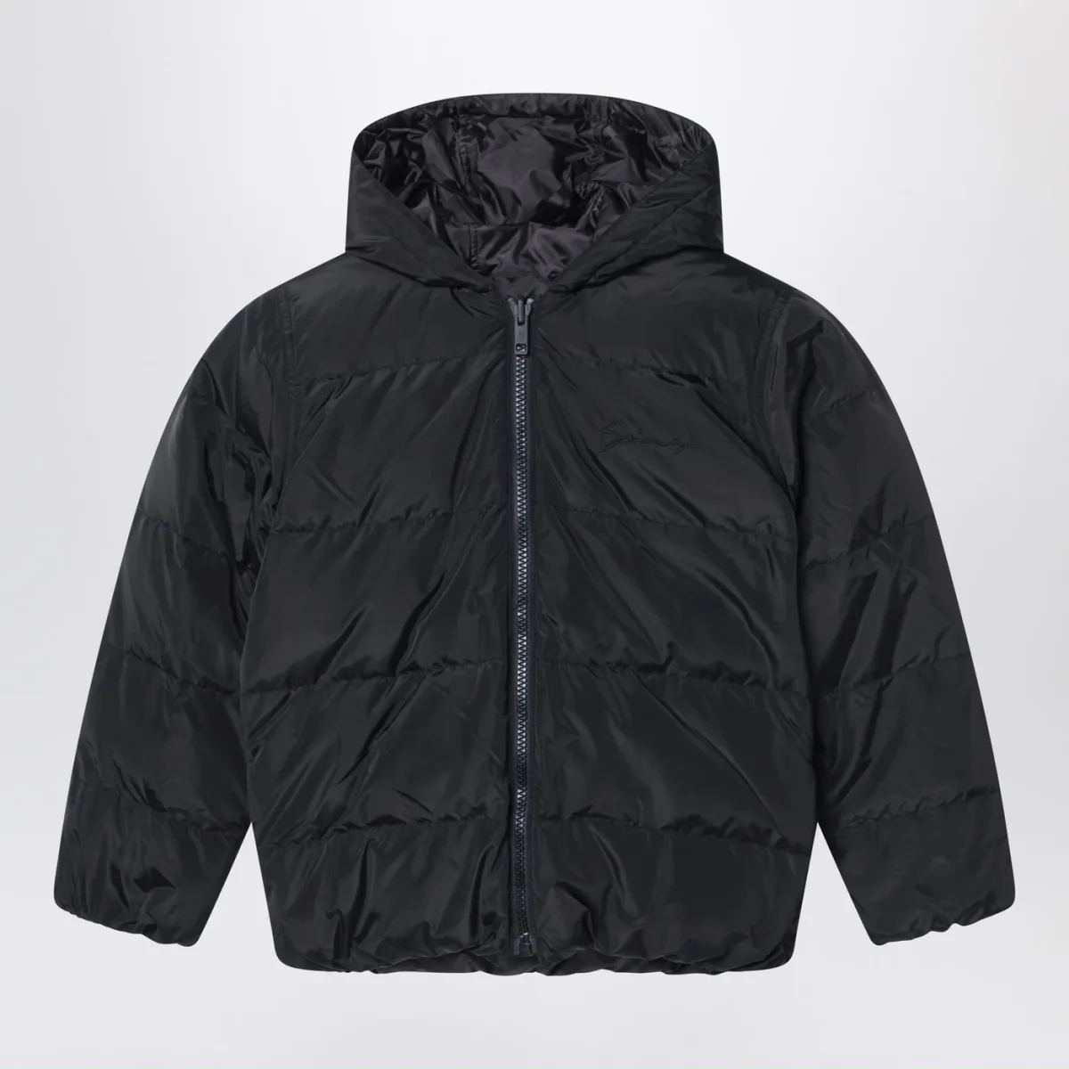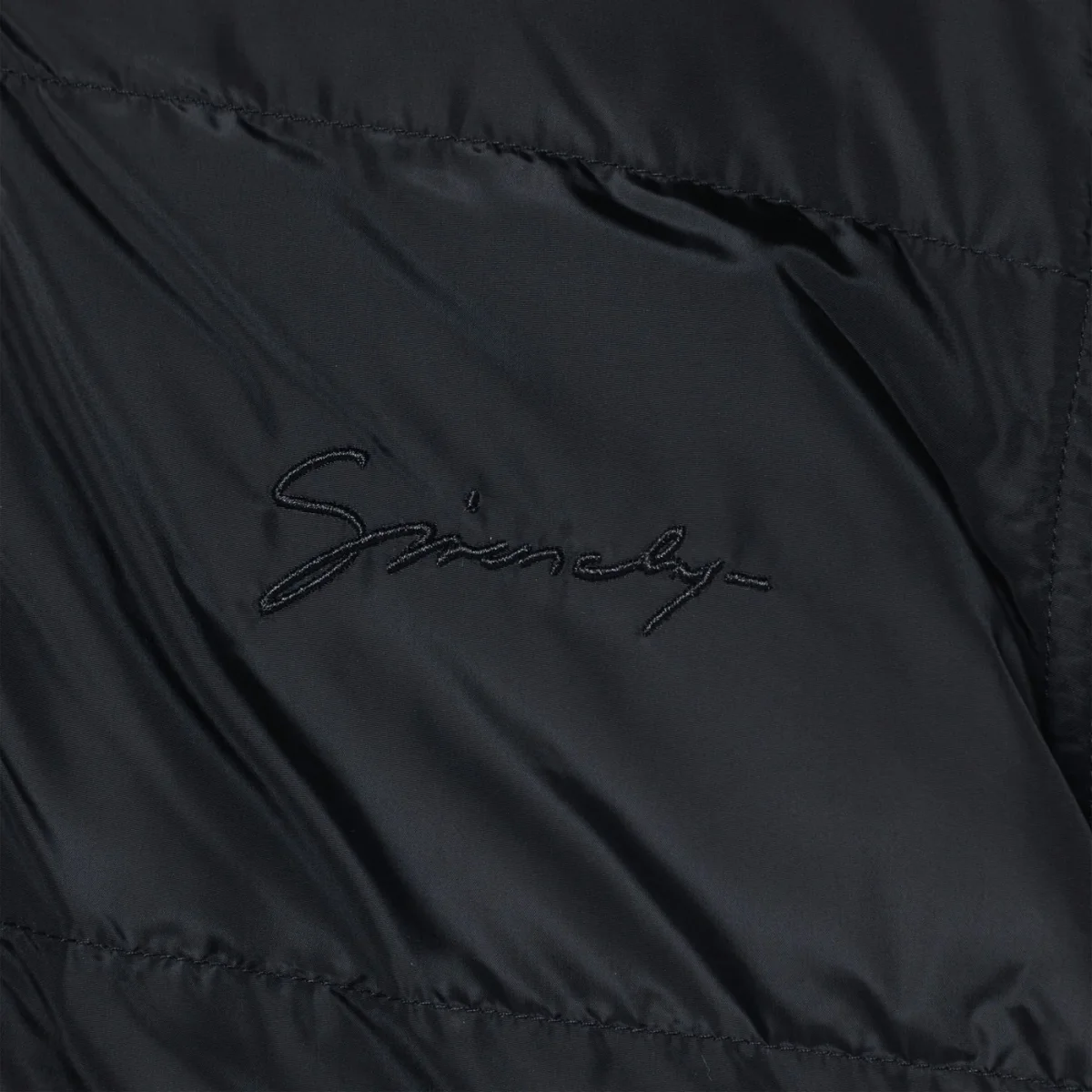Piumino di Givenchy in nylon imbottito e trapuntato nero, caratterizzato da chiusura frontale con zip, cappuccio oversize e dettaglio con logo sul retro.