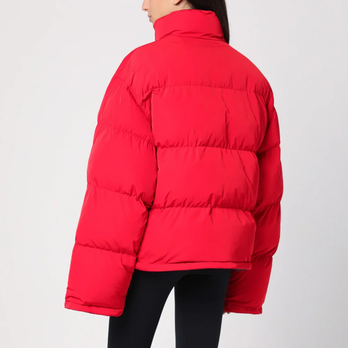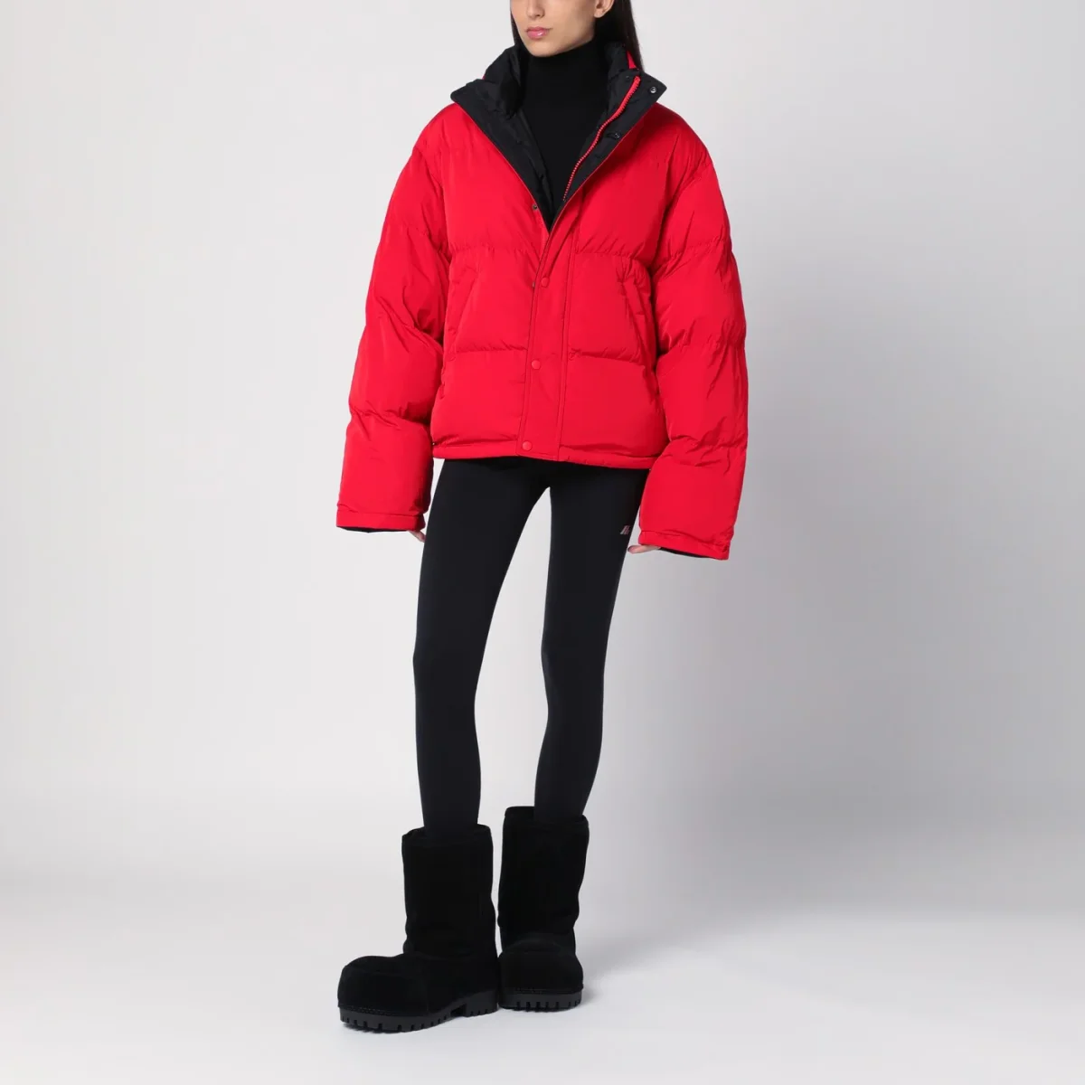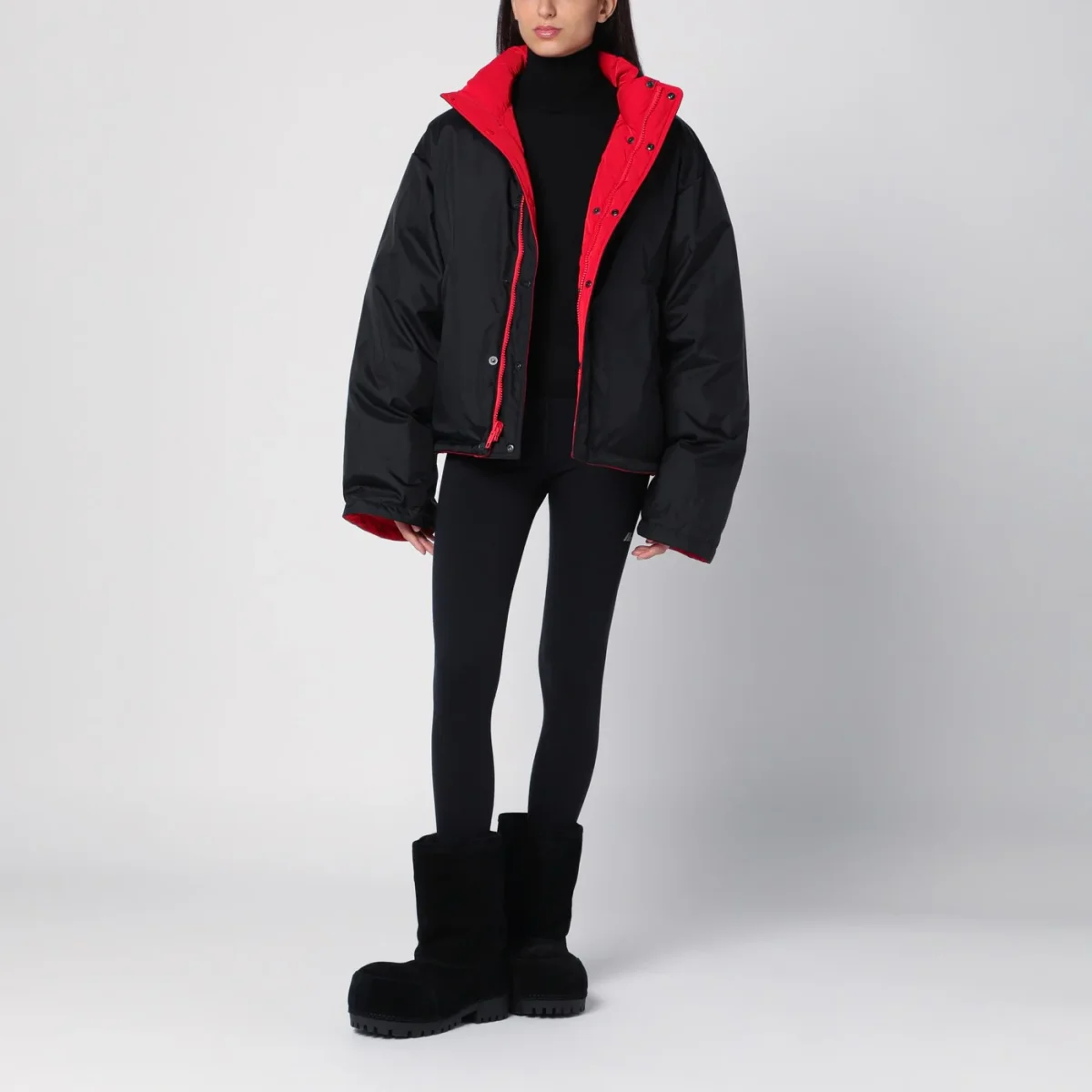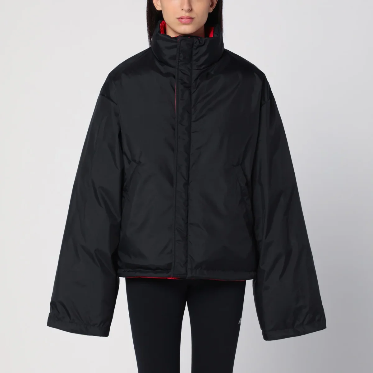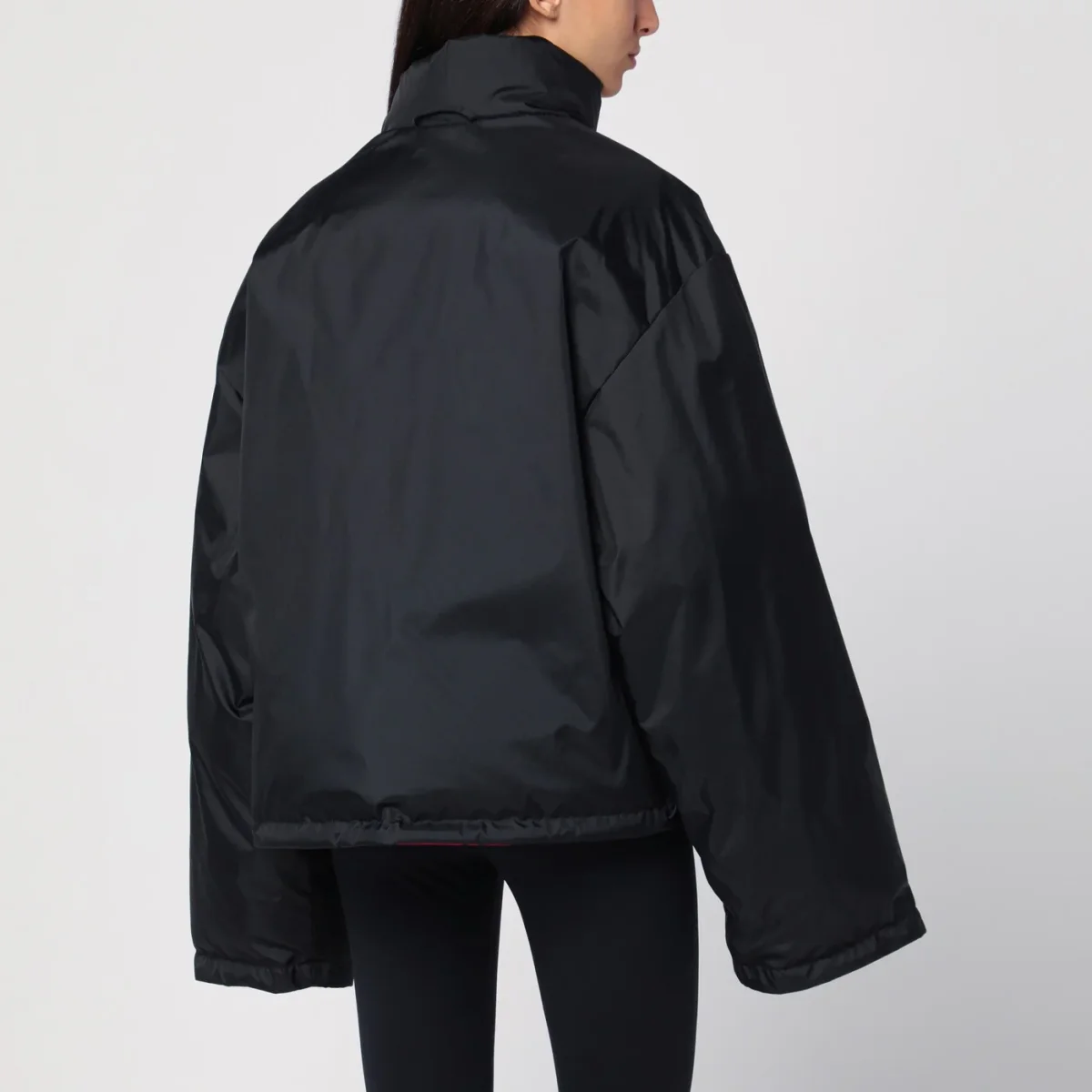 Piumino imbottito di Balenciaga in twill tecnico e nylon nero e rosso, caratterizzato da collo alto, chiusura con bottoni a pressione e zip frontale, manica lunga ampia, design reversibile e due tasche a filetto sul davanti.