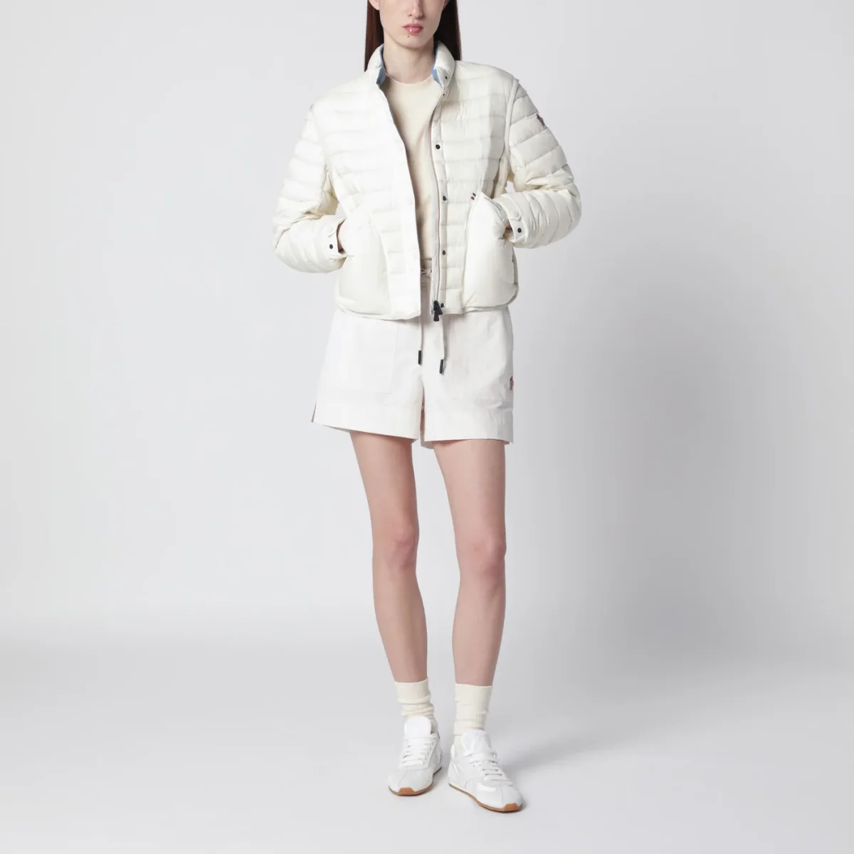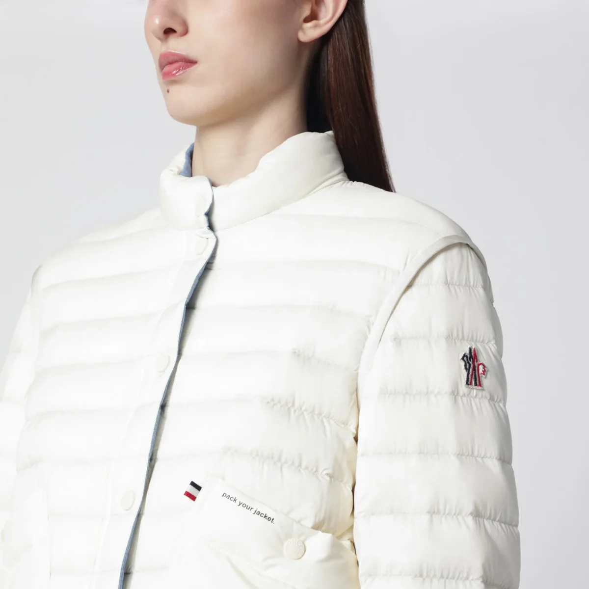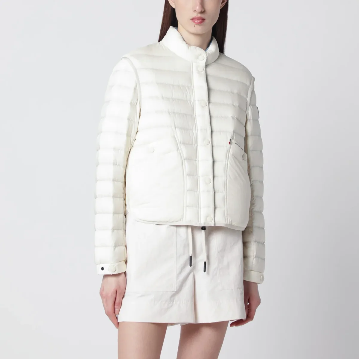Piumino corto di Moncler Grenoble in longue saison idrorepellente bianco avorio• Fodera in poliestere• Design ripiegabile• Collo interno in chambray• Chiusura frontale con zip• Bottoni automatici• Due tasche con bottone automatico sul davanti• Maniche lunghe di cui una con patch logo• Polsini regolabili• Dettagli logati stampati e riflettenti