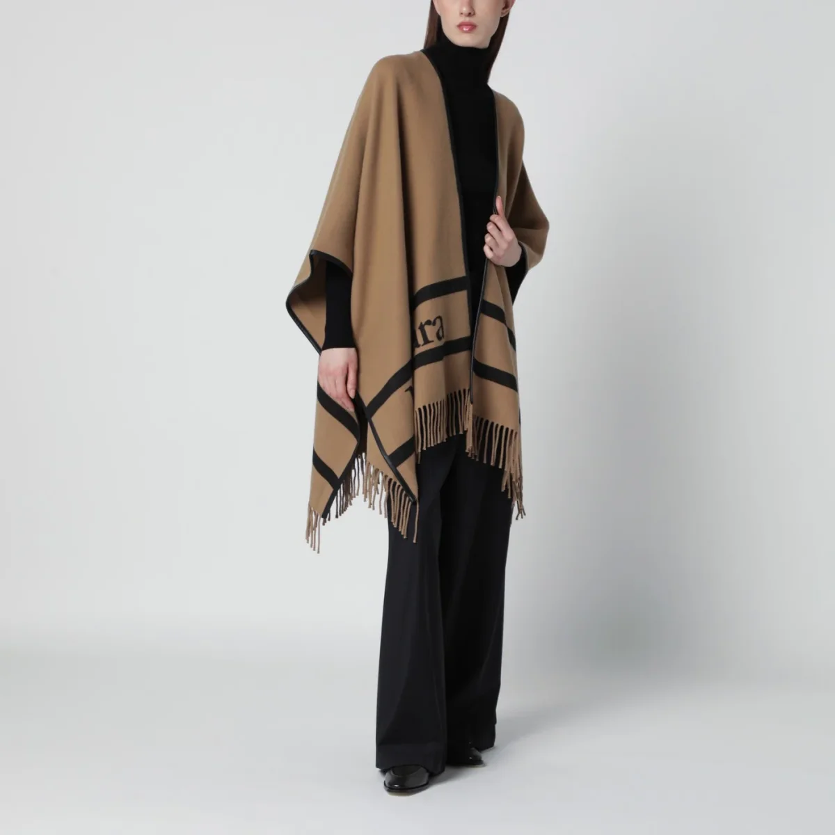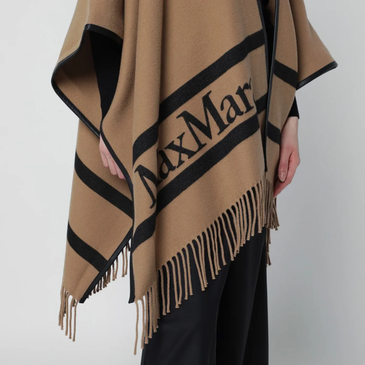 Poncho di Max Mara in lana color cammello• Profili in pelle• Logo lettering in jacquard a contrasto• Bordo con frange