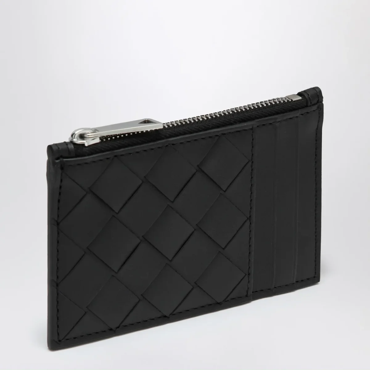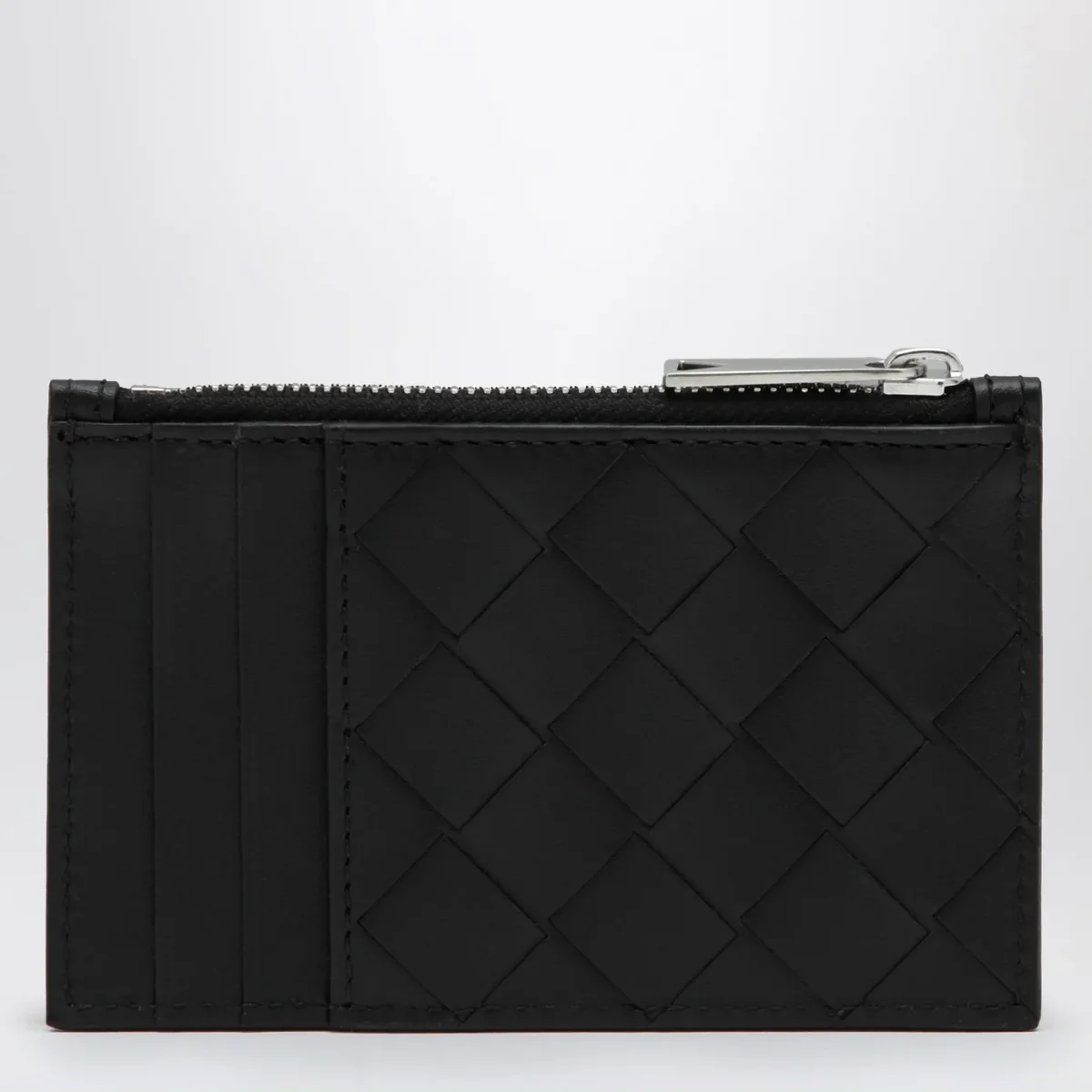 Portacarte di Bottega Veneta in pelle nera con motivo Intrecciato, caratterizzato da sei slot per carte di credito, una tasca con zip ed elementi metallici con finitura argento.