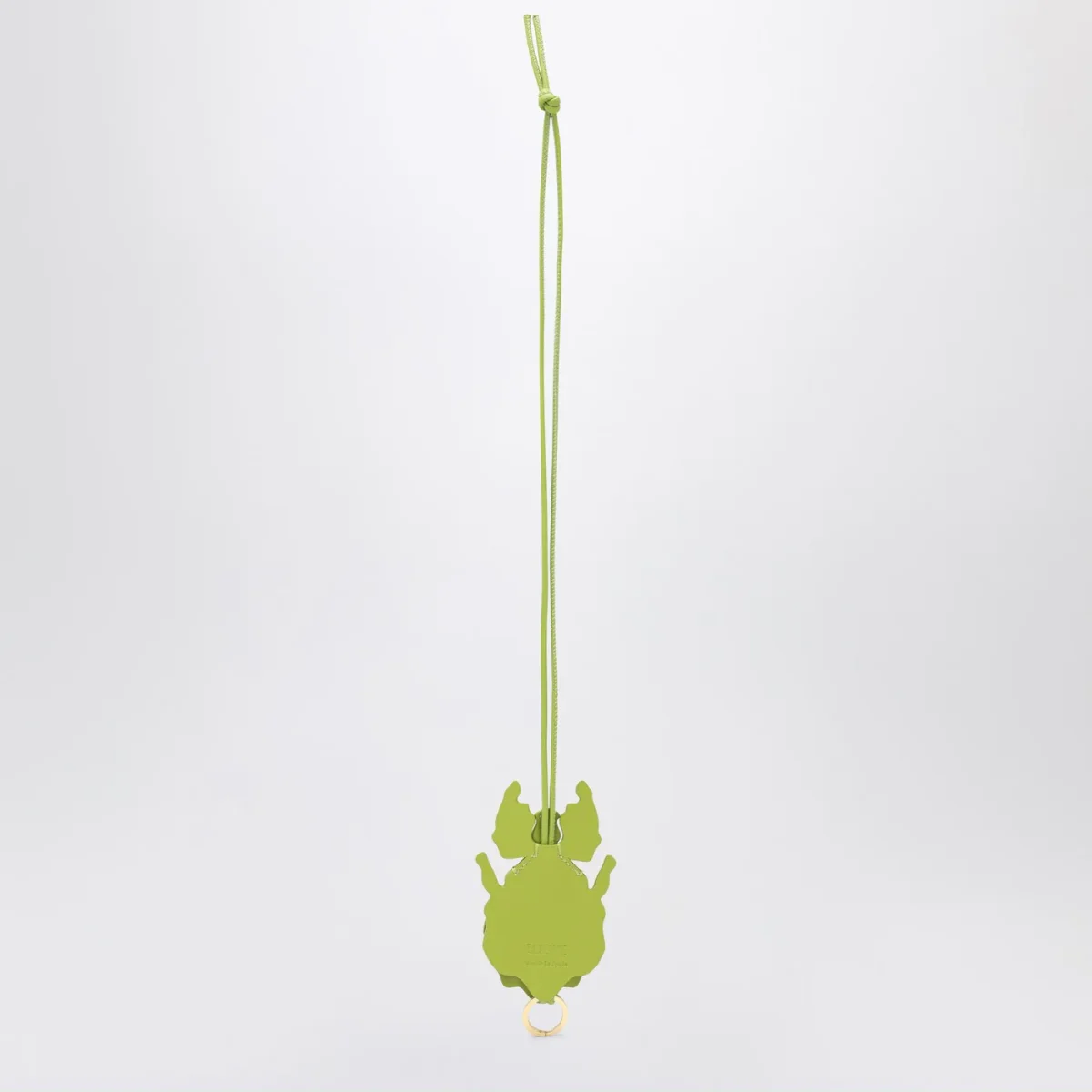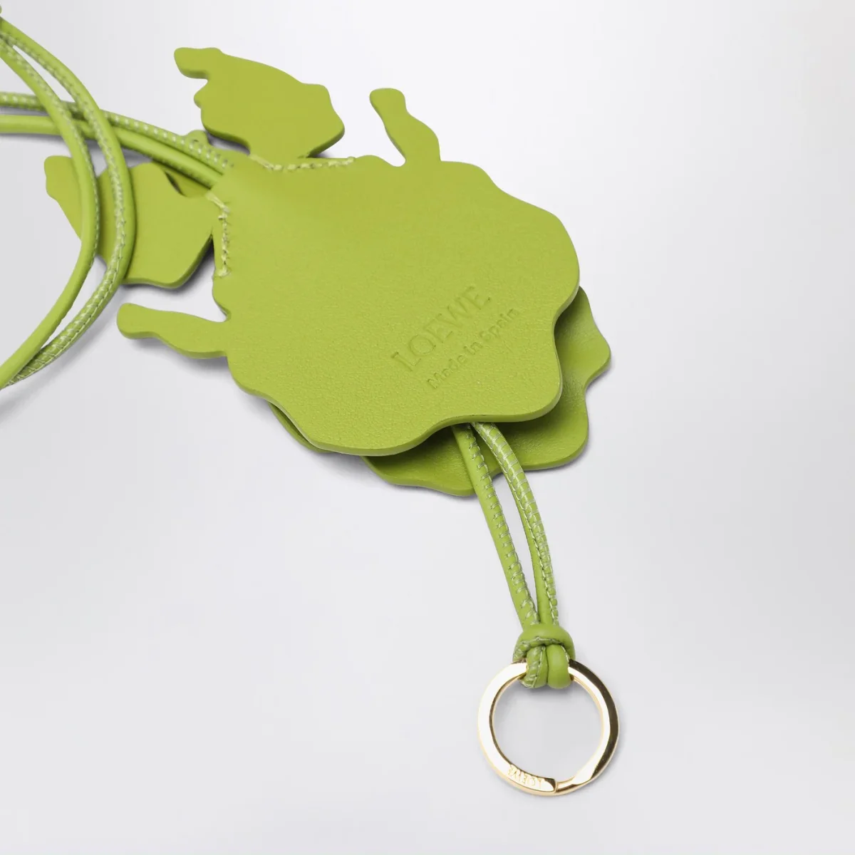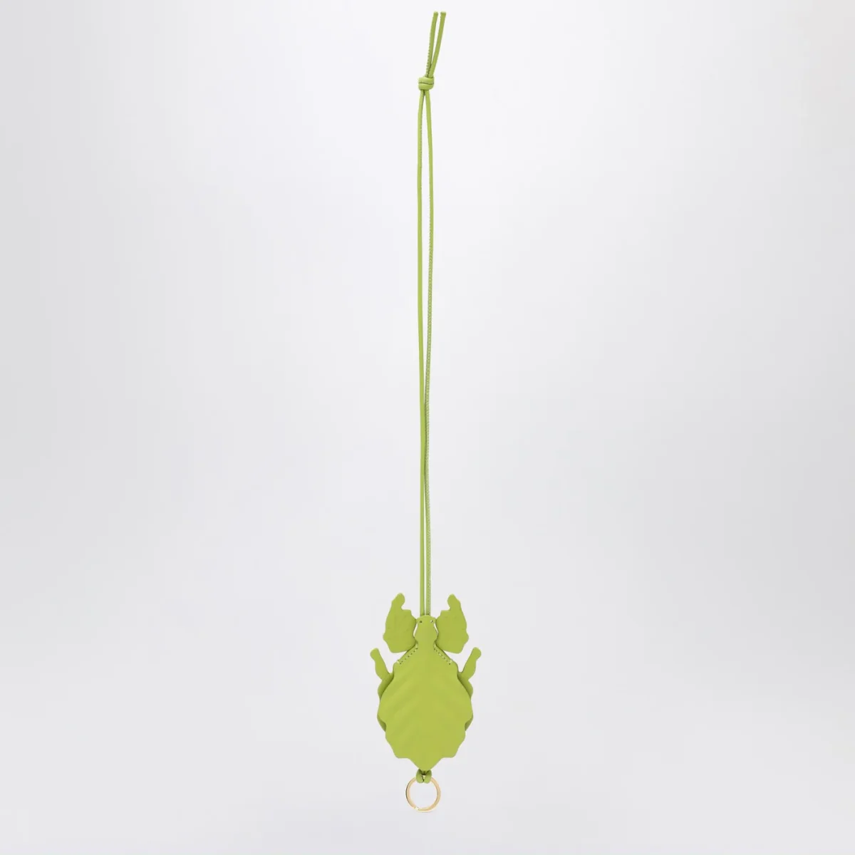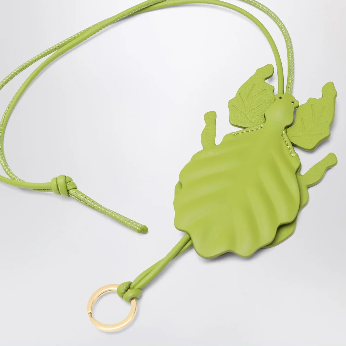 Portachiavi di Loewe a forma di insetto foglia in pelle di vitello verde brillante, con cinturino ad anello dorato.