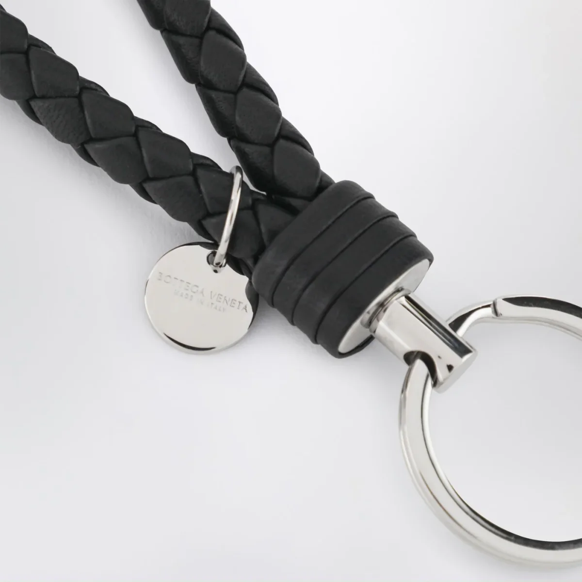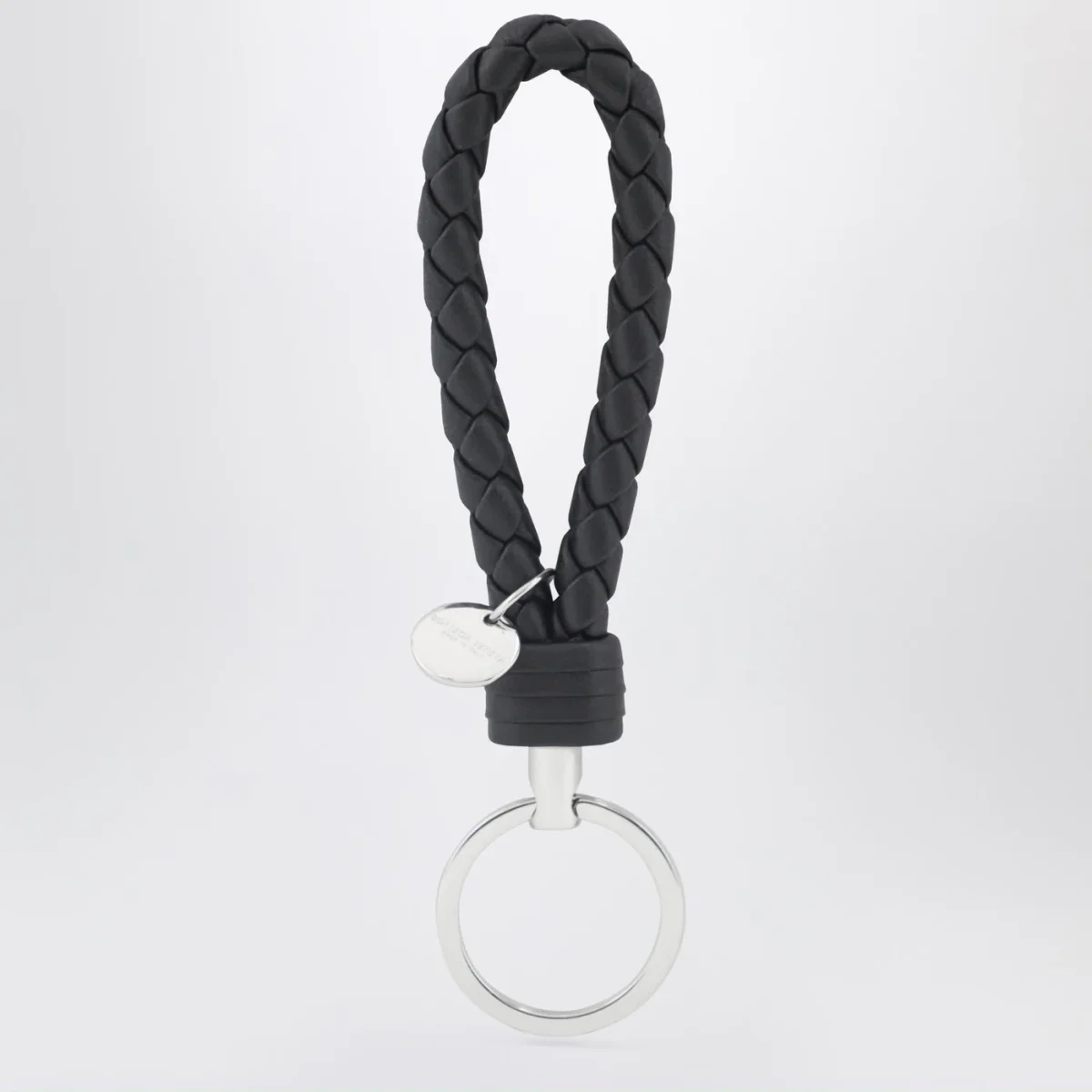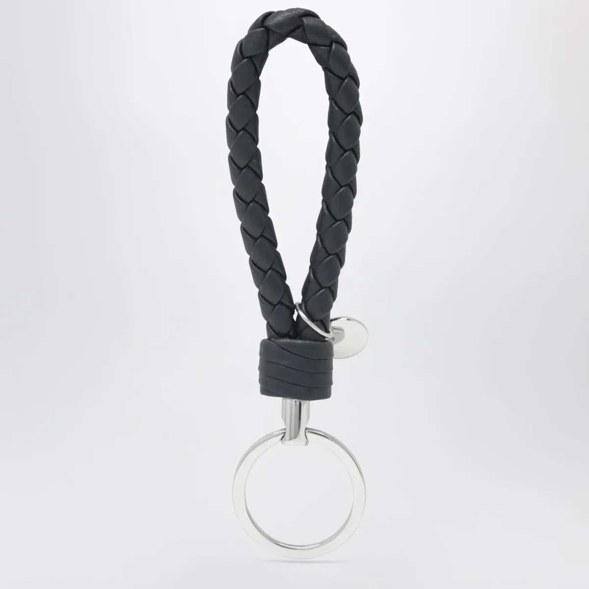 Portachiavi di Bottega Veneta in nappa blu con lavorazione in Intrecciato, anello e medaglietta con logo in metallo con finitura argento.