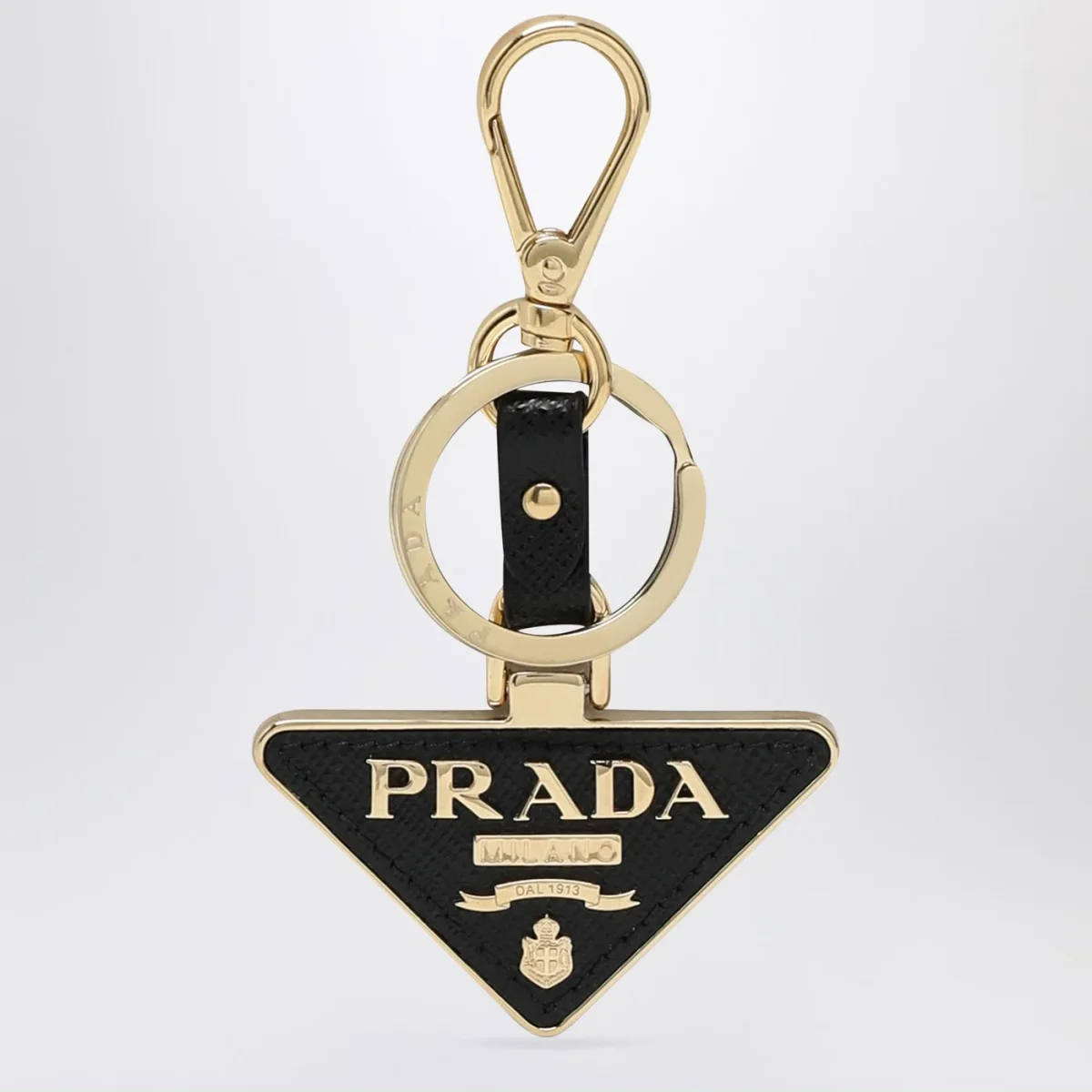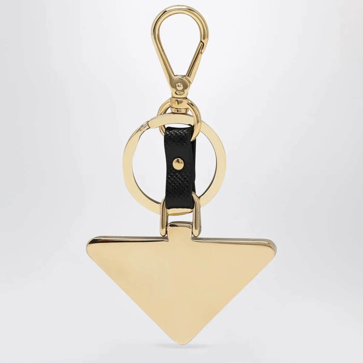 Portachiavi di Prada in metallo dorato con finiture in pelle nera, caratterizzato da triangolo logo, anello e moschettone.