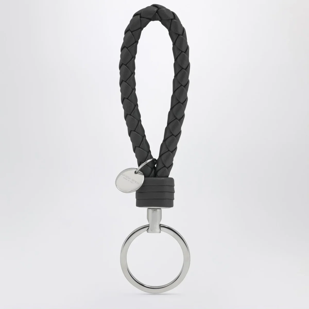 Portachiavi di Bottega Veneta in nappa grigio con lavorazione in Intrecciato, anello e medaglietta con logo in metallo con finitura argento.