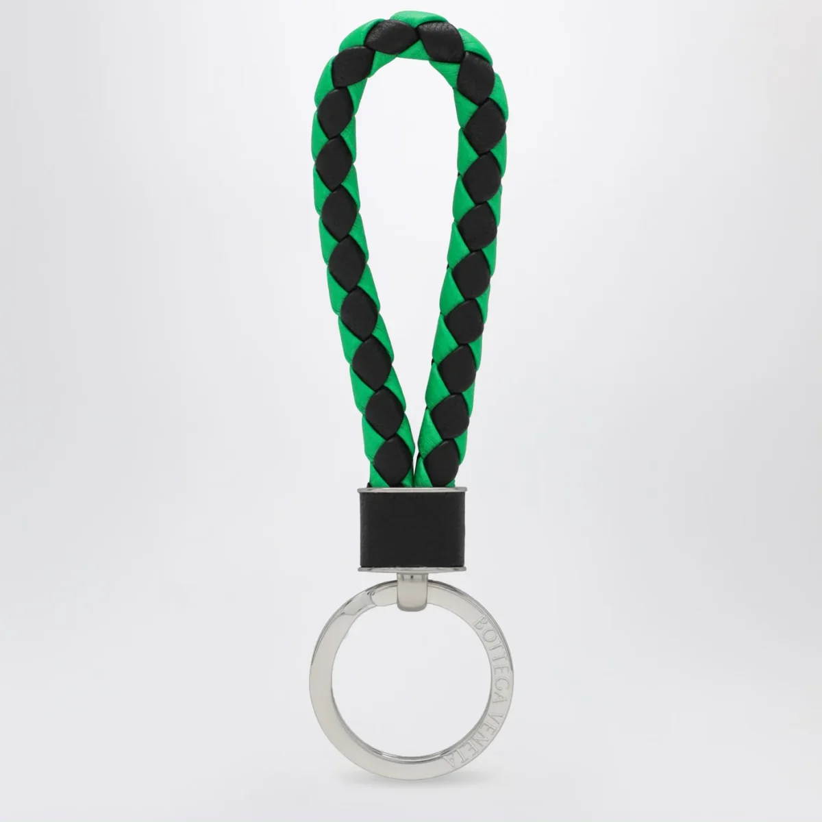Portachiavi di Bottega Veneta in pelle nero e verde Parakeet motivo Intrecciato ed elementi metallici con finitura argento.