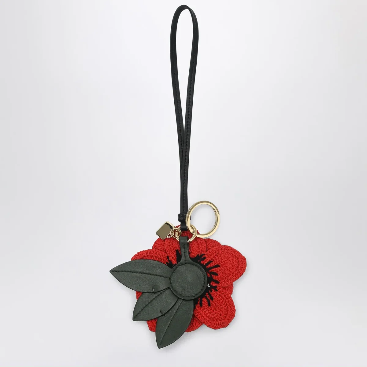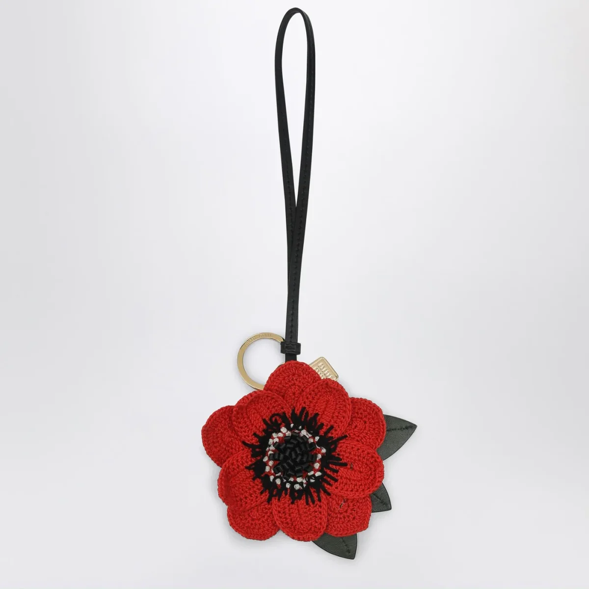 Portachiavi di Miu Miu pelle con fiore rosso in tessuto crochet, anello metallico e charm logo metallico con finitura oro.