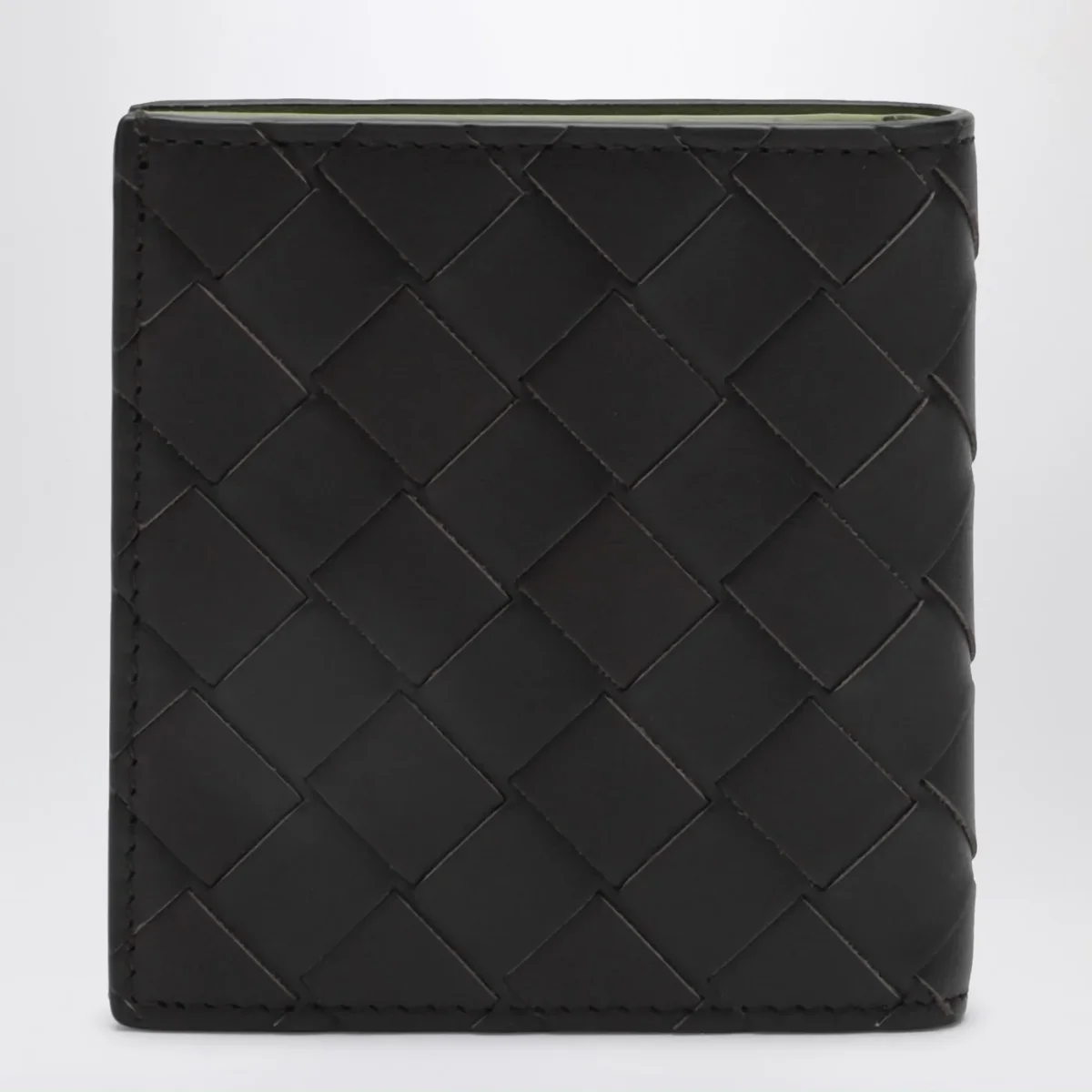 Portafoglio bi-fold di Bottega Veneta in pelle di vitello con motivo Intrecciato color marrone scuro, caratterizzato interno a contrasto color verde Macha, sei slot per carte, uno scomparto per banconote e due ulteriori tasche.